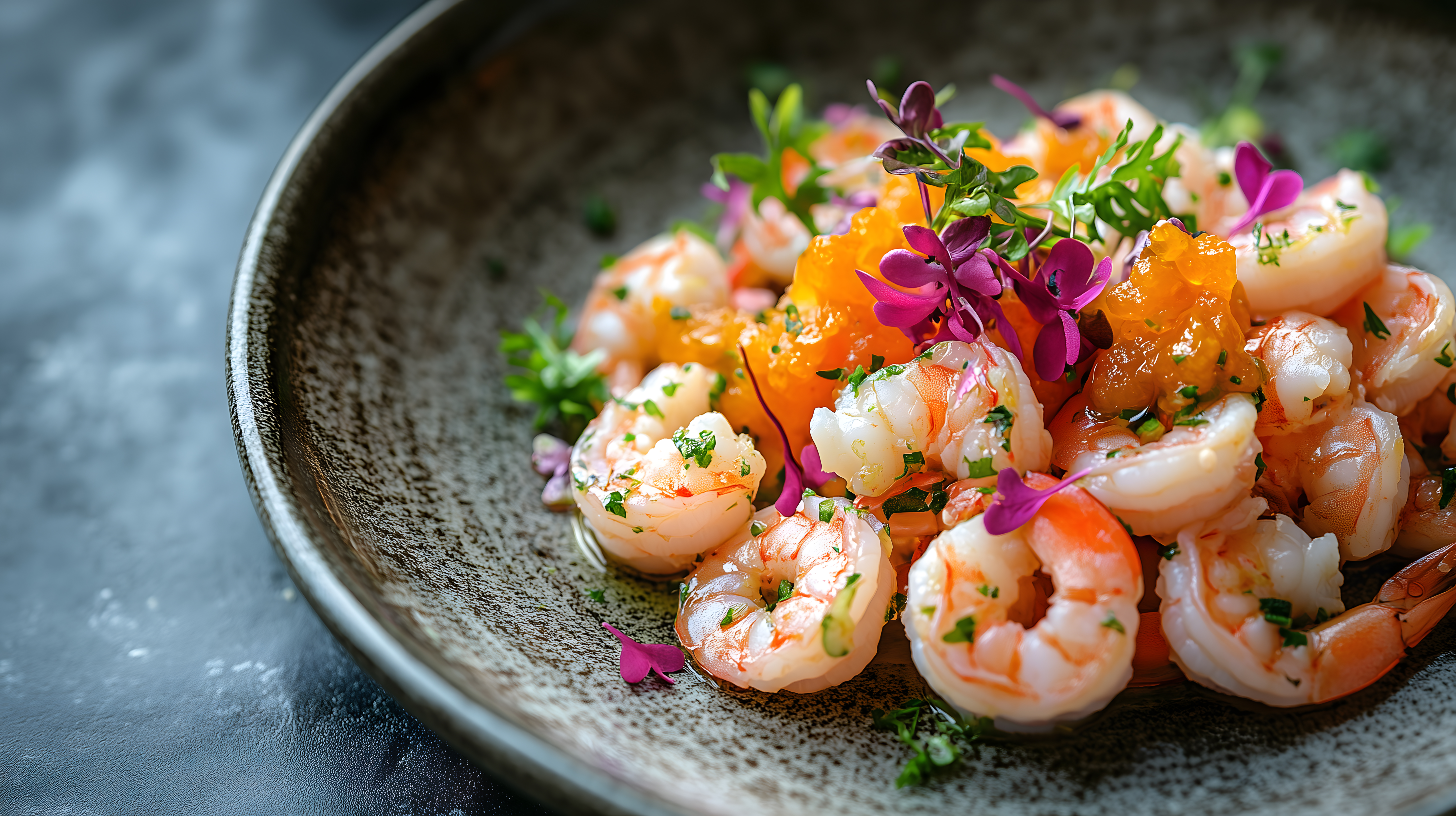 Dieses appetitanregende Foto zeigt einen sommerlichen Garnelensalat, angerichtet in einer rustikalen Schale. Die Garnelen sind mit frischen Zitrusfrüchten, Kräutern und farbenfrohen Blüten garniert, was dem Gericht eine leichte, frische und natürliche Optik verleiht. Das Bild eignet sich hervorragend für den Einsatz in Blogs, Newslettern, sozialen Medien oder Werbematerialien rund um das Thema Kochen, Ernährung und Lifestyle. Als kostenloses, hochaufgelöstes Stockfoto unter Creative-Commons-Lizenz ist es für verschiedenste Zwecke frei nutzbar.