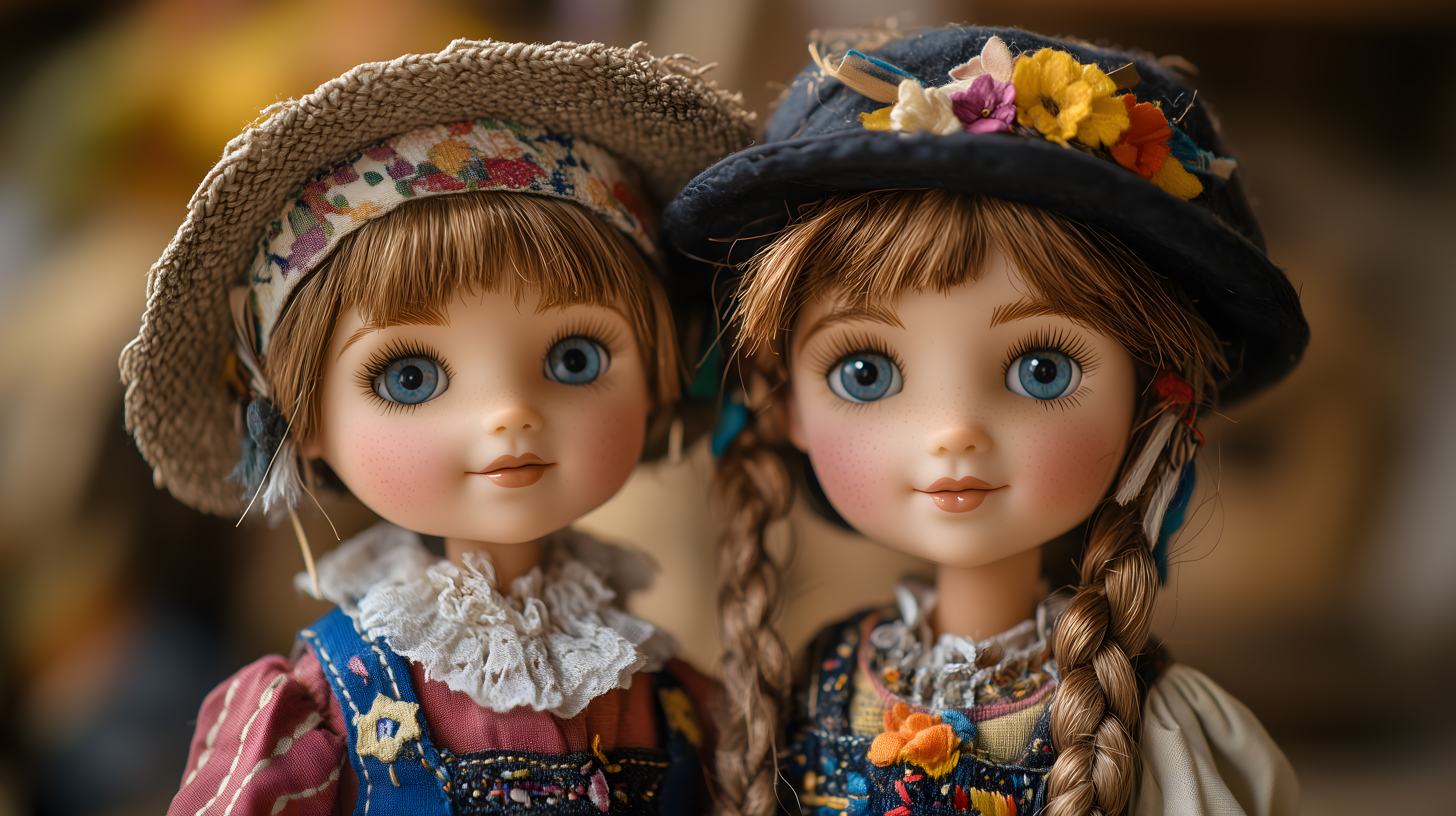 Das Bild zeigt zwei detailliert gestaltete Porzellanpuppen in traditioneller rumänischer Kleidung und Kopfbedeckungen. Die Puppen haben fein geschwungene Gesichtszüge, aufwendig gestaltete Kostüme und farbenfrohe Blumenhüte. Die Komposition ist symmetrisch und betont die Schönheit und Sorgfalt in der Gestaltung dieser Sammlerstücke. Dieses kostbare Stockfoto in hoher Auflösung eignet sich hervorragend für Blogs, Newsletter, Social-Media-Beiträge und Werbematerialien rund um traditionelles Handwerk, Folklore und Dekoratives aus Rumänien. Die Puppen werden unter einer Creative-Commons-Lizenz angeboten.