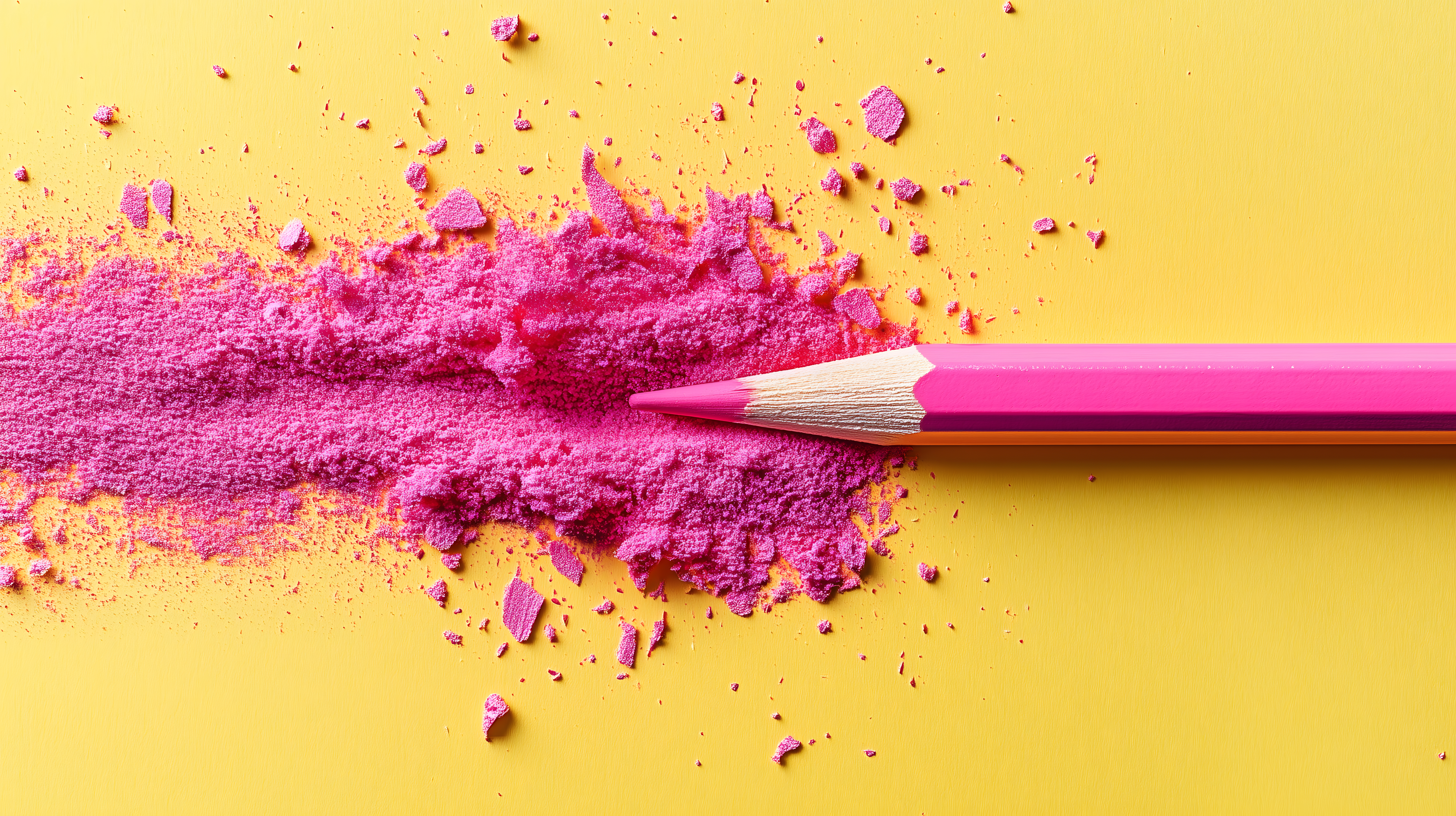 Dieses Foto zeigt einen zerbrochenen rosafarbenen Bleistift, der auf einem gelben Hintergrund liegt. Die zerbrochenen Holzteile und die fein zersplitterten Holzstücke verleihen dem Bild einen modernen, minimalistischen Charakter. Der starke Kontrast zwischen dem kräftigen Rosa und dem leuchtenden Gelb macht das Foto zu einem auffälligen Blickfang. Es eignet sich hervorragend als kostenloses Stockfoto für Blogs, Newsletter, Social-Media-Posts oder Werbematerialien in hoher Auflösung und unter Creative-Commons-Lizenz.