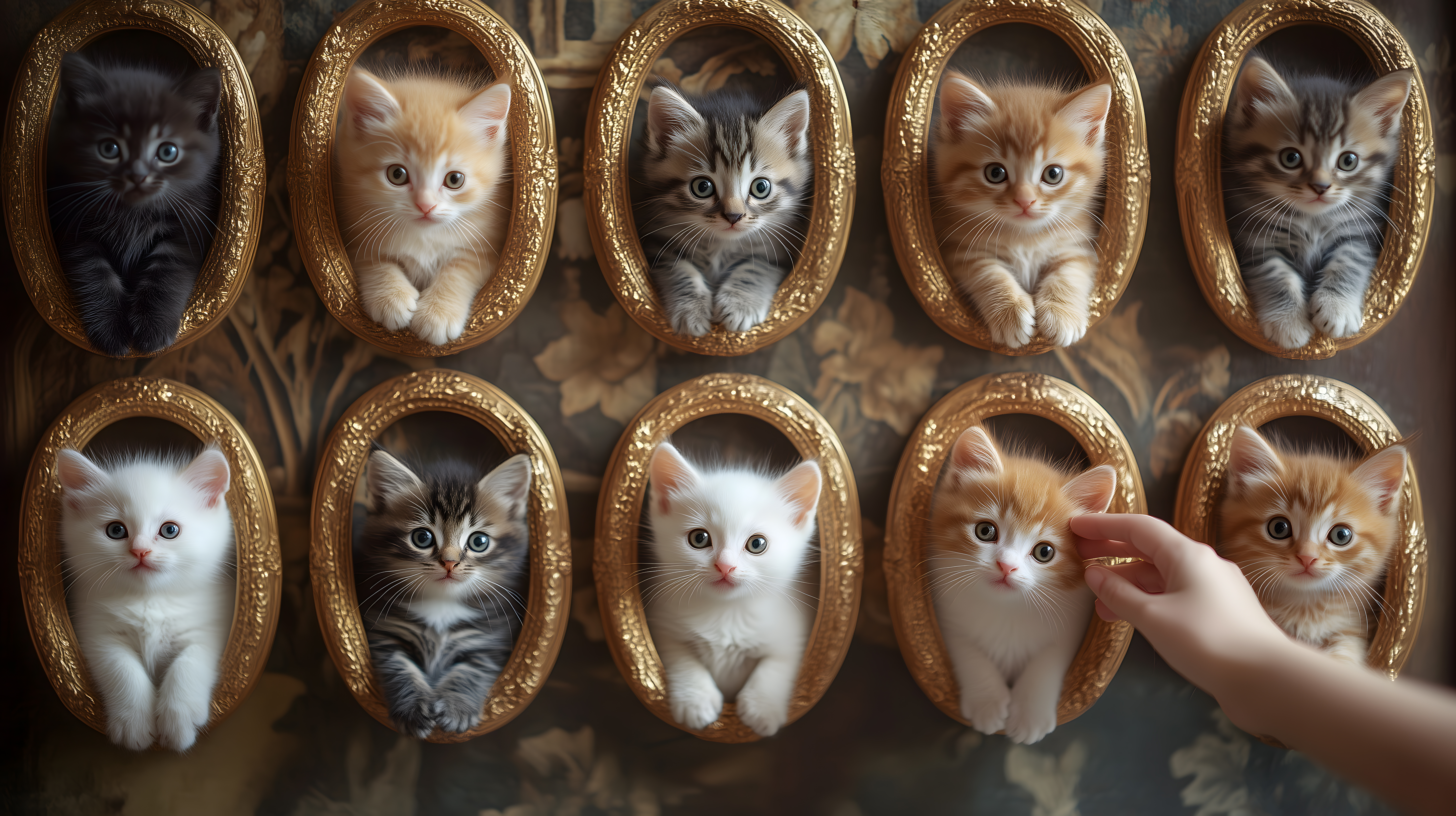 Dieses kreative Stockfoto zeigt eine Ansammlung von zehn entzückenden Katzenbabys, die sich in goldenen, verzierten Bilderrahmen verstecken. Die Kätzchen spielen, schauen neugierig hervor oder blicken direkt in die Kamera, was eine wunderbar verspielt-niedliche Atmosphäre erzeugt. Die Anordnung in mehreren Reihen erinnert an eine Collage und die goldenen Rahmen verleihen dem Bild einen stilvollen, dekorativen Akzent. Dieses hochauflösende Foto in kostenlosen Creative-Commons-Lizenzen eignet sich perfekt für den Einsatz in Blogs, Social-Media-Beiträgen, Newslettern oder Werbematerialien, die ein freundliches, fantasievolles Motiv benötigen.