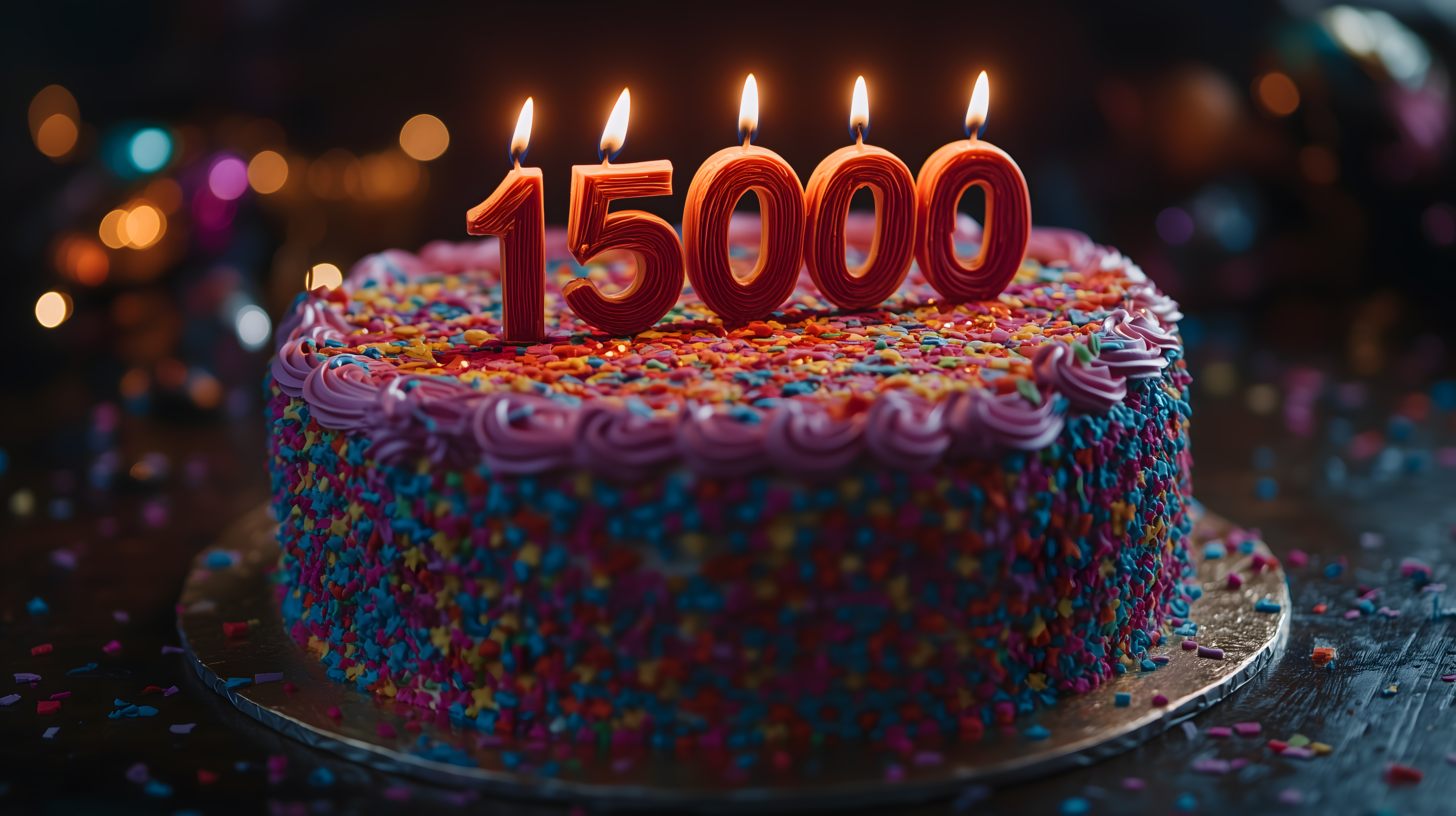Das Bild zeigt eine prachtvolle Geburtstagstorte, die mit einer riesigen, leuchtenden '15000' aus Kerzen geschmückt ist. Die Torte ist mit bunten Streuseln und Rosenblüten überzogen, was eine farbenfrohe und feierliche Atmosphäre erzeugt. Die satte Beleuchtung der Kerzen lässt das Motiv stimmungsvoll erscheinen und verleiht dem Foto eine intensive, fast magische Wirkung.