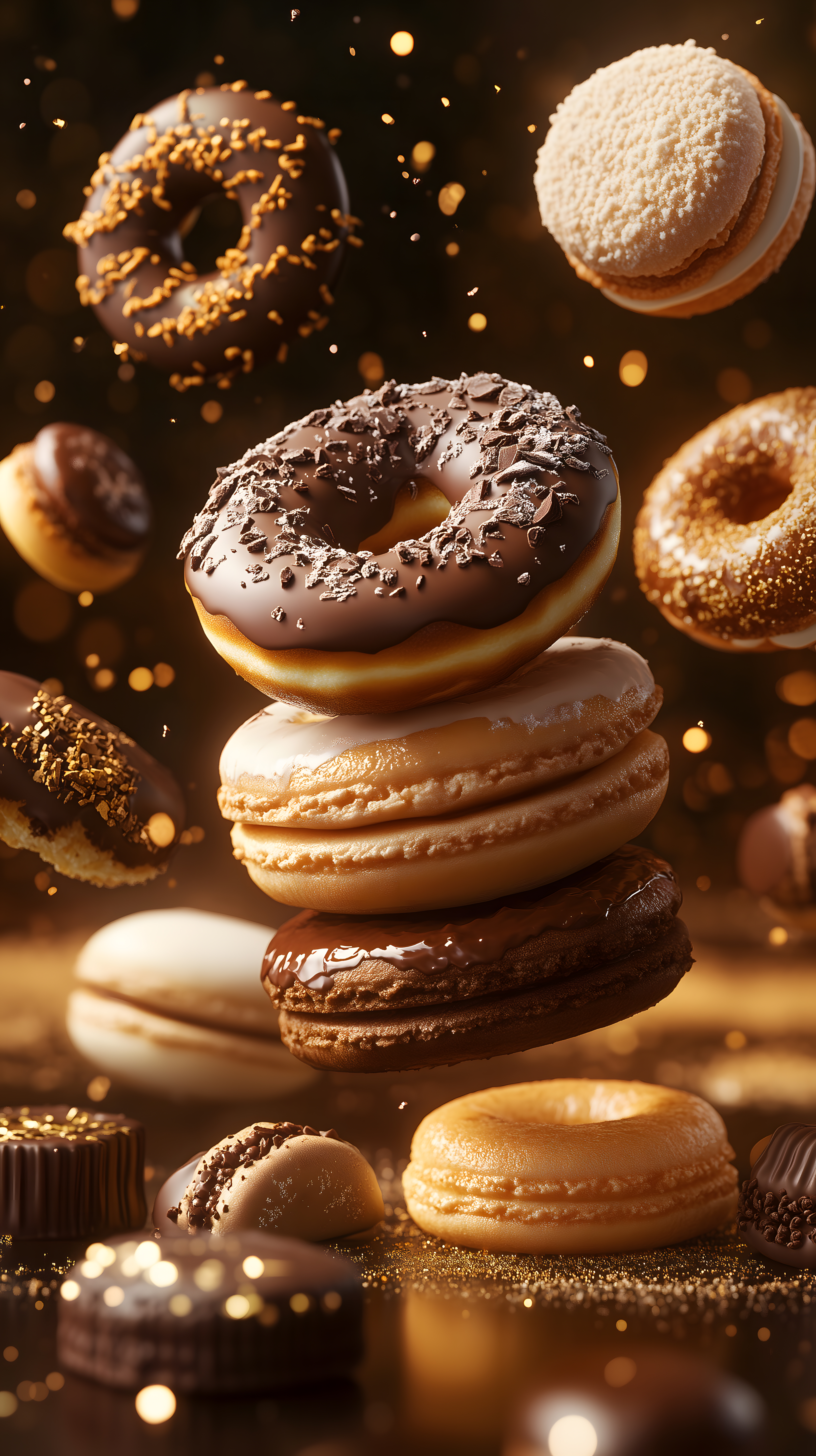 Dieses üppig inszenierte Produktfoto zeigt eine Auswahl an delikaten Donuts und Makronen, die in einem warmen, goldenen Licht schweben. Die Süßwaren sind kunstvoll angeordnet und mit glänzender Schokolade, Puderzucker und anderen Dekorationen versehen. Der Fokus liegt auf den verlockenden Texturen und Farben, die den Betrachter zum Genießen einladen. Dieses hochauflösende Stockfoto eignet sich hervorragend für den Einsatz in Blogs, Social-Media-Beiträgen oder Werbematerialien rund um das Thema Backen, Desserts und Kulinarik. Es steht unter einer Creative-Commons-Lizenz zur kostenlosen Verwendung zur Verfügung.