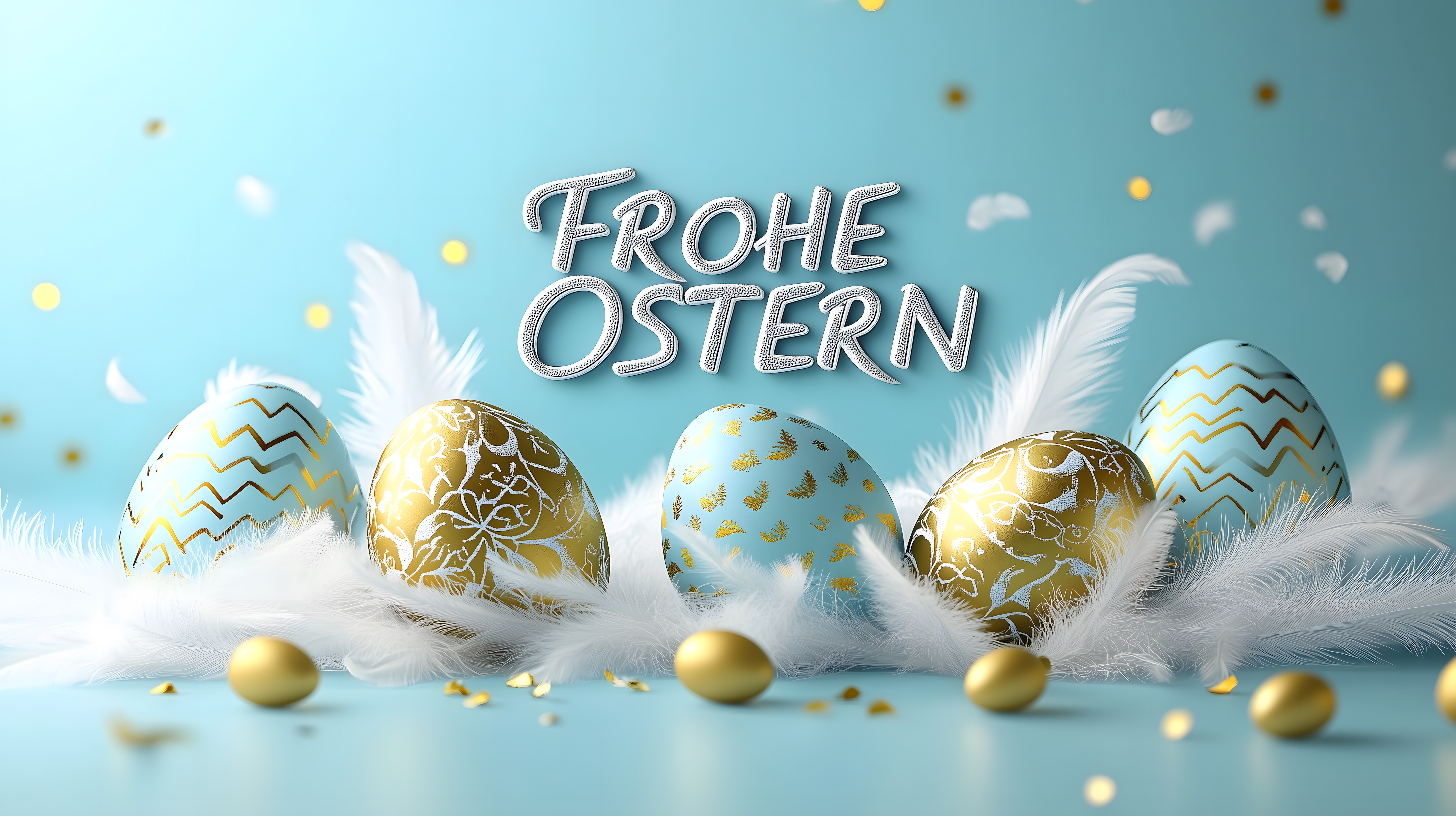 Dieses elegante Osterfoto zeigt eine stimmungsvolle Anordnung von goldenen und blauen Eiern, umgeben von weichen weißen Federn auf einem blauen Hintergrund. Die Eierschalen sind mit zarten Mustern und Ornamenten verziert, die eine kreative und kunstvolle Gestaltung hervorrufen. Die Farbwahl und Komposition verleihen dem Bild eine moderne, stilvolle Ausstrahlung, die sich hervorragend für Dekorationen, Grußkarten oder Werbematerialien zu Ostern eignet. Als hochwertiges Stockfoto in hoher Auflösung und unter Creative-Commons-Lizenz kann es kostenfrei für verschiedenste Projekte genutzt werden - ob für Blogs, Social-Media-Kanäle oder Werbekampagnen.