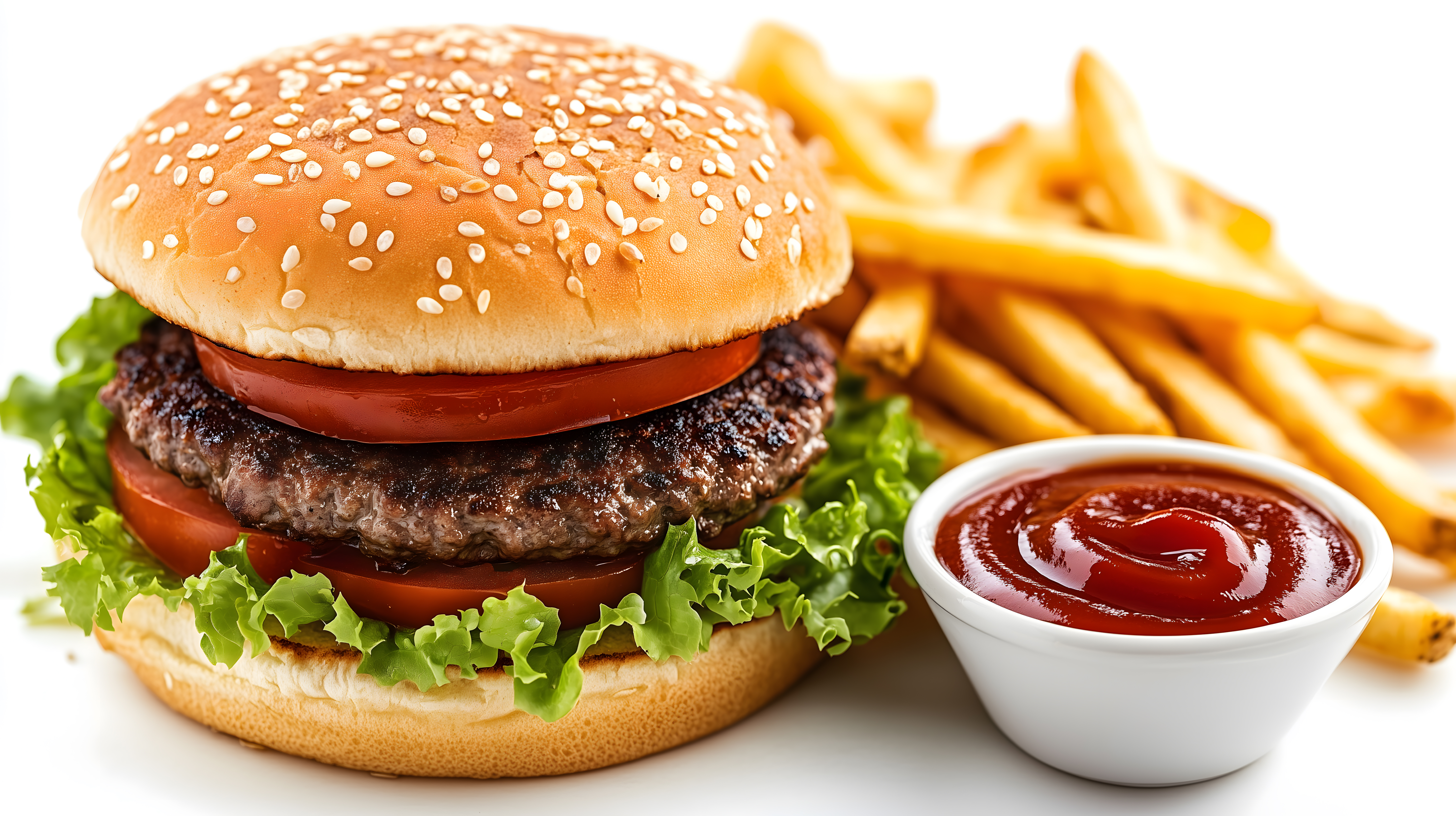 Das Foto zeigt einen leckeren, frisch zubereiteten Cheeseburger auf weißem Hintergrund. Der Burger besteht aus einem saftigen Rindfleischpatty, einer Scheibe Käse, Tomaten, Salat und wird von einem sesam-gekrönten Brötchen gehalten. Dazu gibt es knusprige, goldgelbe Pommes frites und eine kleine Portion Ketchup als Dip.