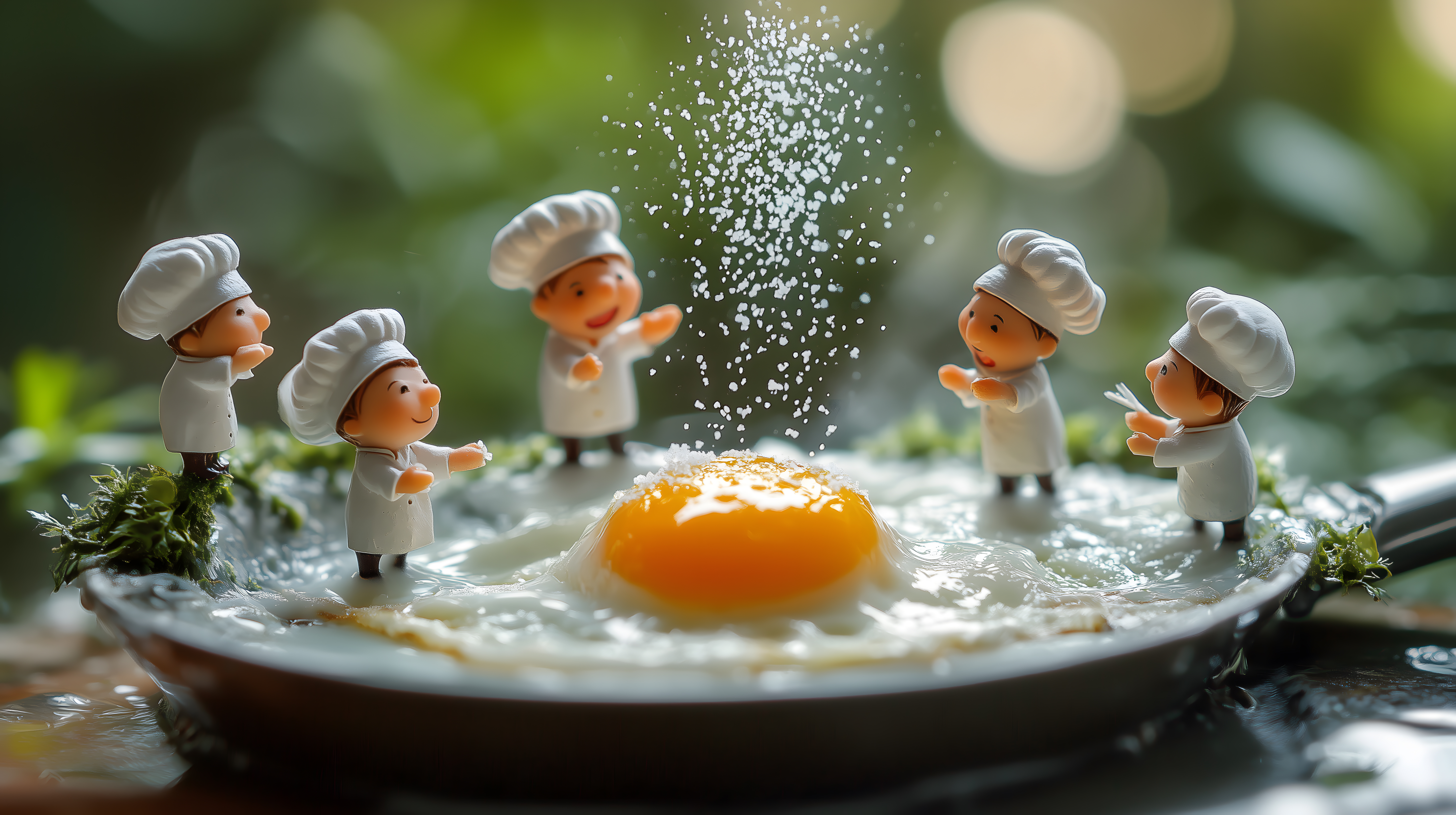 Das fantasievolle Foto zeigt eine Gruppe winziger Miniatur-Köche, die ein köstliches Spiegelei in einer Pfanne zubereiten. Die detailreichen Figuren sind in realistische Kochkostüme gekleidet und scheinen voller Konzentration und Geschick bei der Sache zu sein. Der Fokus liegt auf dem dampfenden Eiergericht, das von herabfallenden Spritzern umgeben ist, was der Szene zusätzliche Dynamik verleiht. Die lebendigen Farben, die natürliche Umgebung und der humorvolle Kontrast zwischen den Miniatur-Figuren und der realistischen Speise machen dieses kostenlosen Stockfoto zu einem echten Hingucker. Es eignet sich hervorragend für Verwendung in Blogs, Newslettern, sozialen Medien oder Werbekampagnen rund um das Thema Kochen, Kulinarik und Kreativität.