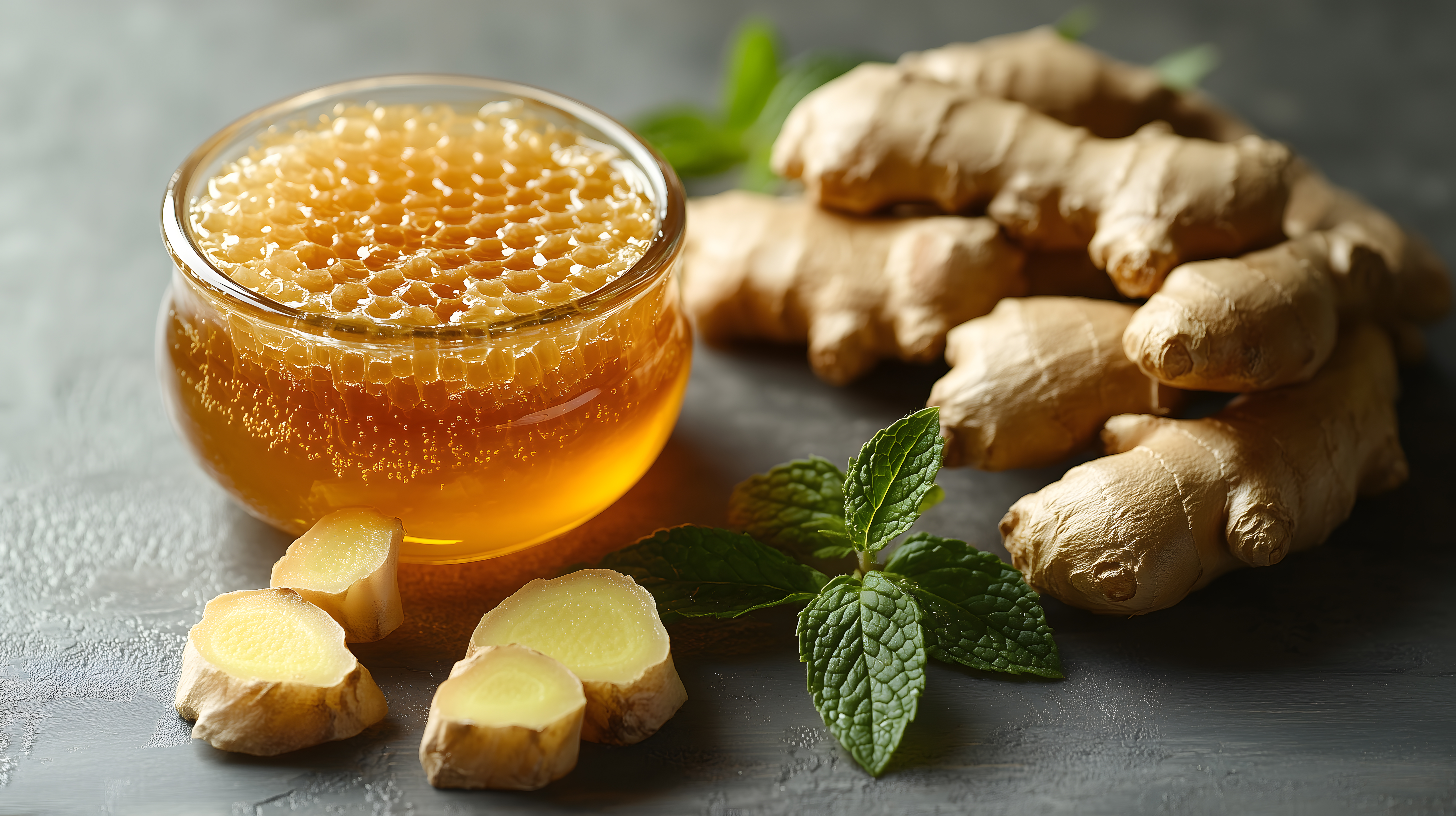 Dieses Foto zeigt eine wunderbare Kombination aus frischem Honig in einem Glas, umgeben von Ingwer-Stücken und Minze-Blättern. Die goldene, flüssige Honigcreme sticht in der Mitte hervor und bietet einen appetitlichen Anblick. Die rustikale Optik mit der rauen Holz-Oberfläche verleiht dem Arrangement einen natürlichen, stimmungsvollen Charakter.