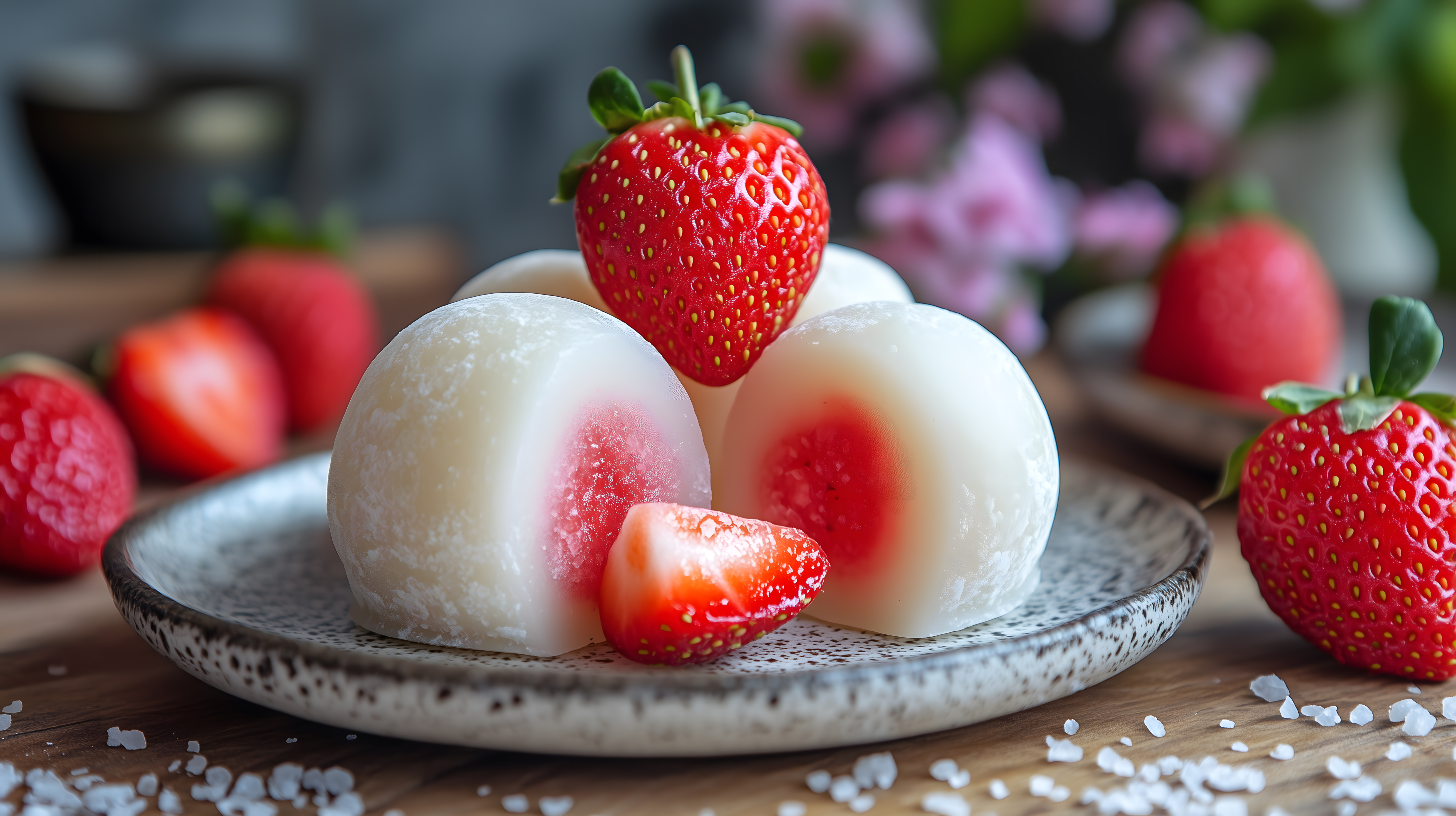 Dieses einladende Foto zeigt eine Auswahl japanischer Erdbeer-Mochi-Desserts. Die roten, saftigen Erdbeeren sind mit einem weichen, weißen Reismantel umhüllt, was einen appetitlichen Kontrast von Farben und Texturen ergibt. Die Komposition ist auf einem rustikalen Holzbrett angeordnet, was dem Bild eine natürliche, handgemachte Ästhetik verleiht. Dieses hochauflösende Stockfoto eignet sich hervorragend für den Einsatz in Blogs, Newslettern, Social-Media-Beiträgen oder Werbematerialien zum Thema leckere, gesunde Süßspeisen. Es steht unter einer Creative-Commons-Lizenz zur freien Nutzung zur Verfügung.