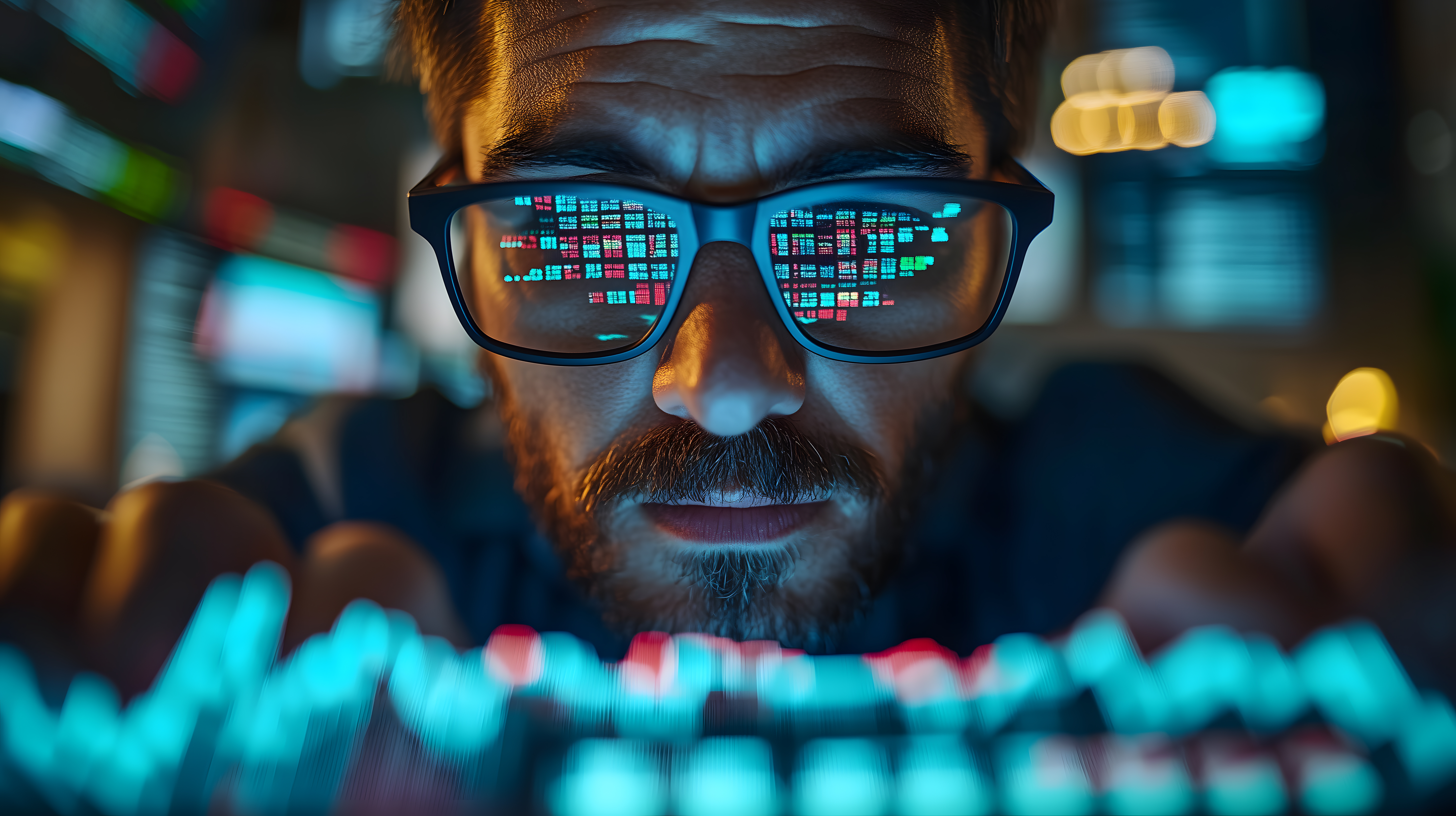 Das Bild zeigt einen konzentriert wirkenden Mann, der auf einer Tastatur tippt. Seine Augen sind hinter einer Datenbrille verborgen, die die Reflexion von schillernden Aktiencharts und Finanzdaten zeigt. Der Hintergrund ist dunkel und beleuchtet den Mann mit farbigen Lichteffekten, was dem Bild eine moderne, technische Atmosphäre verleiht.