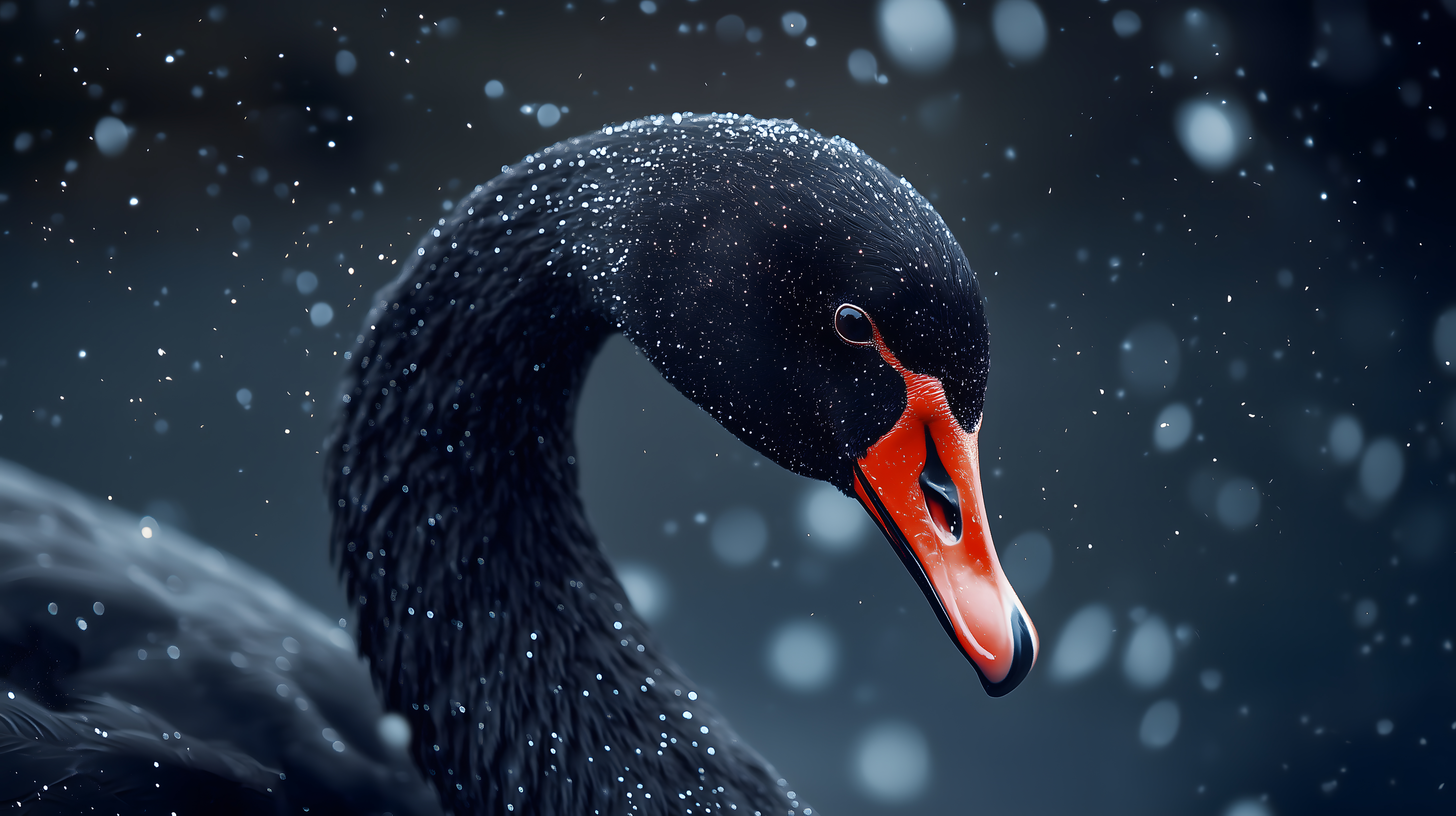 Dieses stimmungsvolle Foto zeigt einen eleganten schwarzen Schwan, der sich majestätisch durch einen Schneesturm bewegt. Der scharfe Kontrast zwischen dem tiefschwarzen Gefieder und den roten Akzenten am Schnabel verleiht dem Bild eine besondere Ausstrahlung. Die Tropfen und Schneeflocken, die vom Körper des Schwans abperlen, verleihen der Szene eine dynamische Note und vermitteln die Kälte und den Wind der Winterlandschaft. Dieses hochwertige Stockfoto ist ideal für den Einsatz in Blogs, Newslettern, Social-Media-Kanälen oder Werbekampagnen, die eine winterliche, natürliche oder elegante Stimmung transportieren wollen. Es ist in hoher Auflösung und unter einer Creative-Commons-Lizenz frei nutzbar.