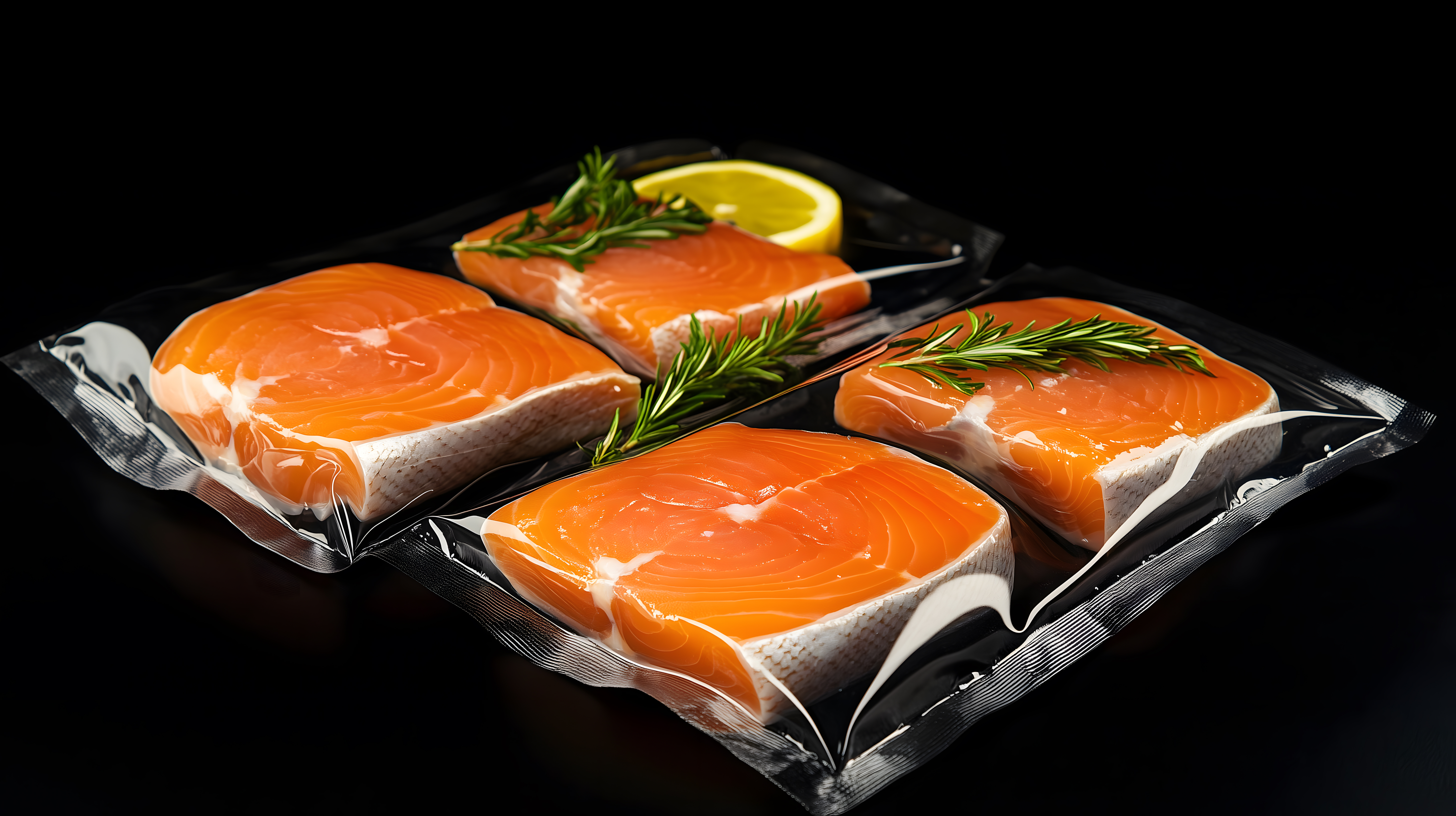 Dieses Foto zeigt mehrere Scheiben Lachs, die in einer Vakuumverpackung mit Rosmarin und frischer Zitrone arrangiert sind. Der Lachs hat eine leuchtend orangerote Farbe und eine glänzende Oberfläche. Das Arrangement hebt den hochwertigen und frischen Eindruck des Lachses hervor. Dieses Stockfoto eignet sich hervorragend für die Verwendung in Blogs, Newslettern, Social-Media-Beiträgen oder Werbematerial rund um das Thema Fisch, gesunde Ernährung oder Gastronomie. Es ist in hoher Auflösung und unter einer Creative-Commons-Lizenz verfügbar.