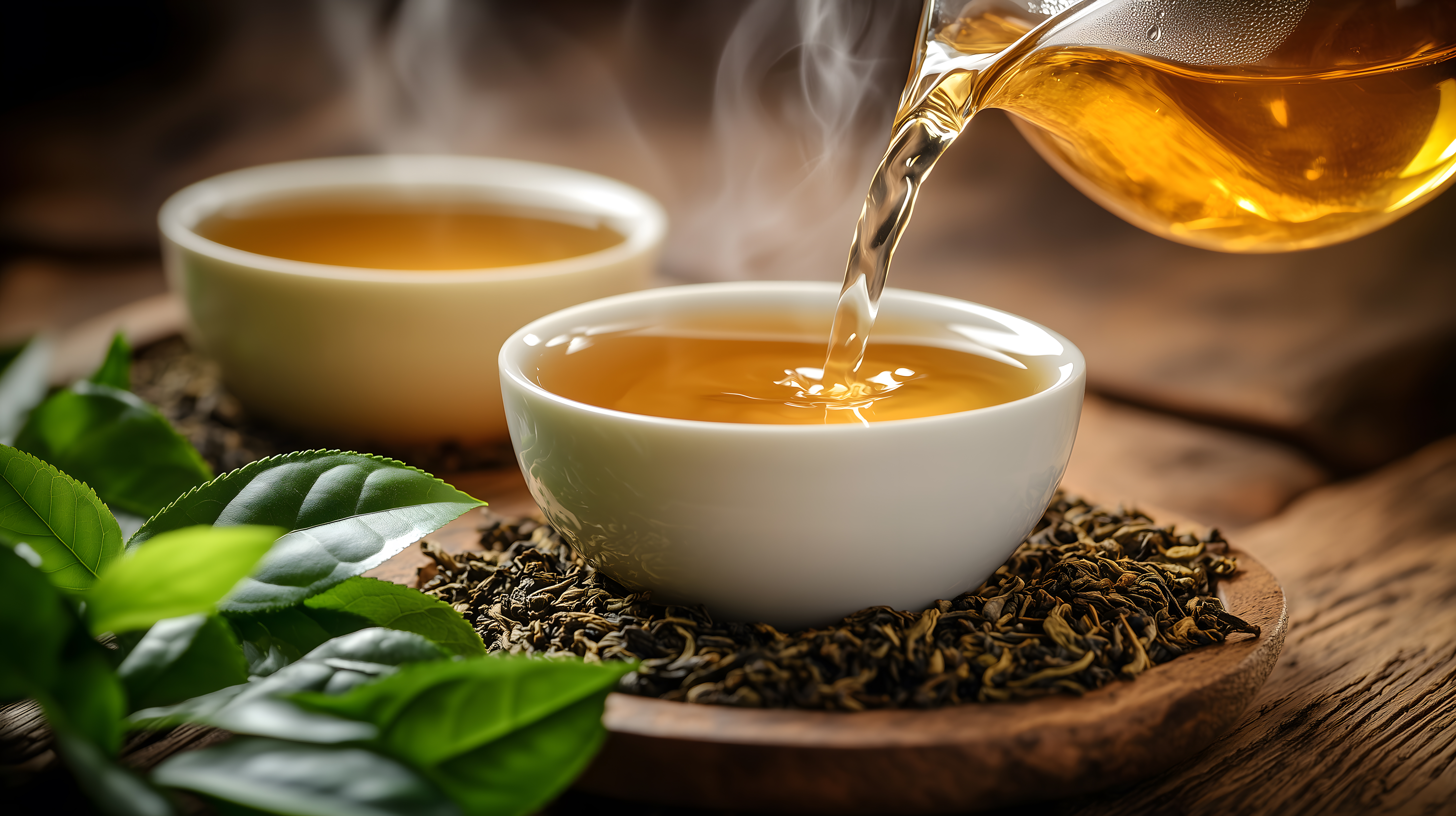 Das Bild zeigt eine Szene mit frisch gebrühtem Grüntee. Eine elegante weiße Porzellantasse ist auf einem rustikalen Holztisch platziert, gefüllt mit der goldenen Teeflüssigkeit, aus der Dampf aufsteigt. Neben der Tasse befinden sich einige lose Teeblätter und grüne Blätter, die den natürlichen Ursprung des Getränks unterstreichen. Im Hintergrund ist eine Teekanne zu sehen, aus der der Tee gerade in die Tasse gegossen wird. Das Bild vermittelt eine ruhige, entspannende Atmosphäre und eignet sich perfekt für den Einsatz in Blogs, Newslettern oder Social-Media-Beiträgen zum Thema Tee, Gesundheit oder Genuss. Dieses hochauflösende Stockfoto steht unter einer Creative-Commons-Lizenz kostenfrei zur Verfügung.