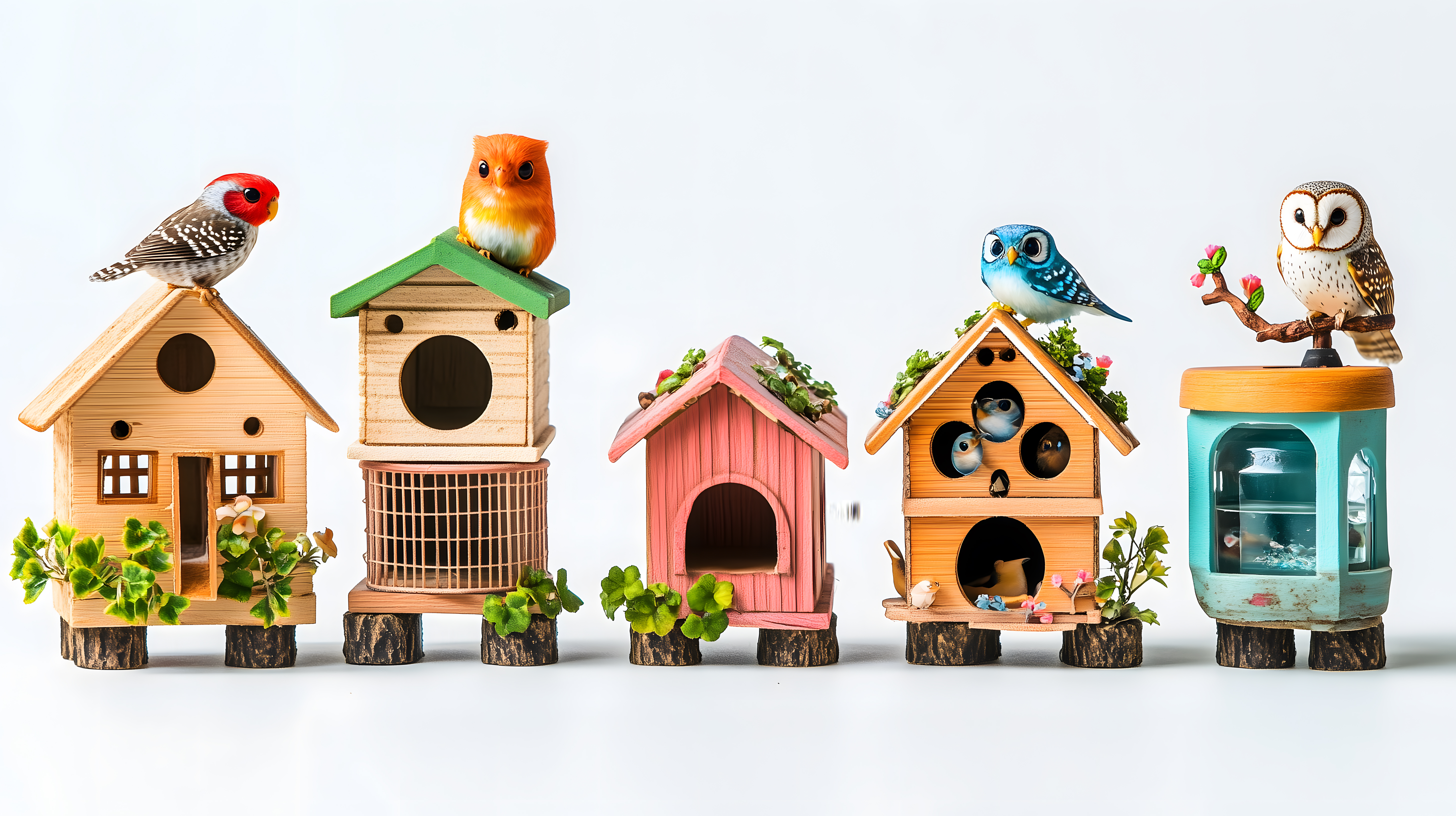 Dieses farbenfrohe Bild zeigt eine Reihe verschiedener Vogelkästen, die mit Dekorationen und niedlichen Vögeln geschmückt sind. Die Kästen sind aus Holz gefertigt und in unterschiedlichen Formen und Designs gestaltet, von traditionellen Häuschen bis hin zu modernen Strukturen. Die Vögel, darunter kleine Singvögel und Eulen, sitzen auf den Kästen und tragen zu der lebendigen und natürlichen Atmosphäre bei. Das Foto ist ideal für die Verwendung in Blogbeiträgen, Newslettern oder Werbematerialien zum Thema Gartengestaltung, Ökologie oder Heimwerken. Dieses kostenlose Stockfoto in hoher Auflösung steht unter einer Creative-Commons-Lizenz zur Verfügung.