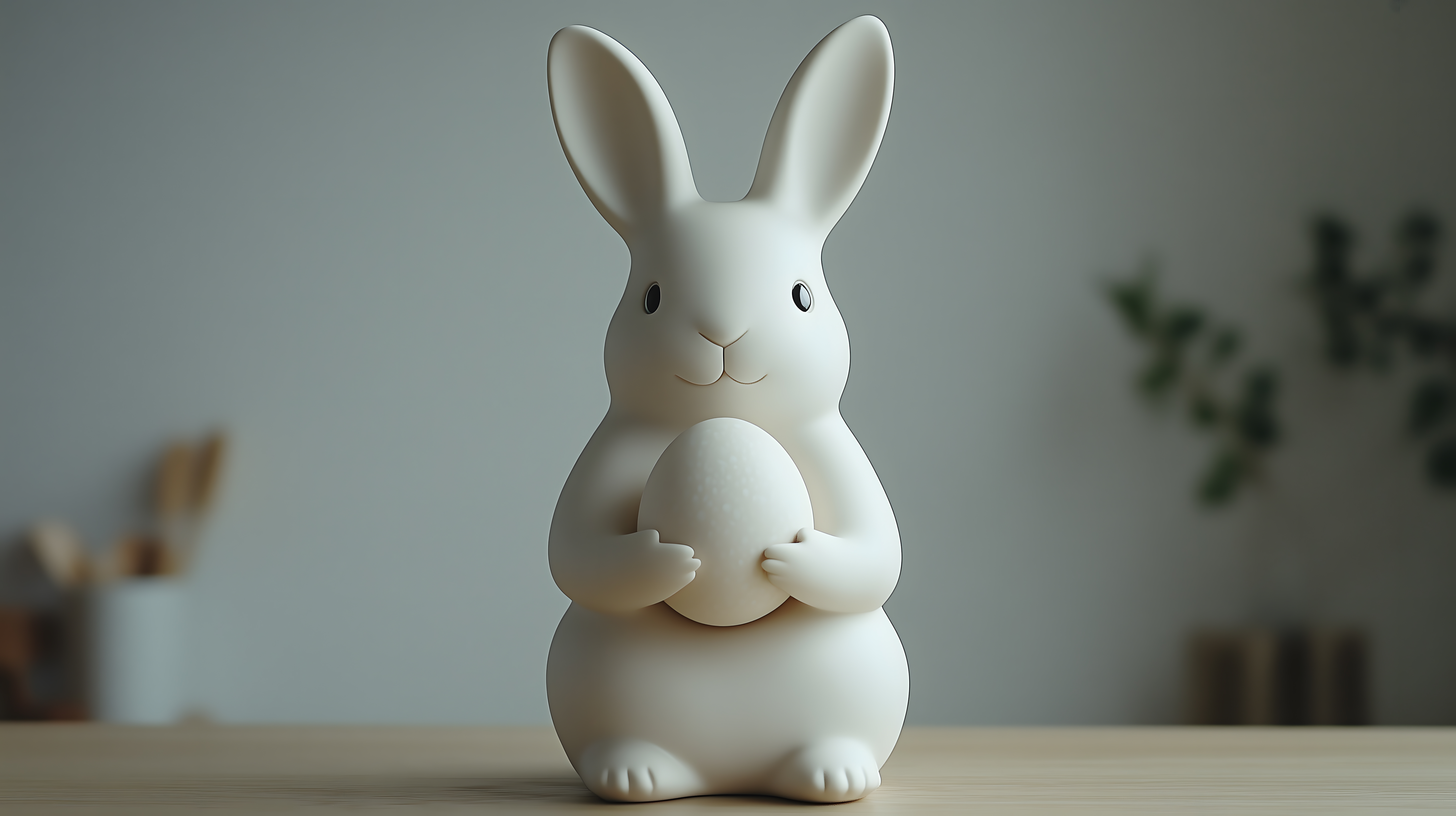 Das Bild zeigt eine niedliche Keramik-Hasenfigur, die ein Osterei in ihren Armen hält. Die Figur ist in einem zarten Cremeweißton gehalten und hat große, aufmerksame Augen sowie lange, abstehende Ohren. Der Hase steht auf einem Holztisch vor einem schlichten, hellgrauen Hintergrund, was den Fokus ganz auf die minimalistische, aber charmante Dekoration lenkt.