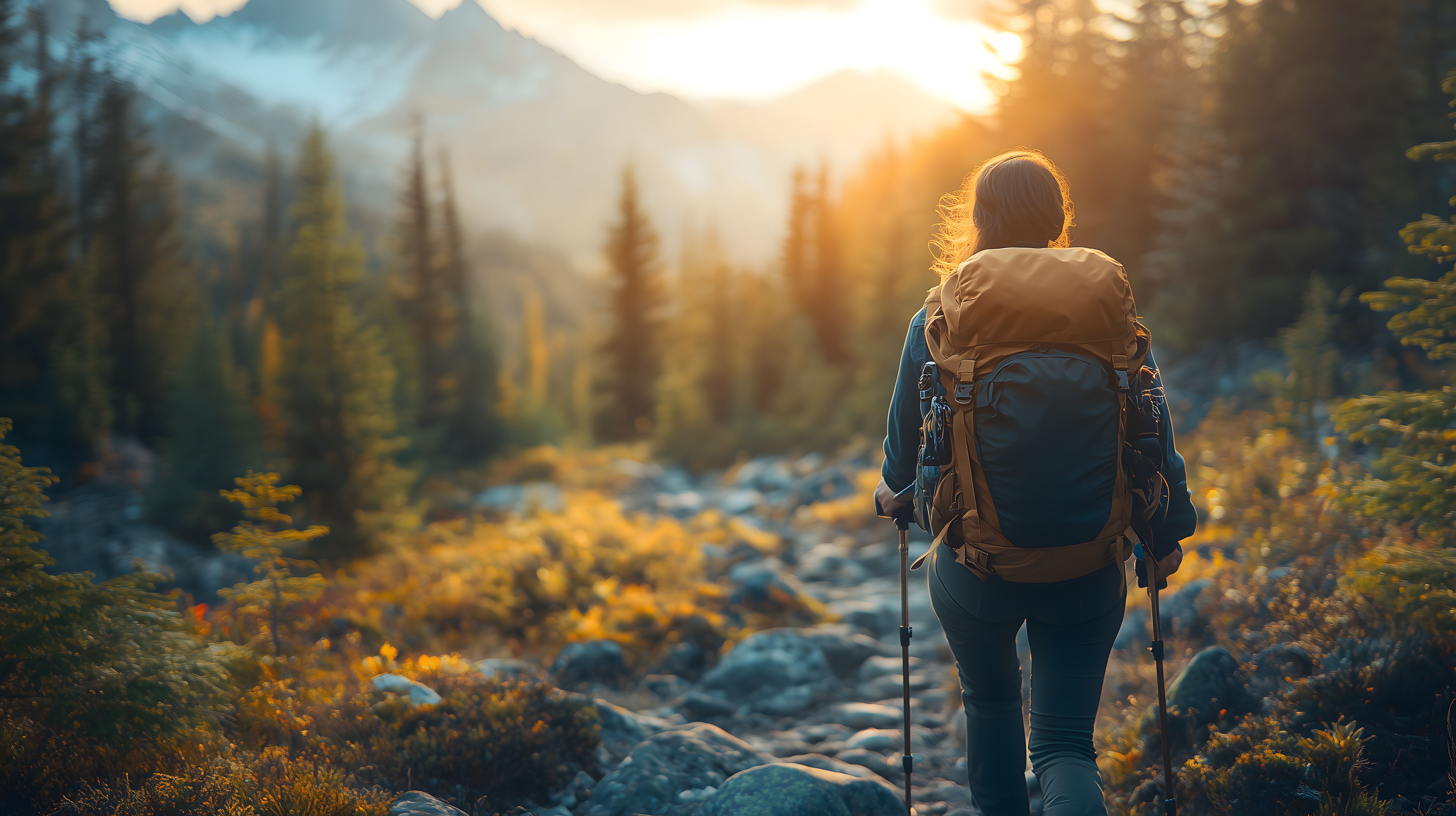 Das Bild zeigt eine Wandererin, die auf einem Bergpfad durch die herbstliche Natur läuft. Im Hintergrund sieht man üppigen Wald, Felsen und Berge, die von der untergehenden Sonne in ein warmes, oranges Licht getaucht werden. Die Frau trägt einen Rucksack auf dem Rücken und hält Wanderstöcke in den Händen, was auf eine aktive Outdooraktivität hinweist.