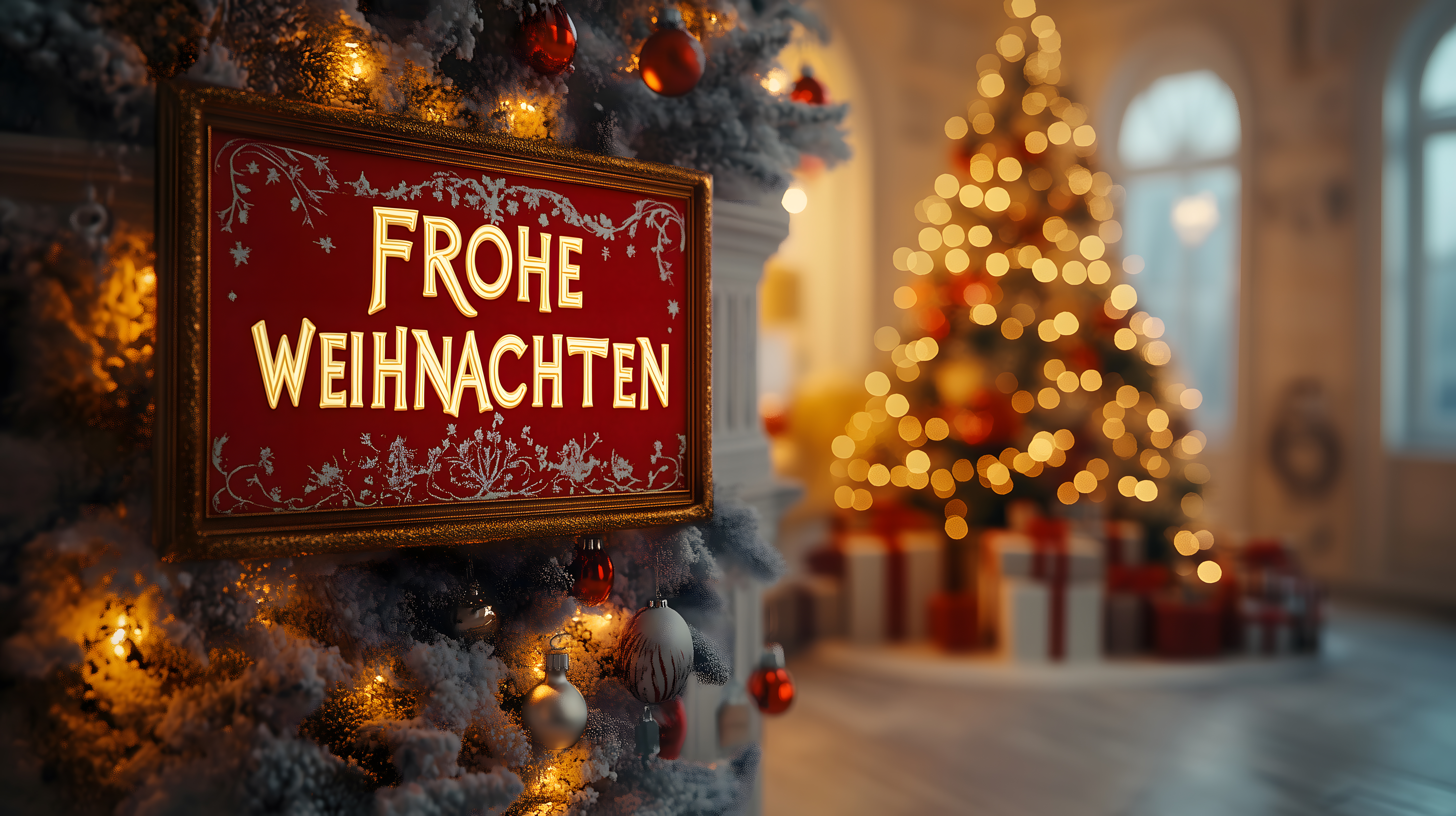 Dieses festliche Weihnachtsfoto zeigt einen prächtigen Weihnachtsbaum, der von Lichterketten und Christbaumkugeln dekoriert ist. Im Vordergrund befindet sich ein goldenes Schild mit der Aufschrift 'Frohe Weihnachten' in roter Schrift, umrahmt von weihnachtlichen Ornamenten. Das Foto strahlt eine gemütliche, vintage-inspirierte Atmosphäre aus und eignet sich perfekt als Hintergrund für Weihnachtsgrüße, Blogbeiträge oder Werbematerial. Dieses hochauflösende Bild kann kostenfrei unter einer Creative-Commons-Lizenz genutzt werden.