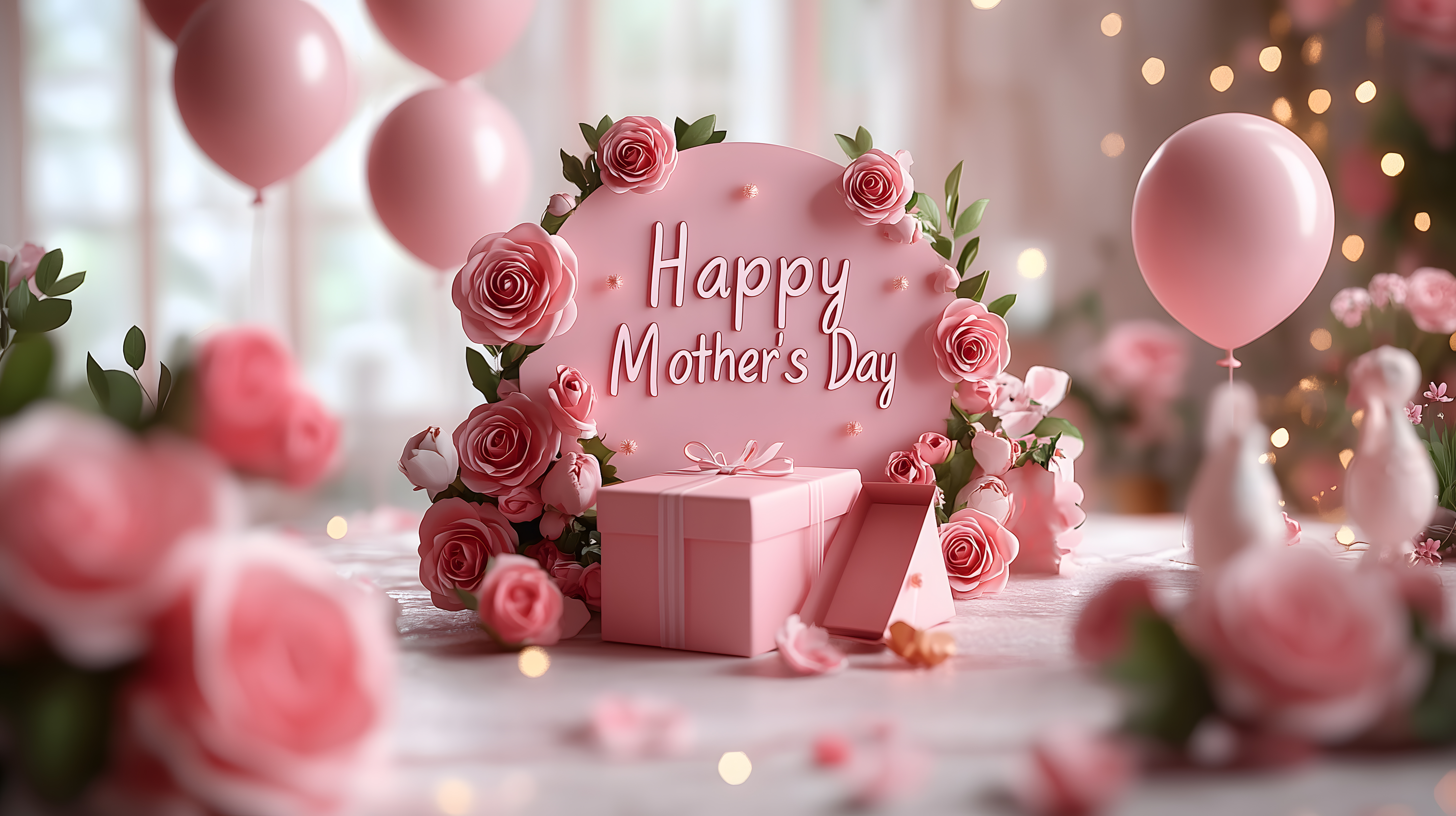 Diese festliche Muttertagsdekoration zeigt einen wunderschönen Blumenstrauß mit rosa Rosen und Blättern, umrahmt von zarten Lichterketten und rosa Luftballons. In der Mitte befindet sich eine detailliert gestaltete Geschenkbox, die das Bild zu einer stimmungsvollen Muttertagsszene komplettiert. Die gesamte Komposition ist in sanften Rosatönen gehalten und vermittelt eine Atmosphäre der Liebe, Freude und Dankbarkeit. Dieses hochauflösende, kostenlose Stockfoto eignet sich perfekt für Muttertagsgrußkarten, Newsletter, Werbebanner oder Social-Media-Beiträge rund um den Feiertag. Es steht unter der Creative-Commons-Lizenz zur Verfügung und kann frei genutzt werden.