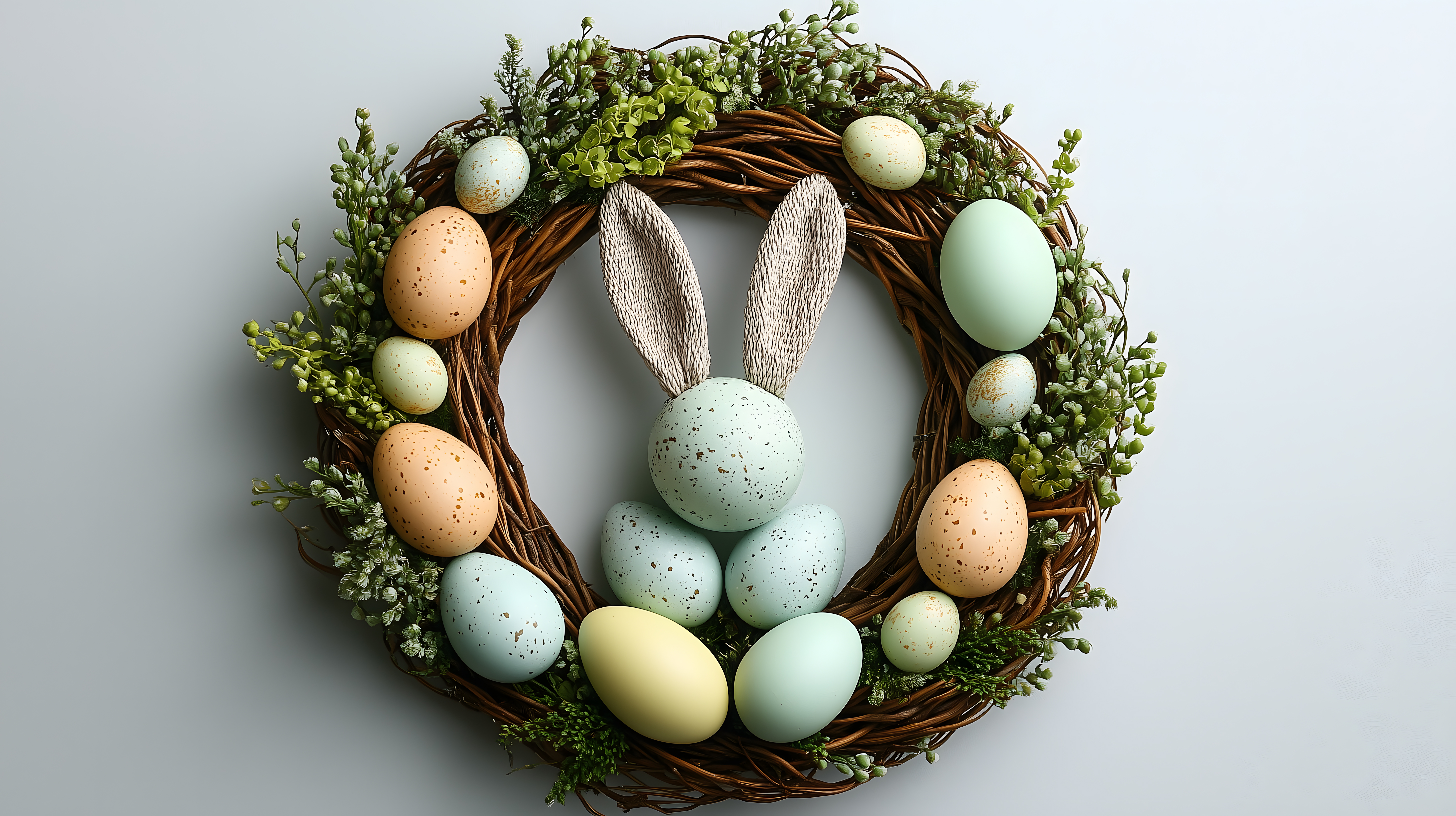 Dieses Foto zeigt einen wunderschönen, natürlich gestalteten Osterkranz. Der Kranz ist aus geflochtenen Zweigen gefertigt und mit verschiedenfarbigen Ostereiern, Hasenohren und kleinen, grünen Blättern dekoriert. Die Farbpalette reicht von warmen Brauntönen über helle Pastellgrüntöne bis hin zu sanften Gelb- und Rottönen bei den Eiern. Der Kranz strahlt Frische, Leichtigkeit und Frühlingsstimmung aus und eignet sich perfekt als kreative Dekoration für das Osterfest. Dieses hochauflösende, kostenlose Stockfoto in hoher Qualität ist unter einer Creative-Commons-Lizenz verfügbar und kann z.B. in Blogs, Newslettern oder Werbematerialien verwendet werden.