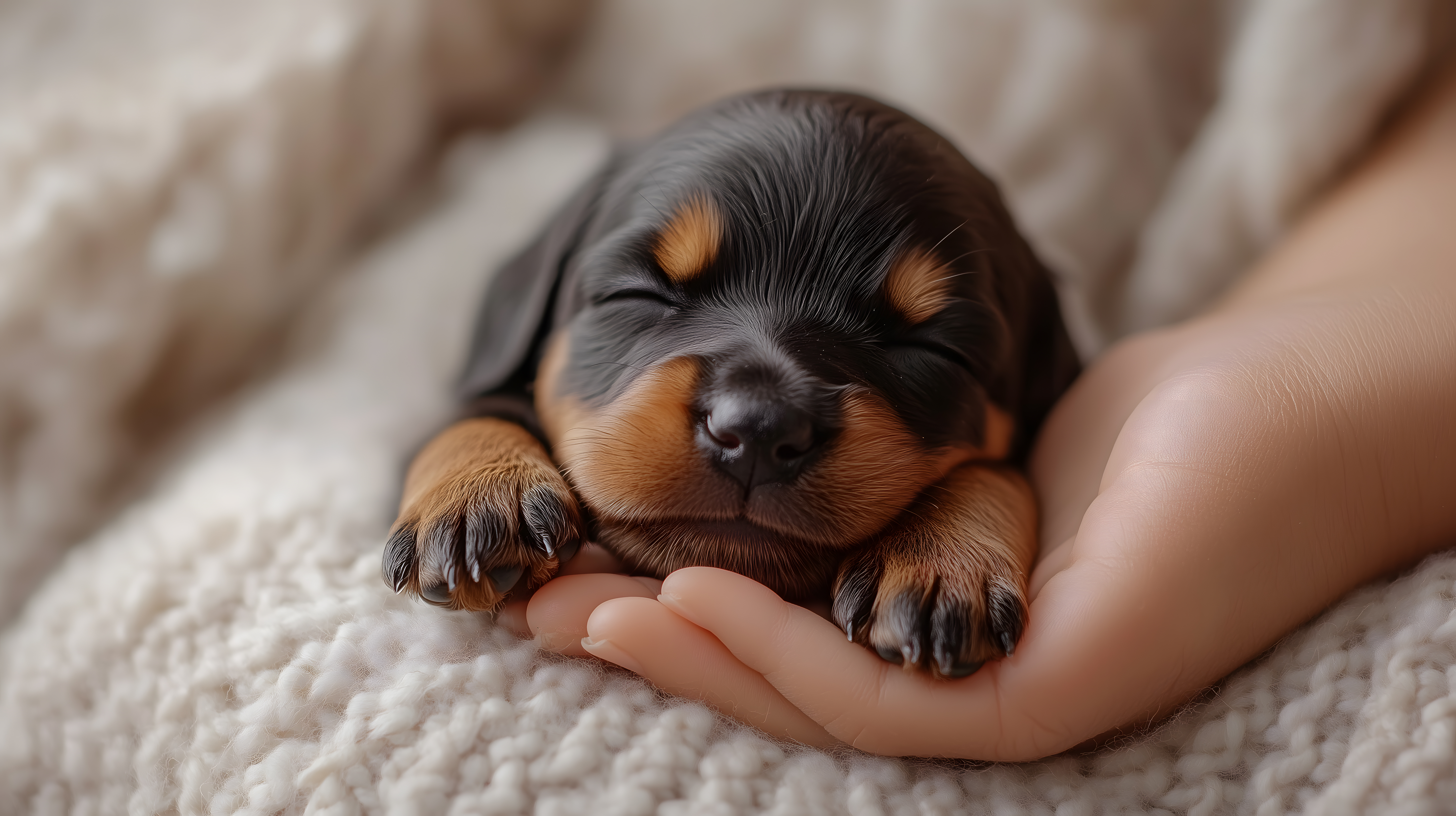 Dieses bezaubernde Foto zeigt einen süßen Hundewelpen, der friedlich in den Händen eines Menschen schlummert. Das Bild strahlt Ruhe, Geborgenheit und Zärtlichkeit aus. Der flauschige Welpe mit seinen schwarzen, braunen und orangefarbenen Markierungen sieht zum Knuddeln aus. Der Kontrast zwischen der weichen, hellen Haut des Säuglings und dem kuschelig-weichen Fell des Tieres schafft eine harmonische, einladende Atmosphäre. Dieses hochauflösende Stockfoto eignet sich hervorragend für Beiträge in Blogs, Newsletter oder Social-Media-Kanäle rund um Tiere, Haustiere und Familienthemen. Es steht unter einer Creative-Commons-Lizenz zur kostenlosen Nutzung zur Verfügung.