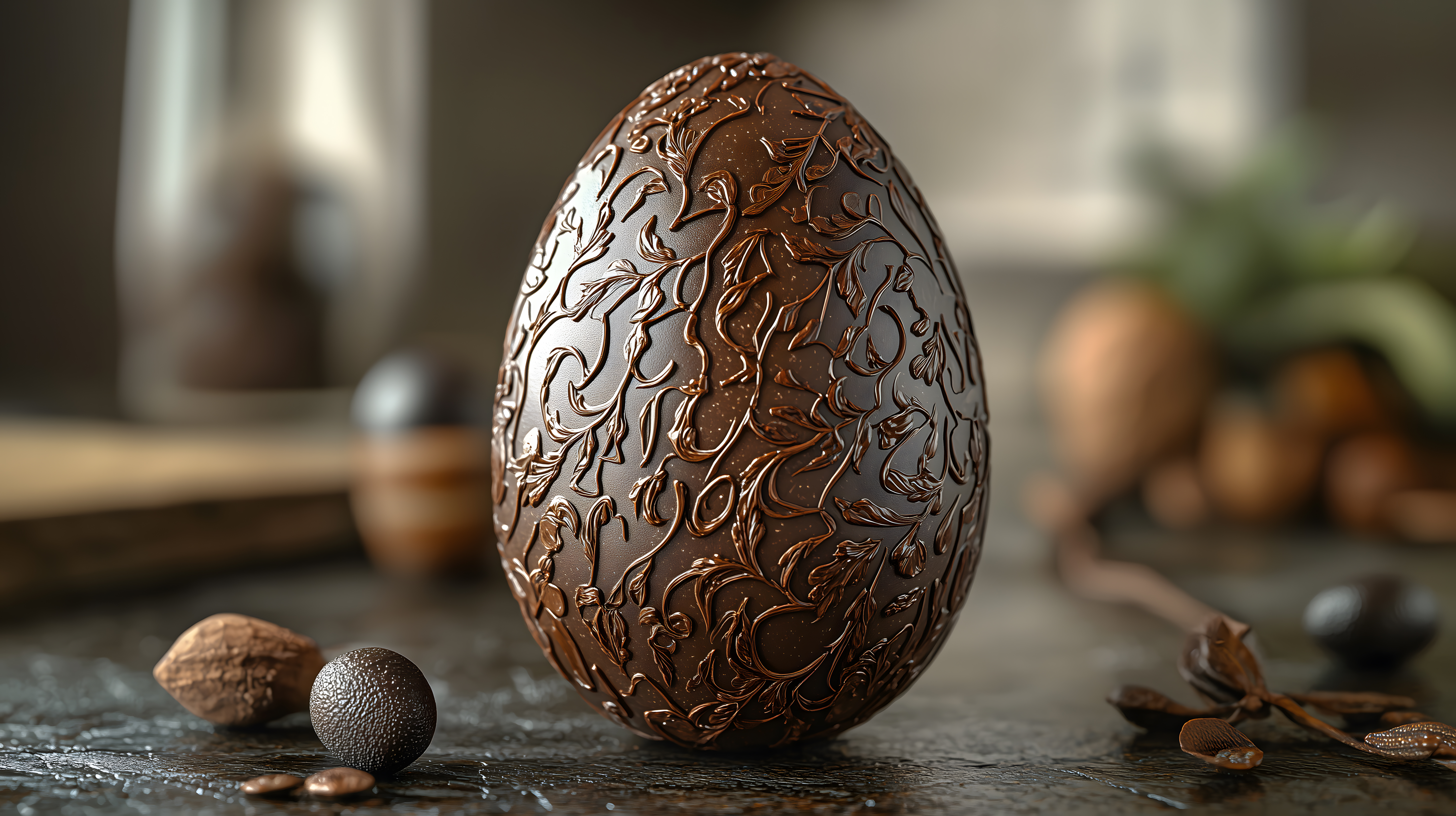 Das Foto zeigt ein kunstvolles, dunkel glasiertes Schokoladen-Osterei, das mit einem prachtvollen, floralen Muster verziert ist. Nüsse wie Haselnüsse und Walnüsse rahmen das Ei auf dem rustikalen Holztisch ein, was der Szene eine natürliche, saisonale Atmosphäre verleiht. Die detailreiche, reliefähnliche Oberflächenstruktur des Eis erzeugt eine haptische Anmutung und lädt zum Betrachten und Entdecken ein. Dieses Stockfoto in hoher Auflösung eignet sich hervorragend für Verwendung in Oster-Blogs, Newslettern oder Social-Media-Beiträgen rund um das Thema Ostern, Süßigkeiten und kulinarische Dekorationen. Es steht unter einer Creative-Commons-Lizenz zum kostenlosen Download zur Verfügung.