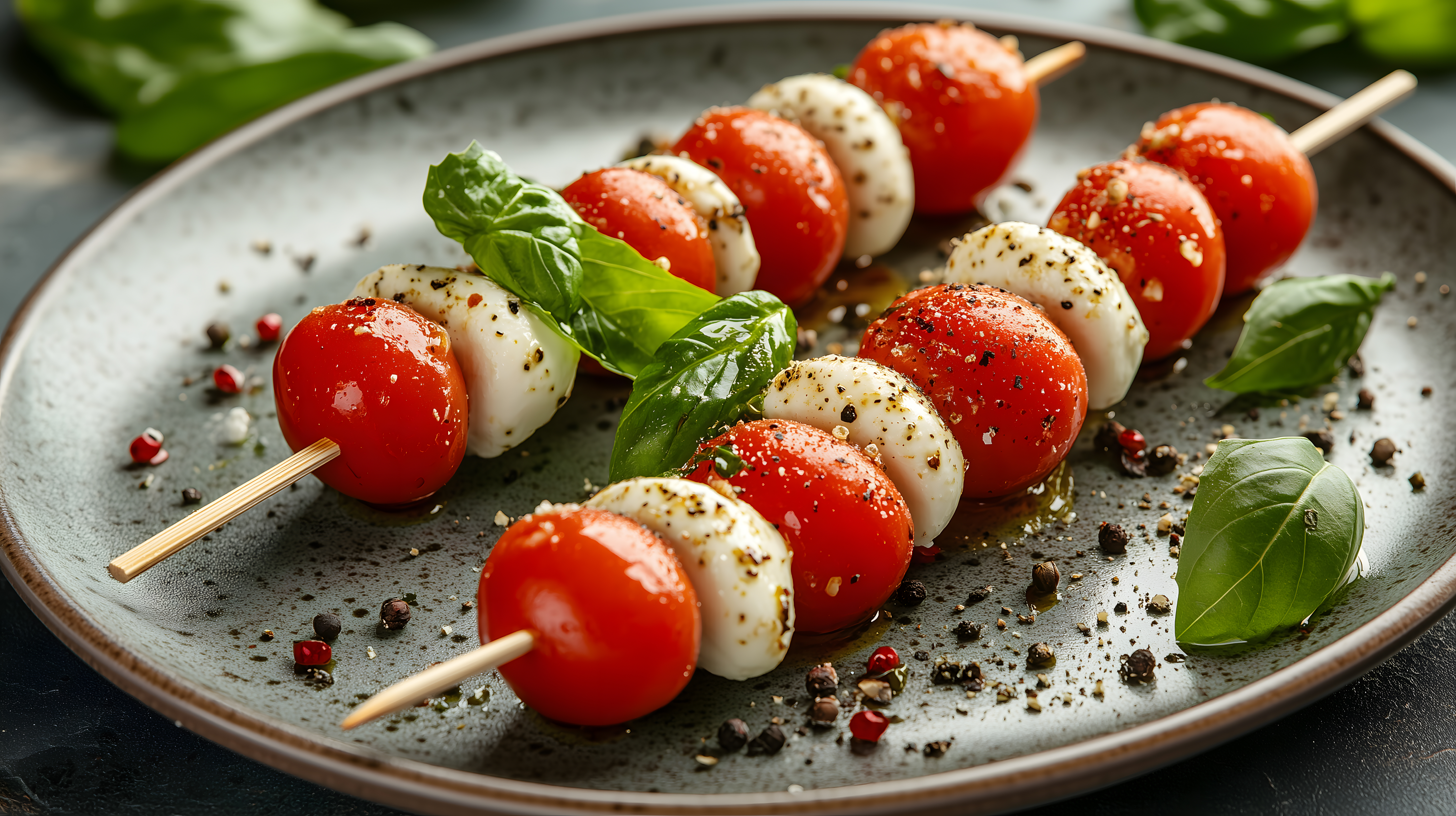 Dieses Foto zeigt einen leckeren Tomatenmozzarella-Salat, der auf einem rustikalen Holzbrett angerichtet ist. Die reifen, roten Tomaten sind abwechselnd mit Scheiben von Mozzarella-Käse auf Holzspieße aufgesteckt. Dazu sind frische Basilikumblätter platziert, die dem Gericht einen mediterranen Touch verleihen. Die Komposition ist farbenfroh und appetitlich. Solch ein Salat eignet sich perfekt als Vorspeise, Snack oder Beilage zu einem Sommergericht. Als hochwertiges, kostenloses Stockfoto in hoher Auflösung lässt es sich ideal für Blogs, Social-Media-Beiträge oder Werbematerialien einsetzen - natürlich unter Creative-Commons-Lizenz.