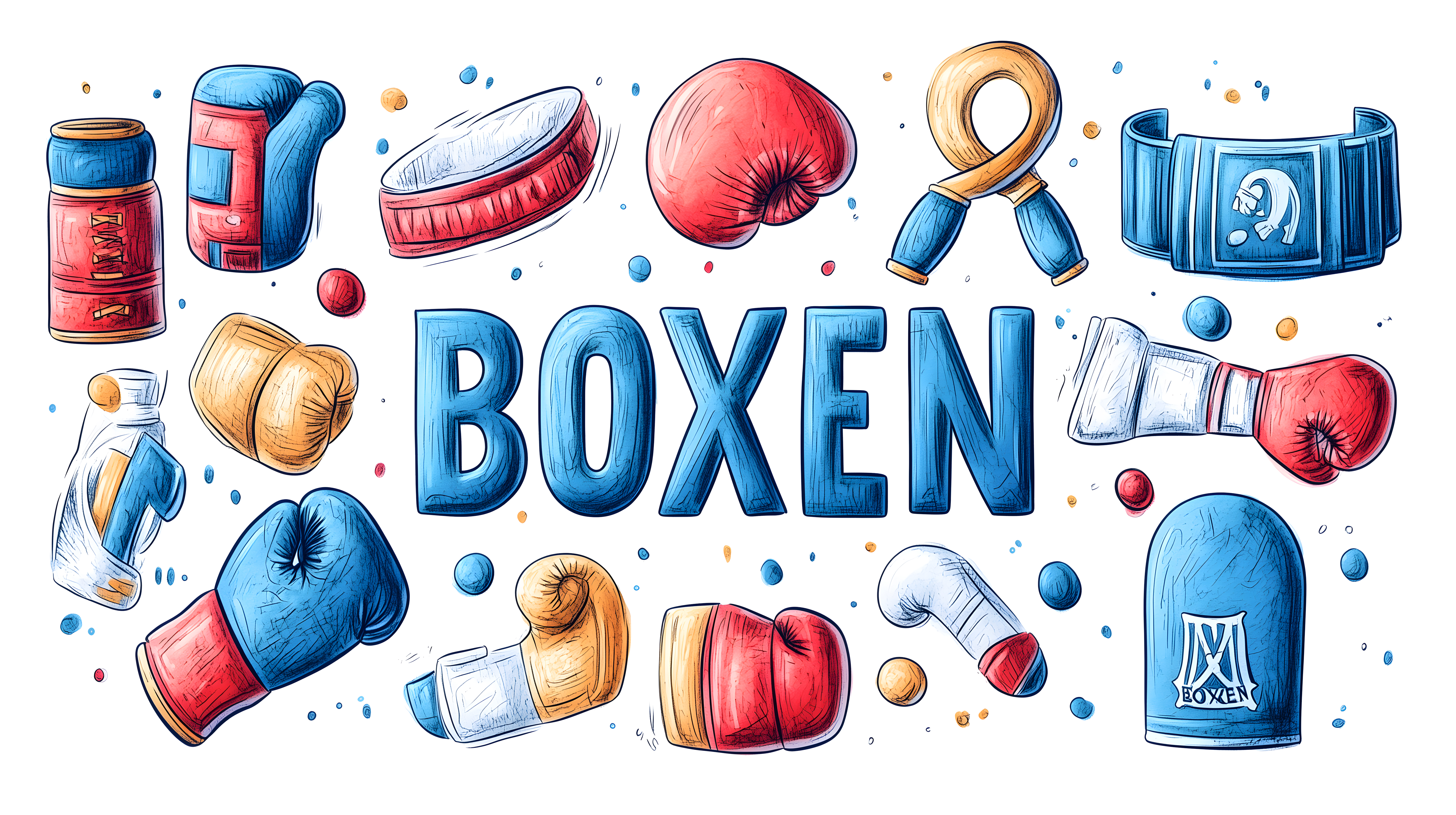 Diese lebendige Illustration zeigt eine Vielzahl an Box-Ausrüstung in einer dynamischen, bunten Darstellung. Der Fokus liegt auf den typischen Elementen wie Boxhandschuhe, Mundschutz, Bandagen und Wasser-Flasche. Die Objekte sind in einem skizzenartigen Stil gehalten und ergeben zusammen mit der großen, stilisierten Schrift 'BOXEN' ein eindrucksvolles visuelles Konzept rund um den Boxsport. Das Bild eignet sich hervorragend als kostenloses Stockfoto für Blogs, Newsletter, Social Media-Beiträge oder Werbematerialien zum Thema Fitness, Kampfsport und gesunder Lebensstil. Die hohe Bildqualität und Creative-Commons-Lizenz erlauben eine vielseitige Verwendung.