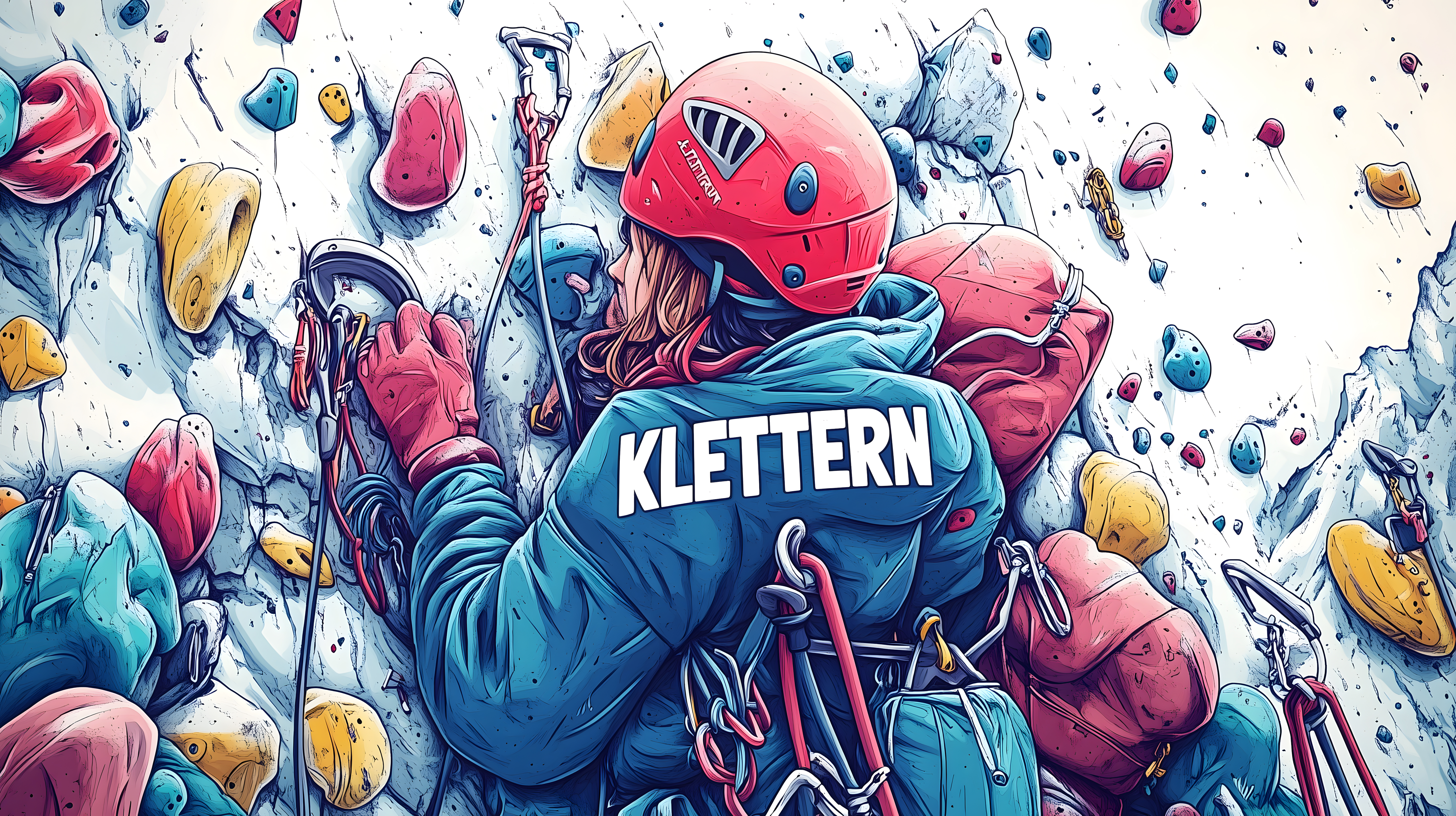 Diese farbenfrohe Cartoon-Illustration zeigt einen Bergsteiger, der an einer Kletterwand emporklettert. Die Szene ist mit vielen Details wie Seilen, Karabinern, Helmen und anderen Kletterausrüstungen angereichert, die den Abenteuergeist und die Dynamik des Bergsteigens widerspiegeln. Das bunte, stilisierte Design verleiht dem Bild einen modernen, digitalen Charakter und macht es zu einem tollen Eyecatcher für Blog-Beiträge, Newsletter oder Social-Media-Posts rund um Outdoor-Sport, Abenteuer und Herausforderungen. Das hochauflösende Stockfoto steht unter einer Creative-Commons-Lizenz kostenlos für die Verwendung zur Verfügung.