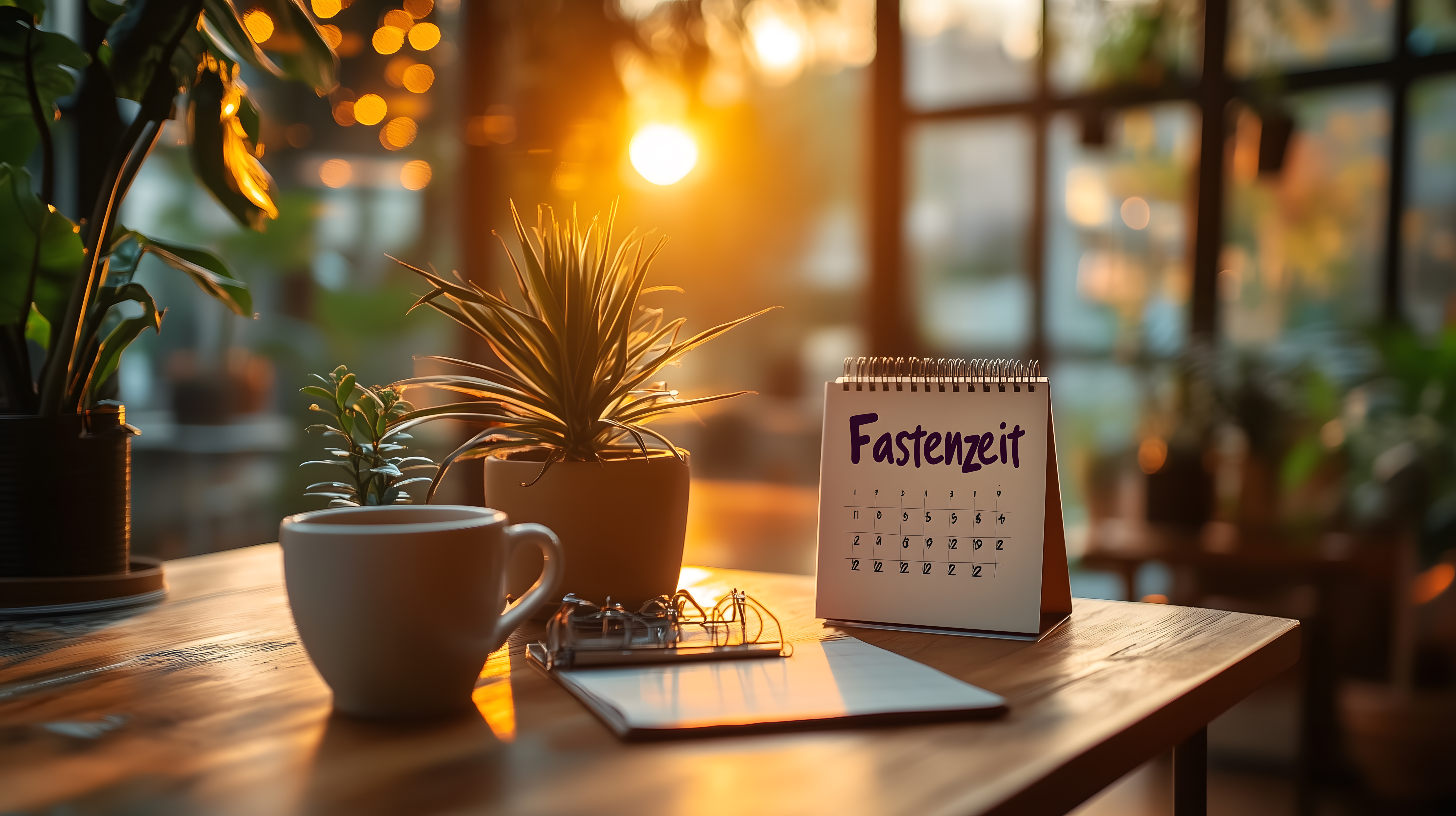 Dieses Foto zeigt einen gemütlichen Arbeitsplatz mit Blick auf den Sonnenuntergang. Der Schreibtisch ist mit einer Kaffeepause-Szene dekoriert, inklusive Kaffeetasse, Pflanzen in Töpfen und einem Kalender. Die warme, goldene Beleuchtung und die Fensterfront schaffen eine einladende, entspannte Atmosphäre, die zum Arbeiten, Fotografieren oder einfach nur Verweilen einlädt. Dieses hochauflösende Stockfoto unter der Creative-Commons-Lizenz ist perfekt für Blog-Beiträge, Newsletter-Designs oder Social-Media-Posts, die eine gemütliche, natürliche Stimmung vermitteln möchten.