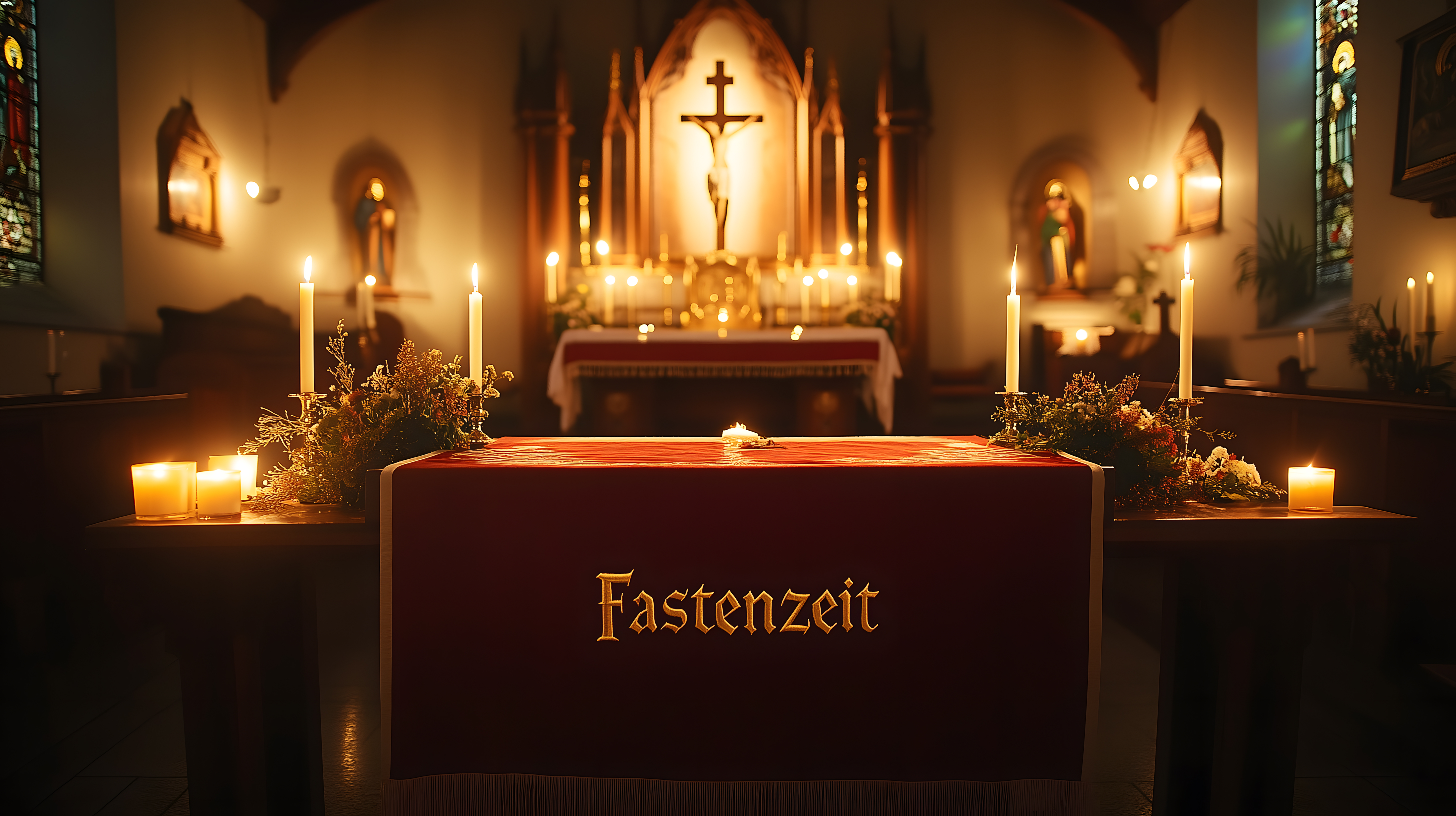 Das Bild zeigt einen stimmungsvollen Kircheninnenraum mit einem prächtigen, reich verzierten Altar. Kerzen und Blumendekoration verleihen der Szene eine feierliche, andächtige Atmosphäre. Der Fokus liegt auf dem Schriftzug 'Fastenzeit' auf der mittigen Altarplatte, der auf die bevorstehende christliche Fastenzeit hindeutet. Die warme, gedämpfte Beleuchtung und die gotischen Architekturelemente erzeugen eine mystische, sakrale Stimmung. Dieses Bild eignet sich hervorragend als kostenloses Stockfoto für Blogs, Newsletter oder Social-Media-Beiträge zum Thema Christentum, Liturgie oder religiöse Feiertage. Es ist in hoher Auflösung und unter einer Creative-Commons-Lizenz verfügbar.
