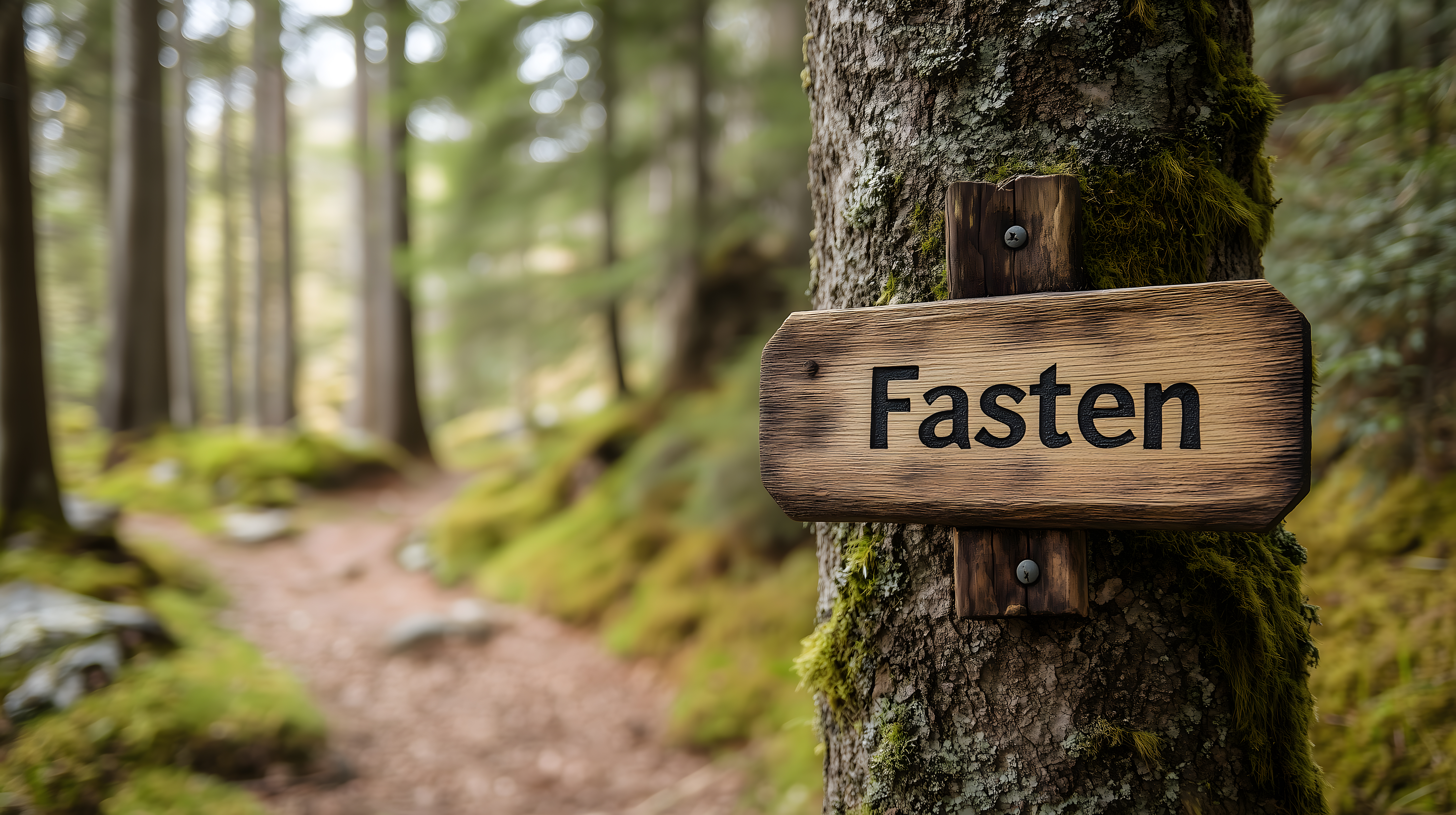 Dieses Foto zeigt ein rustikales Holzschild mit der Aufschrift 'Fasten', das an einem moosbewachsenen Baum in einem herbstlichen Waldweg angebracht ist. Der Weg schlängelt sich durch den dicht bewachsenen Wald, wobei das Sonnenlicht durch die Bäume dringt und einen malerischen Effekt erzeugt. Das Bild vermittelt eine Stimmung von Ruhe, Meditation und Spiritualität, die ideal für Blogbeiträge, Newsletter oder Social-Media-Posts zu Themen wie Achtsamkeit, Fasten oder Naturverbundenheit geeignet ist. Als kostenfreies Stockfoto in hoher Auflösung und unter Creative-Commons-Lizenz ist es vielseitig einsetzbar.