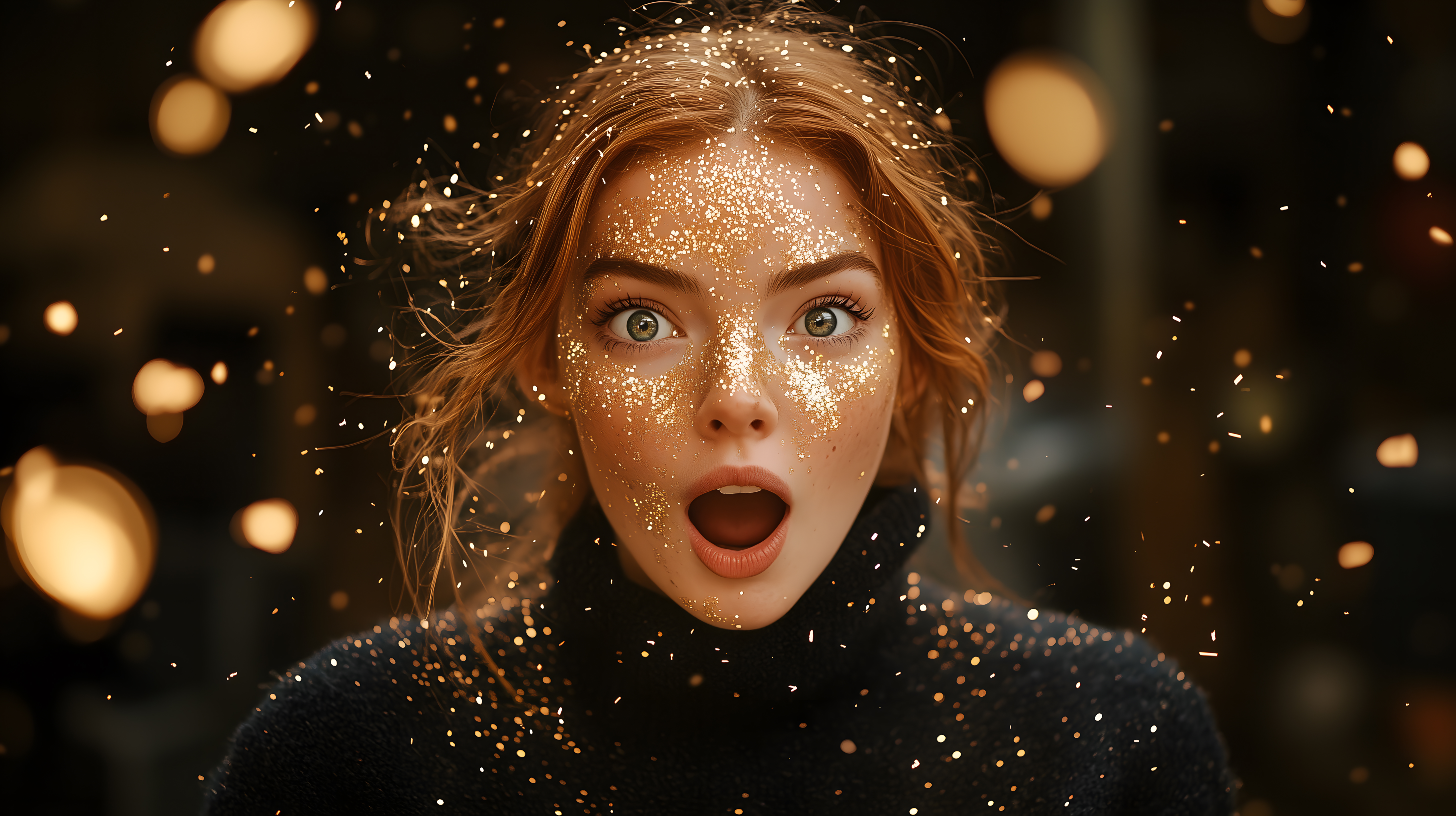 Das Foto zeigt eine Frau mit überraschtem Gesichtsausdruck. Ihr Gesicht ist überzogen mit goldenem Glitzer, der im Licht funkelt und eine faszinierende, glamouröse Atmosphäre erzeugt. Die Frau hat einen intensiven, fast begeisterten Blick und den Mund leicht geöffnet, als wäre sie gerade von etwas Unerwarteten überrascht worden. Der dunkle Hintergrund lässt den goldenen Glitzer und die ausdrucksstarken Gesichtszüge der Frau noch stärker hervortreten.