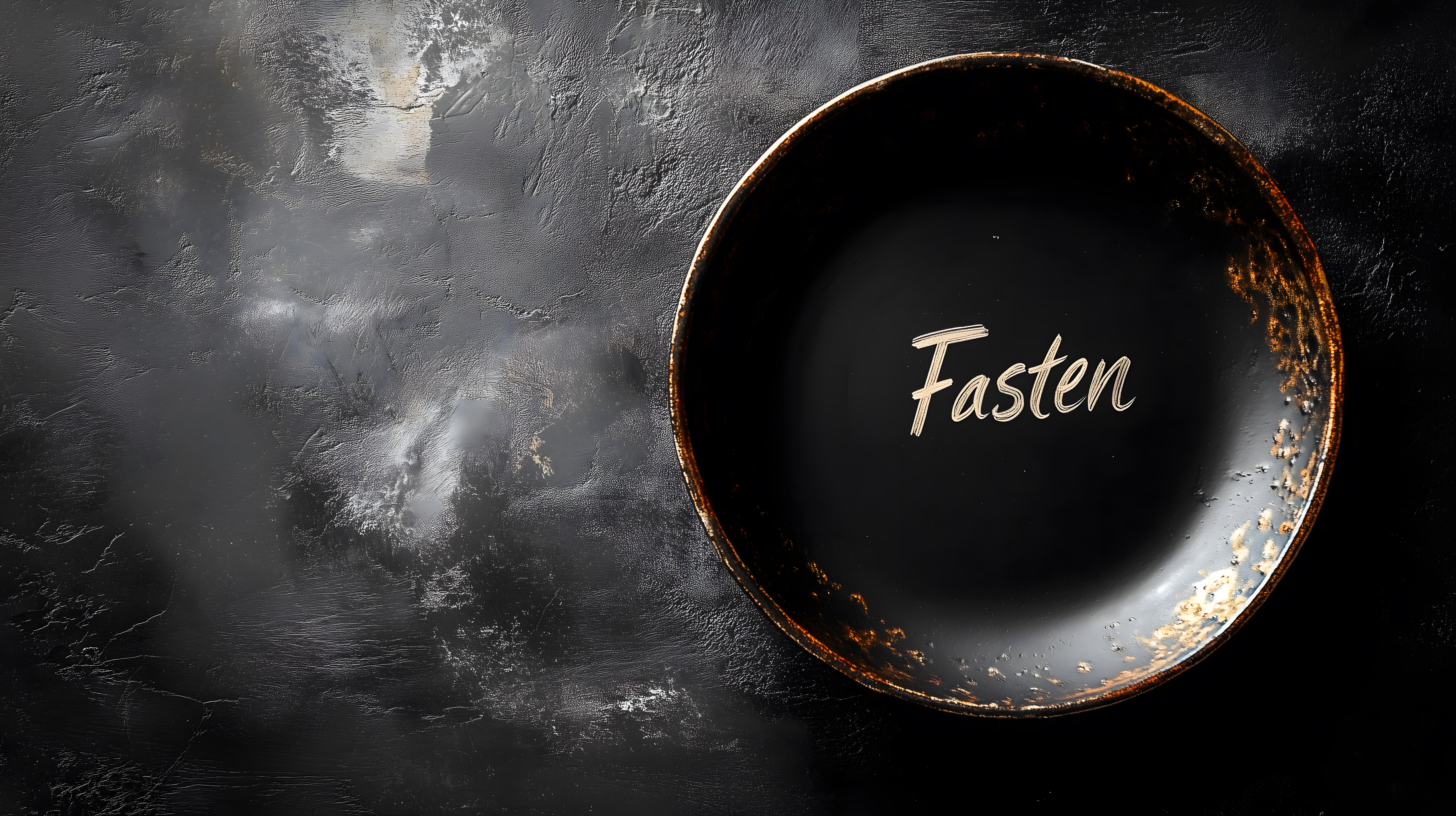 Dieses Bild zeigt einen leeren, dunklen Teller vor einem minimalistischen, rauen Hintergrund. Der Teller, in einer rustikalen Holzoptik gehalten, trägt in weißer Schrift die Aufschrift 'Fasten'. Dieser Kontrast zwischen dem schlichten, kahlen Teller und der Botschaft vermittelt ein Gefühl der Entsagung, des bewussten Verzichts und der Fokussierung auf das Wesentliche. Das Bild eignet sich hervorragend als Illustration für Themen wie Spiritualität, Meditation, Nachhaltigkeit und Minimalismus. Es kann in verschiedenen Kontexten wie Blogs, Newsletter, Social-Media-Beiträgen oder Werbematerial verwendet werden und steht unter einer kostenlosen Creative-Commons-Lizenz in hoher Auflösung zur Verfügung.