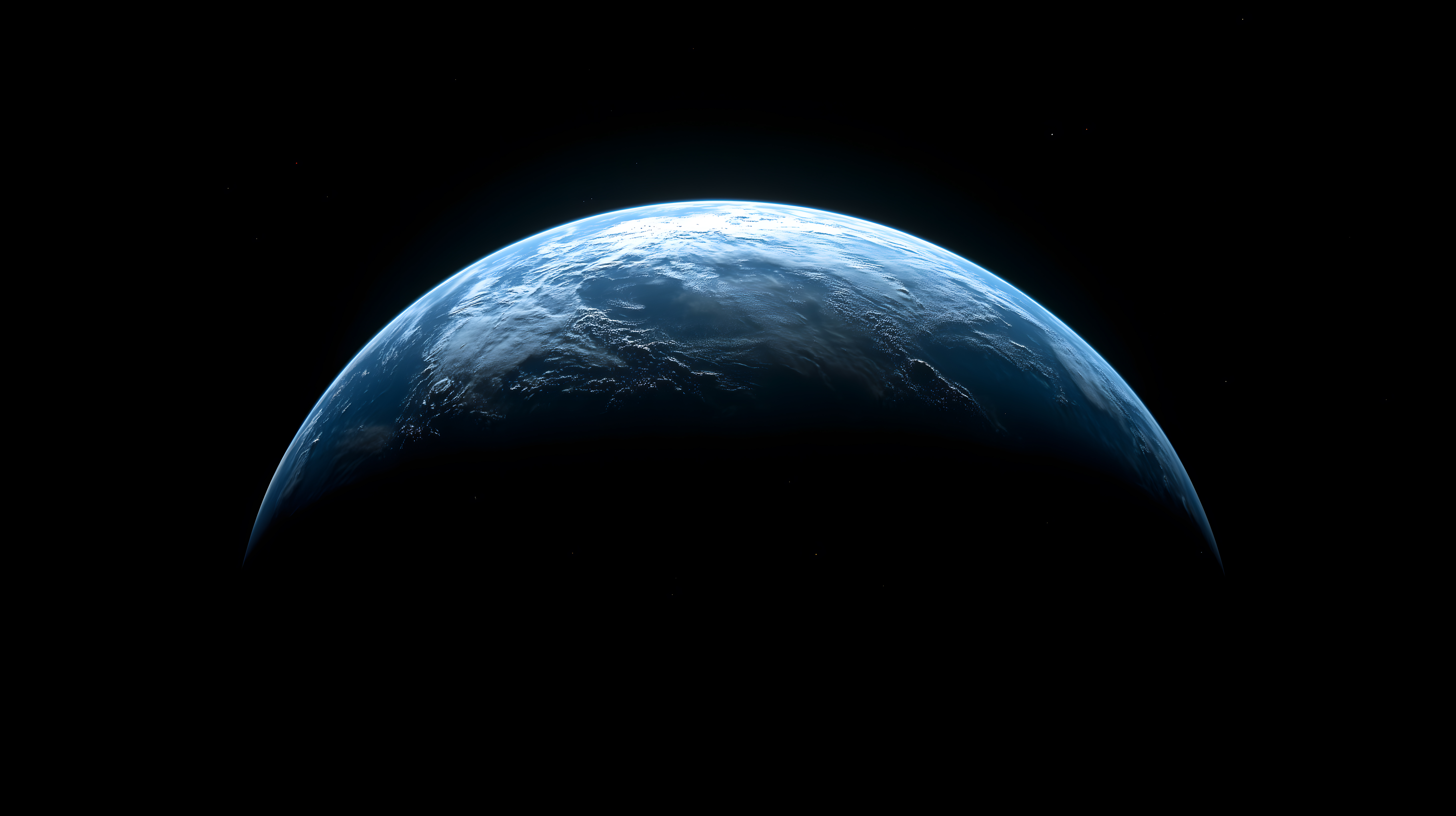 Das Bild zeigt eine atemberaubende Ansicht des Planeten Erde aus dem Weltraum. Die Erde erscheint als blauer, kugelfömiger Körper, umhüllt von einer schimmernden Atmosphäre. Deutlich sind die Umrisse der Kontinente und Ozeane zu erkennen, die sich in verschiedenen Blautönen und Strukturen präsentieren. Einzelne Wolkenformationen sind ebenfalls sichtbar, die das Gesamtbild dynamisch und lebendig erscheinen lassen.
