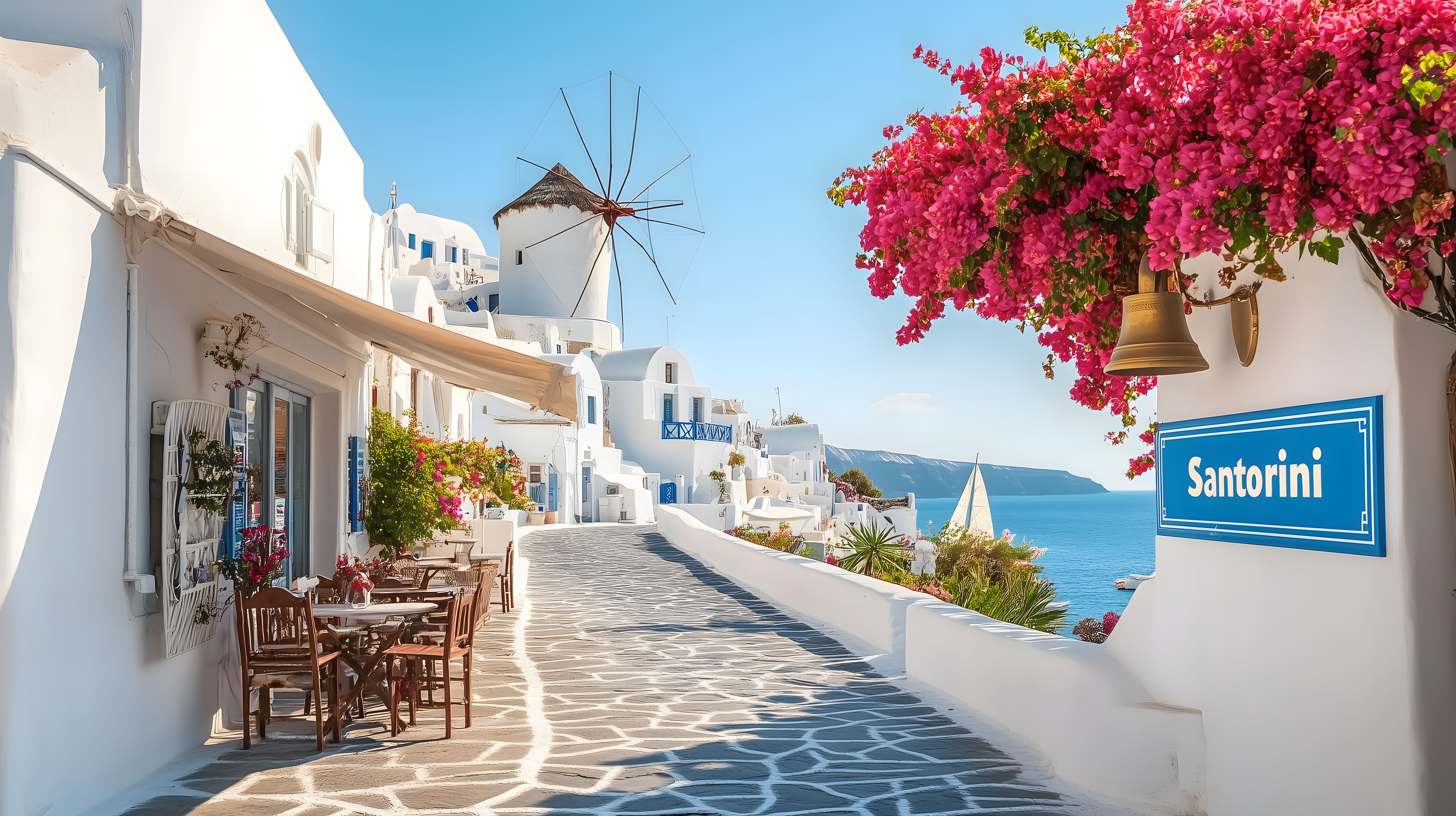 Dieses malerische Foto zeigt ein typisches Dorf auf der griechischen Insel Santorini. Die engen, gewundenen Gassen sind gesäumt von weiß getünchten Häuschen, deren Dächer in leuchtendem Blau schimmern. Eine traditionelle Windmühle ragt in den strahlend blauen Himmel. Üppige, rote Bougainvillea-Blüten ranken sich an den Häuserfassaden empor und verleihen der Szene einen mediterranen, romantischen Charakter. Die Perspektive führt den Betrachter entlang der idyllischen Straße, vorbei an Cafés und kleinen Läden, mit Blick auf das tiefblaue Ägäische Meer am Horizont. Dieses kostenfrei nutzbare Stockfoto in hoher Auflösung ist ideal für den Einsatz in Blogs, Social Media, Werbematerialien oder Reiseportalen, um eine Urlaubsstimmung zu vermitteln und Reiselust zu wecken.