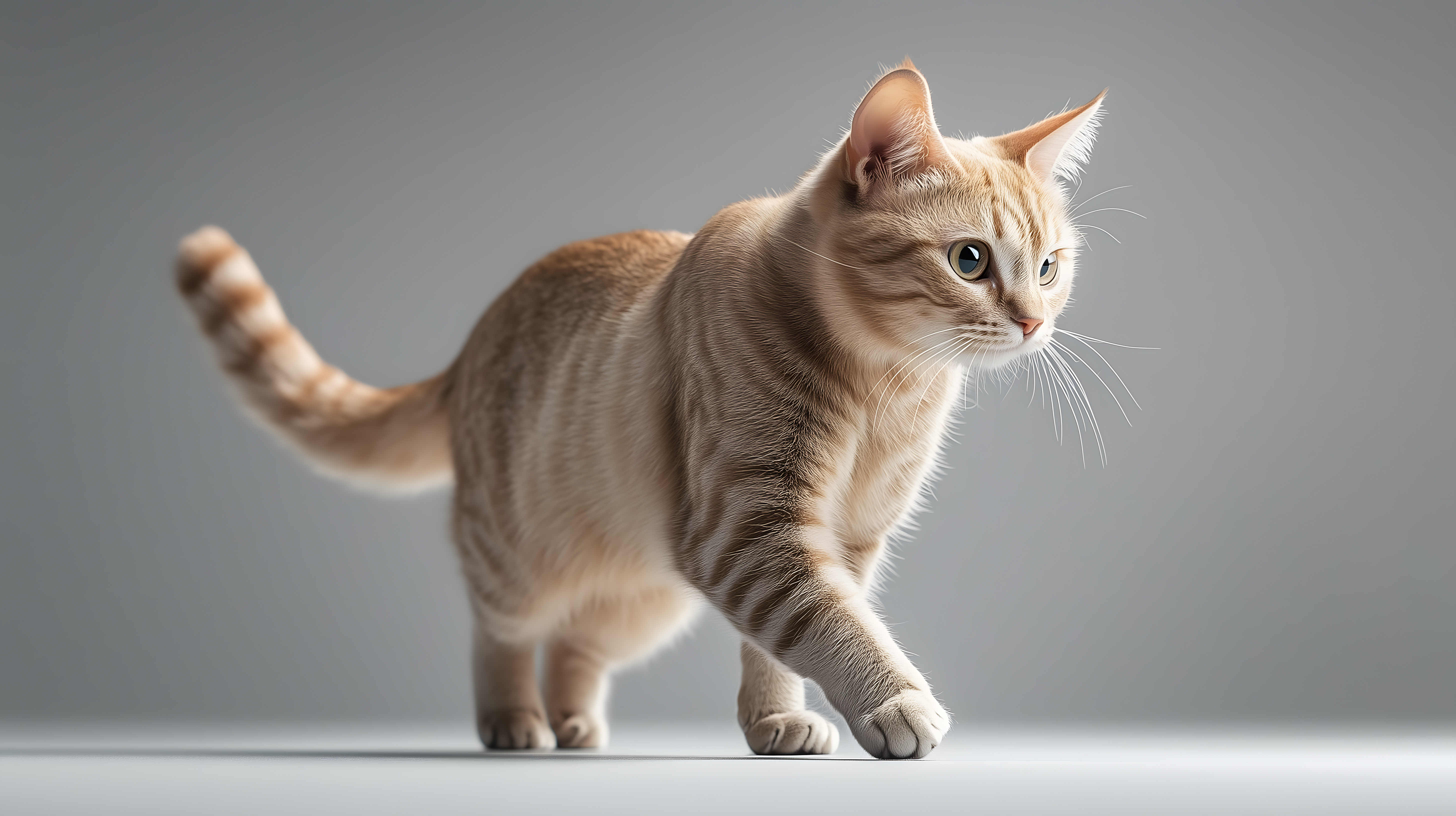 Das Bild zeigt eine beige getigerte Hauskatze, die vor einem neutralen grauen Hintergrund in einer minimalistischen Umgebung posiert. Die Katze blickt direkt in die Kamera, ihre Augen sind hell und wach und ihr Fell sieht weich und gepflegt aus. Die Komposition ist schlicht und konzentriert sich ganz auf das Tier, was den Fokus auf die Eleganz und Anmut der Katze lenkt. Dieses hochauflösende Stockfoto eignet sich perfekt für den Einsatz in Blogs, Newslettern, auf Social-Media-Kanälen oder in Werbekampagnen rund um Haustiere, Mode und Lifestyle. Es ist unter der Creative-Commons-Lizenz frei nutzbar.