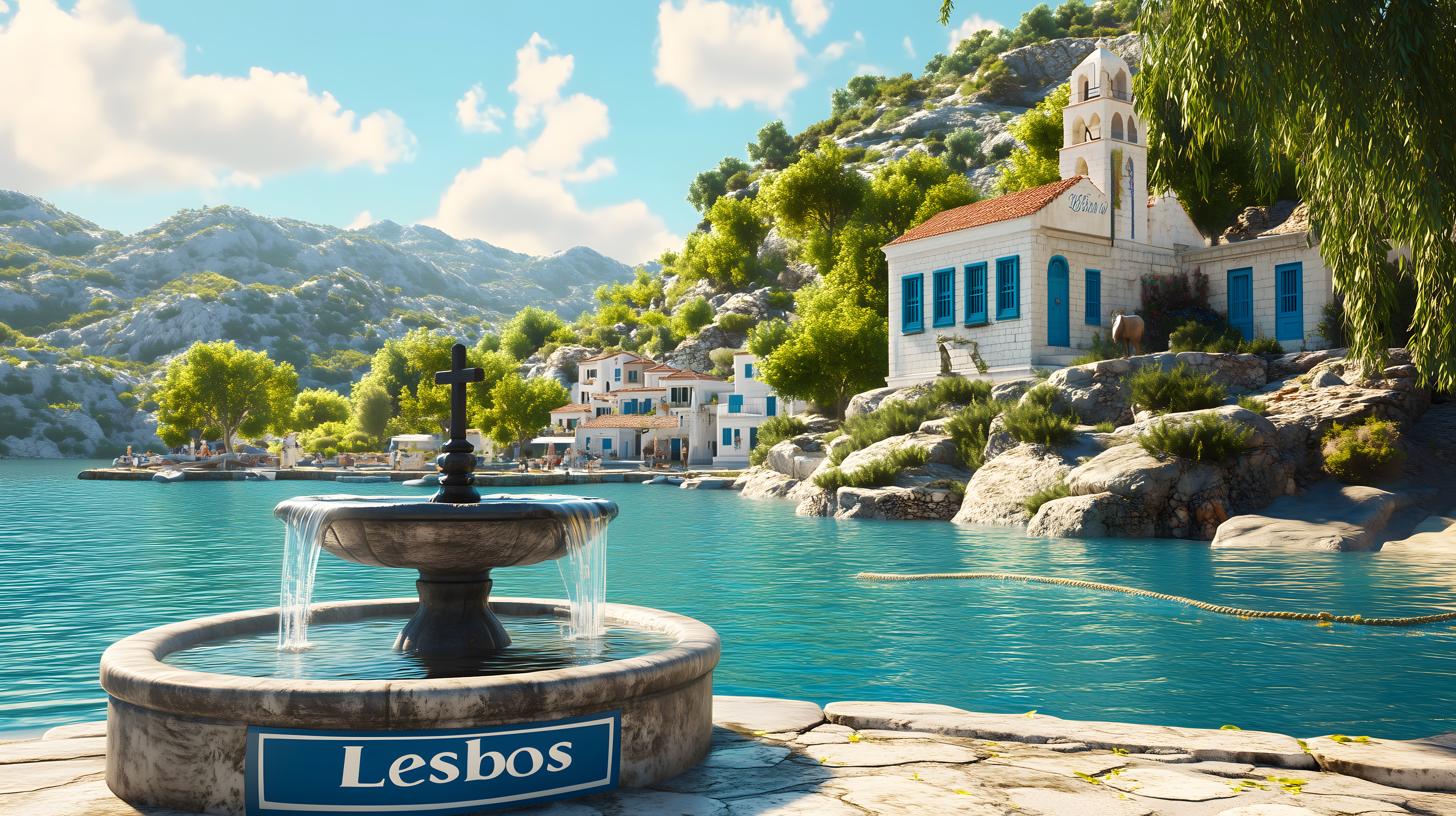 Dieses idyllische Foto zeigt ein malerisches Dorf auf der griechischen Insel Lesbos. Der Blick fällt auf eine bunte Häuserzeile mit typisch griechischer Architektur, die sich entlang der Strandpromenade erstreckt. Im Vordergrund befindet sich ein Brunnen, dessen Wasser sanft in ein Becken fließt. Dahinter ragen grüne Berge empor, die den Ort umrahmen. Der blaue Himmel mit weißen Wolken spiegelt sich im türkisfarbenen Meer wider, das den Ort säumt. Insgesamt vermittelt das Bild eine friedliche, entspannte Atmosphäre und lädt dazu ein, in die Schönheit und Ruhe des griechischen Insellebens einzutauchen. Das hochauflösende, kostenlose Stockfoto eignet sich hervorragend für Reiseblogs, Ferienwerbung oder Social-Media-Postings rund um Griechenland und die Mittelmeerregion.