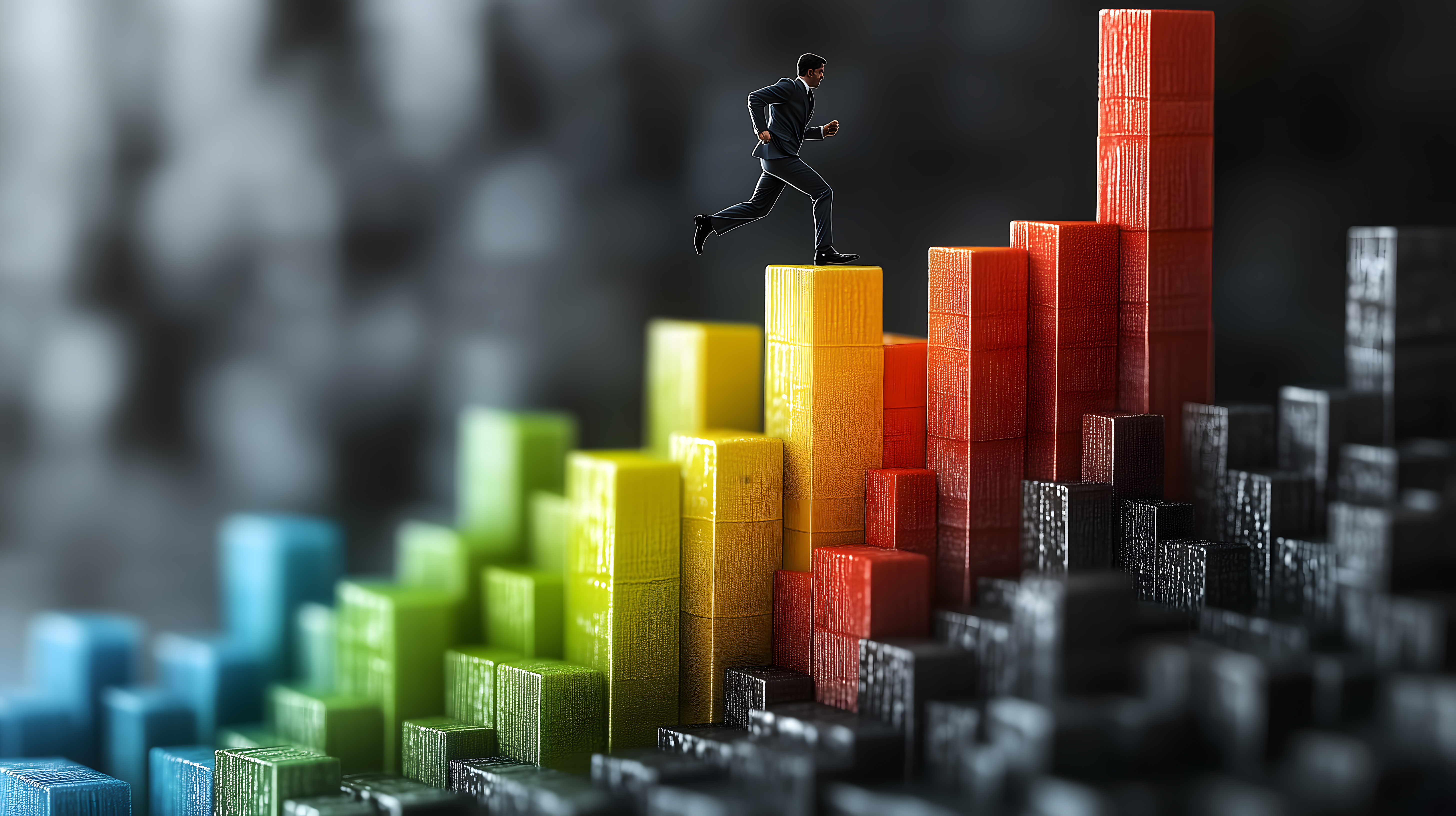 Dieses eindrucksvolle Foto zeigt einen Geschäftsmann, der zielstrebig auf einem bunten 3D-Balkendiagramm nach oben läuft. Die Farbgestaltung der verschiedenen Säulen ist auffällig und symbolisiert unterschiedliche Wachstumsphasen oder Geschäftsbereiche. Das Bild vermittelt Motivation, Dynamik und Erfolgsstrebigkeit - perfekt geeignet für den Einsatz in Unternehmensberichten, Präsentationen zur Führungskräfteentwicklung oder Werbematerial rund um das Thema Unternehmenserfolg. Als hochwertiges, kostenloses Stockfoto in kreativer Bildsprache lässt sich das Foto vielfältig in Blogs, Newslettern oder Social-Media-Kanälen einsetzen.