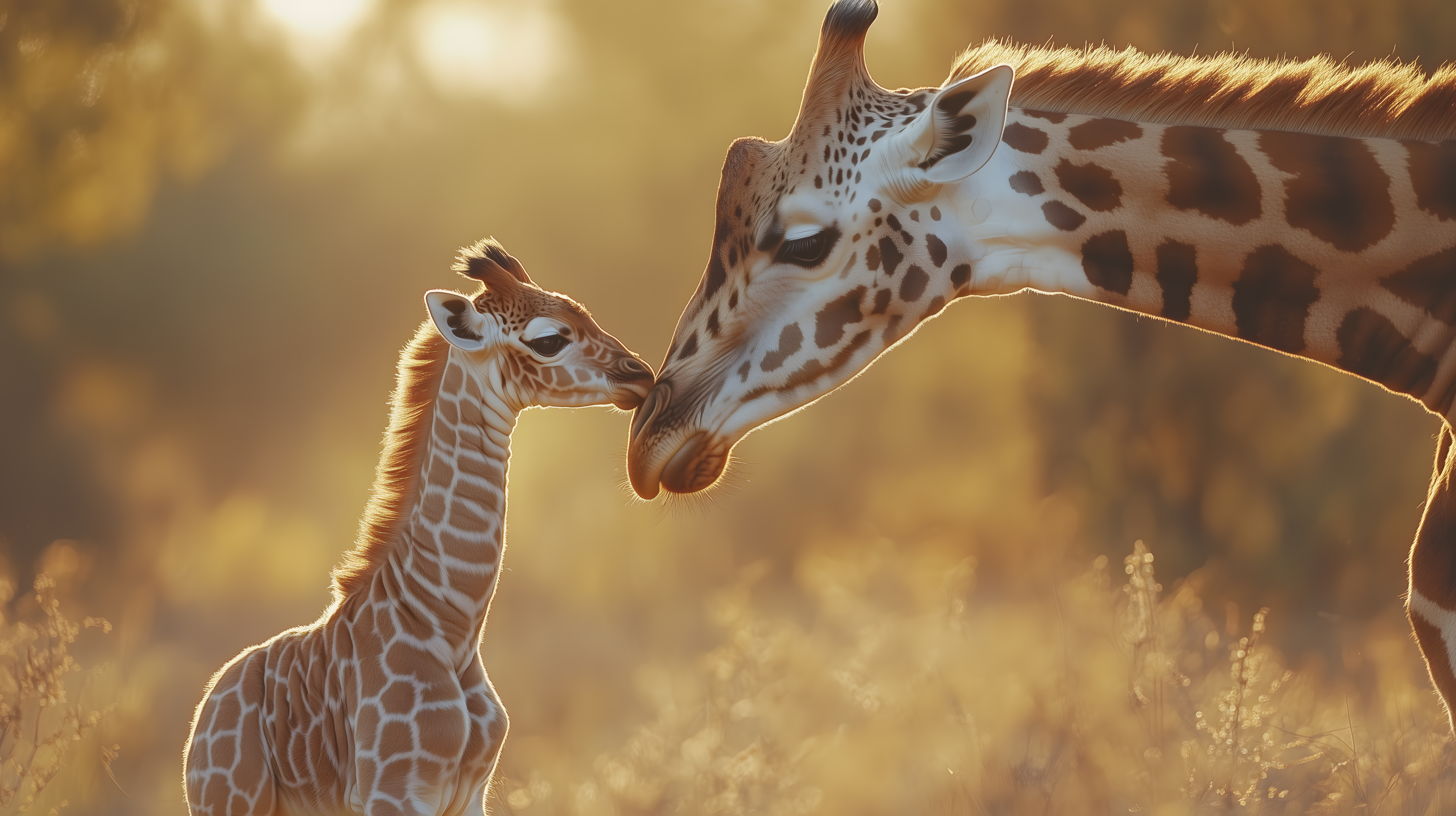 Dieses atemberaubende Foto zeigt eine liebevolle Giraffen-Mutter, die ihr Junges zärtlich berührt. Die Szene spielt sich vor einem malerischen Sonnenuntergang in der afrikanischen Savanne ab, was dem Bild eine warme, stimmungsvolle Atmosphäre verleiht. Die detailreichen Strukturen des Giraffen-Fells und die sanften Konturen der beiden Tiere schaffen eine harmonische Komposition, die den Betrachter in die Ruhe und Schönheit der Natur eintauchen lässt.