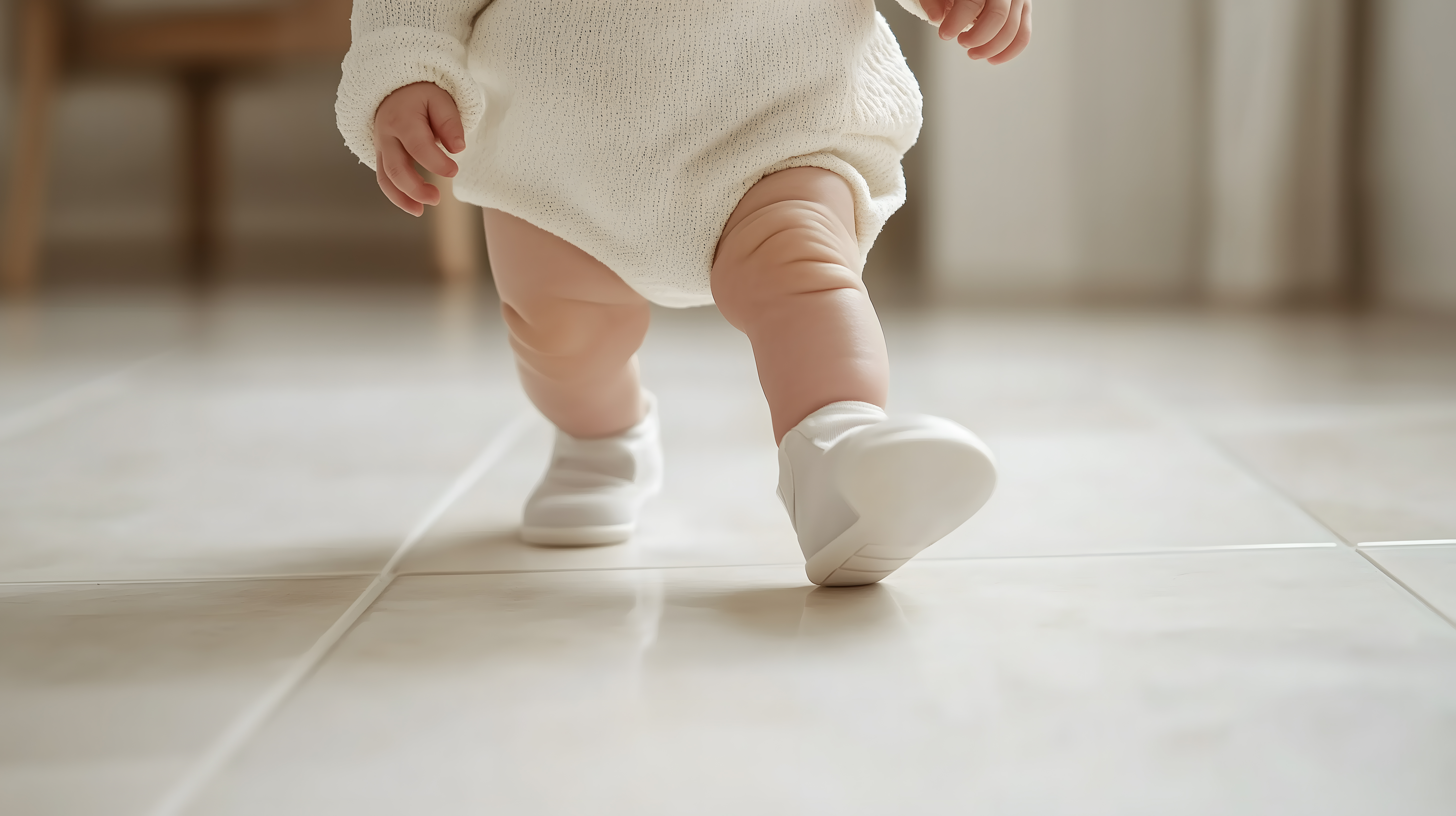 Das Foto zeigt einen Ausschnitt eines Säuglings oder Kleinkindes, das seine ersten selbstständigen Schritte auf einem hellen, fliesen Boden macht. Der Fokus liegt auf den kleinen, mit weißen Socken bekleideten Füßen, die sich langsam und vorsichtig vorwärts bewegen. Das Bild strahlt eine Stimmung der Freude, Neugierde und des Stolzes aus, die oft mit diesem Meilenstein in der frühen Kindheit verbunden sind. Es eignet sich hervorragend als kostenloses Stockfoto für Blogbeiträge, Newsletter oder Social-Media-Posts rund um das Thema Babyentwicklung, Elternschaft und Familienfreundlichkeit. Die hochauflösende Qualität und Creative-Commons-Lizenz ermöglichen eine vielseitige und rechtssichere Verwendung.