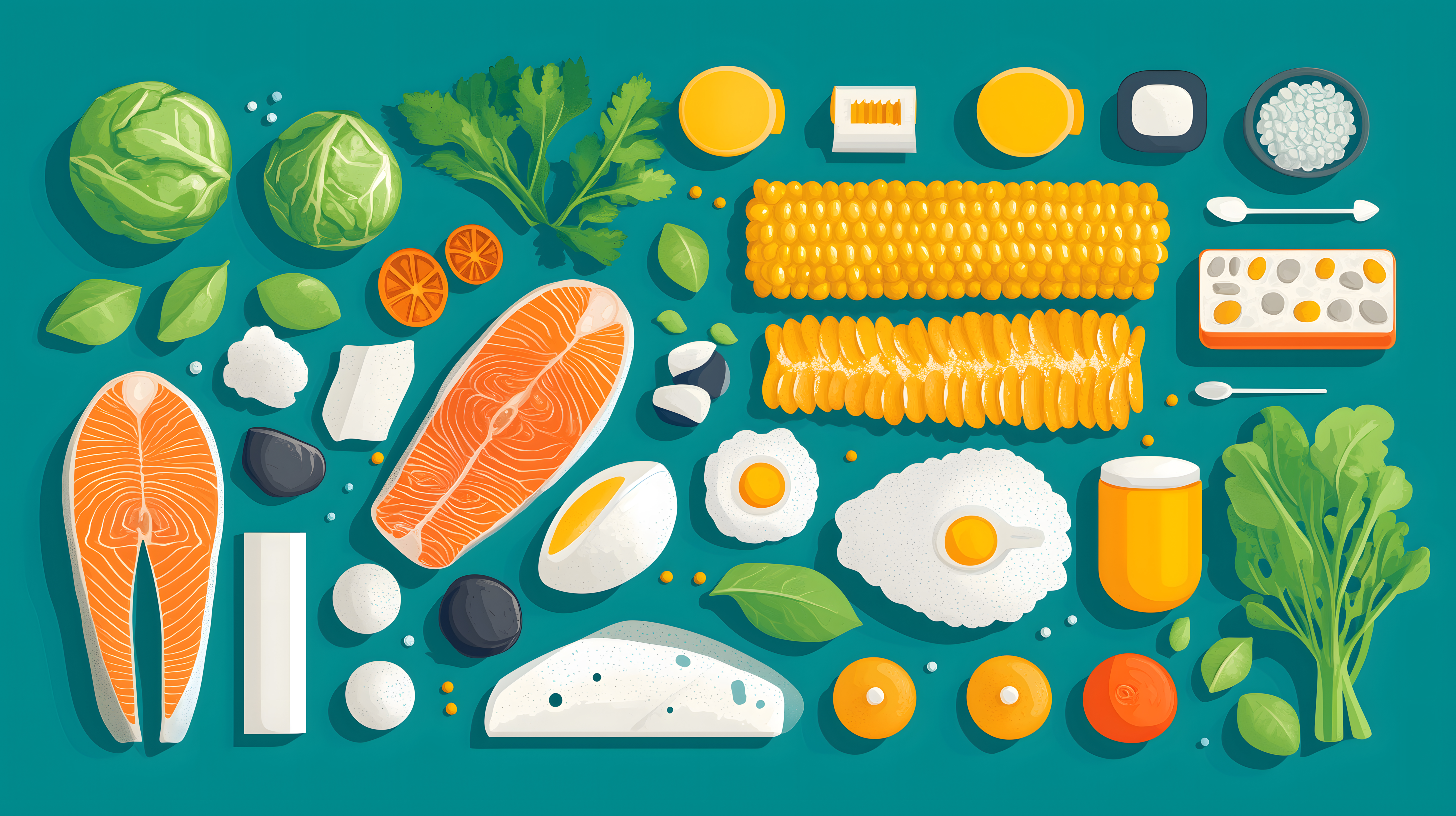 Diese bunte Illustration zeigt eine Vielzahl an vitaminreichen Lebensmitteln für eine gesunde, ausgewogene Ernährung. Zu sehen sind frisches Gemüse wie Kohl, Salat und Zitrusfrüchte, dazu fettarmer Fisch, Eier und verschiedene Gewürze. Die hochwertige Vektorillustration eignet sich perfekt als kostenloses Stockfoto für Fitness-, Gesundheits- und Ernährungsthemen auf Blogs, in Newslettern oder für Social-Media-Kampagnen. Die Datei liegt in hoher Auflösung vor und steht unter einer Creative-Commons-Lizenz zur freien Verwendung zur Verfügung.