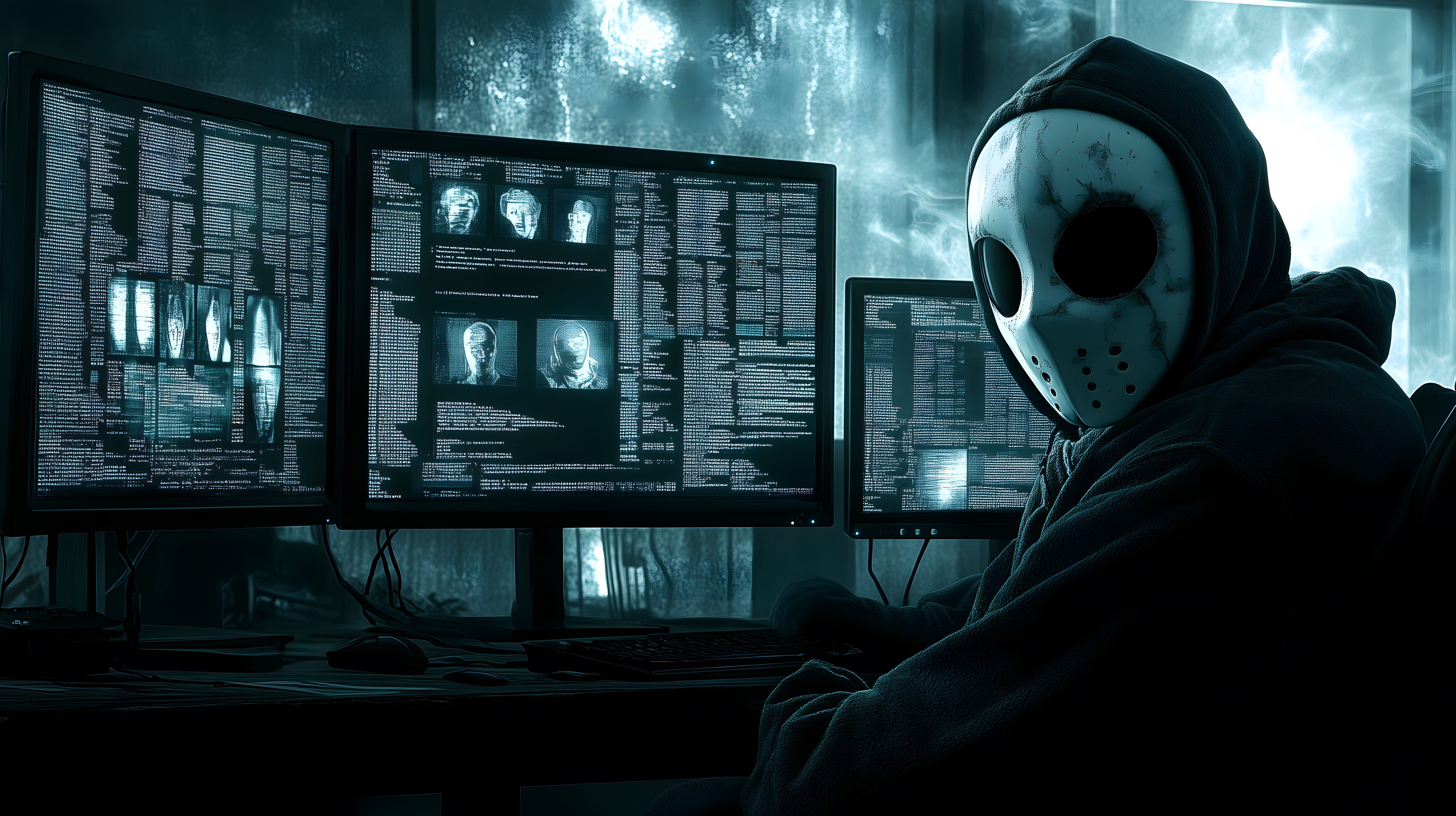 Das Foto zeigt einen maskierten Hacker, der vor mehreren Computerbildschirmen sitzt, auf denen Codes und Daten zu sehen sind. Die düstere, grünlich beleuchtete Szenerie vermittelt eine Atmosphäre von Überwachung und digitaler Sicherheitsbedrohung. Das Bild eignet sich gut für Beiträge zu Themen wie Cyberkriminalität, Datenschutz, IT-Sicherheit und digitale Anonymität. Als kostenloses Stockfoto in hoher Auflösung und unter einer Creative-Commons-Lizenz ist es flexibel einsetzbar, etwa für Blogbeiträge, Newsletter-Grafiken oder Social-Media-Posts.