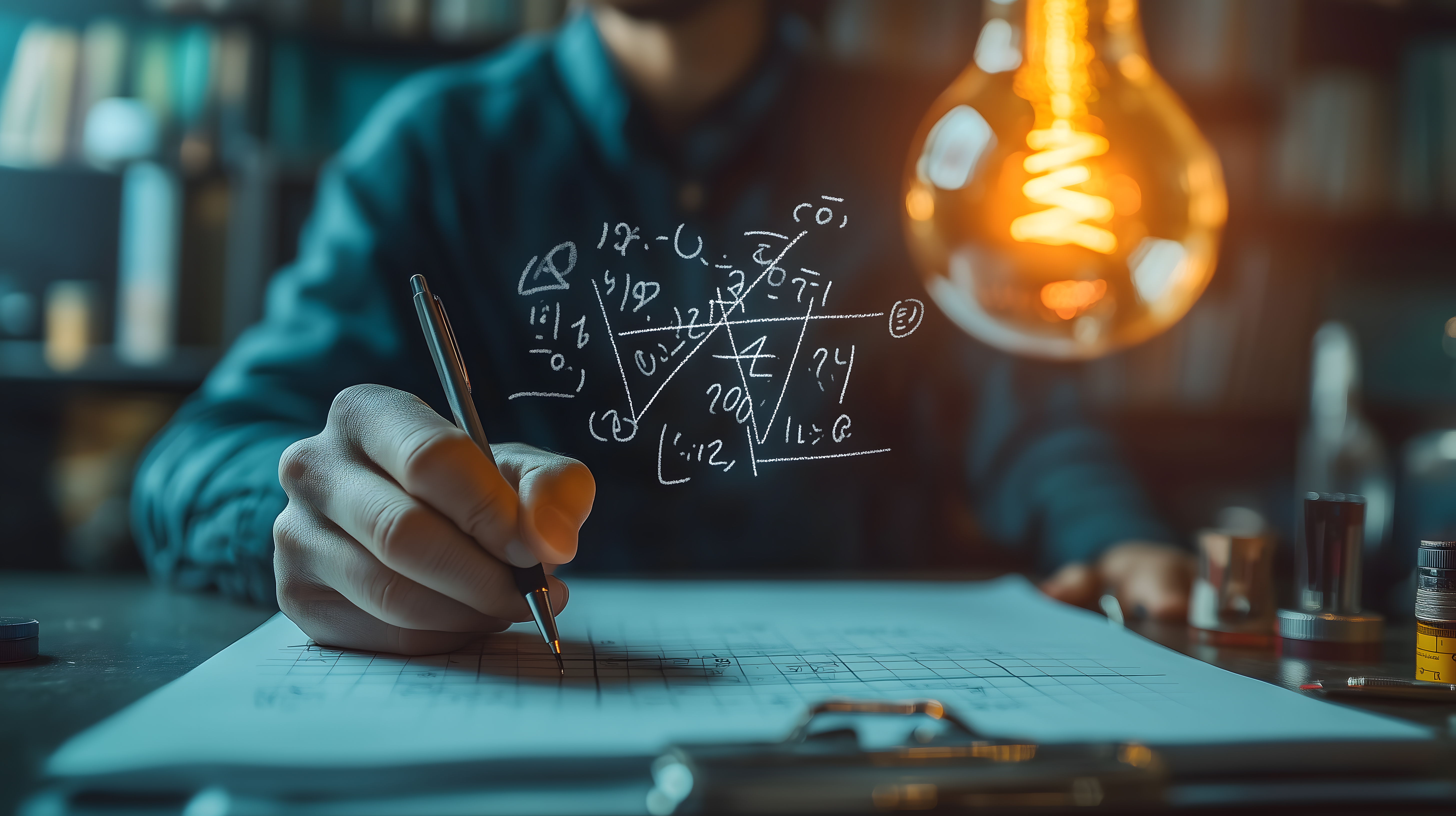Dieses Foto zeigt einen Wissenschaftler, der konzentriert an einer komplizierten mathematischen Formel arbeitet. Der Raum ist düster beleuchtet, was eine nachdenkliche und intensive Atmosphäre schafft. Die Nahaufnahme legt den Fokus auf die Hände des Experten, die einen Stift halten und eifrig Notizen auf einem Blatt Papier machen. Eine Glühbirne über dem Arbeitsplatz sorgt für zusätzliches Licht und verleiht dem Bild einen kreativen, beinahe künstlerischen Charakter. Dieses kostenlose Stockfoto in hoher Auflösung unter Creative-Commons-Lizenz eignet sich hervorragend für Beiträge in Blogs, Newsletter oder Social-Media-Kanäle zu Themen wie Wissenschaft, Forschung, Technologie oder Problemlösung.