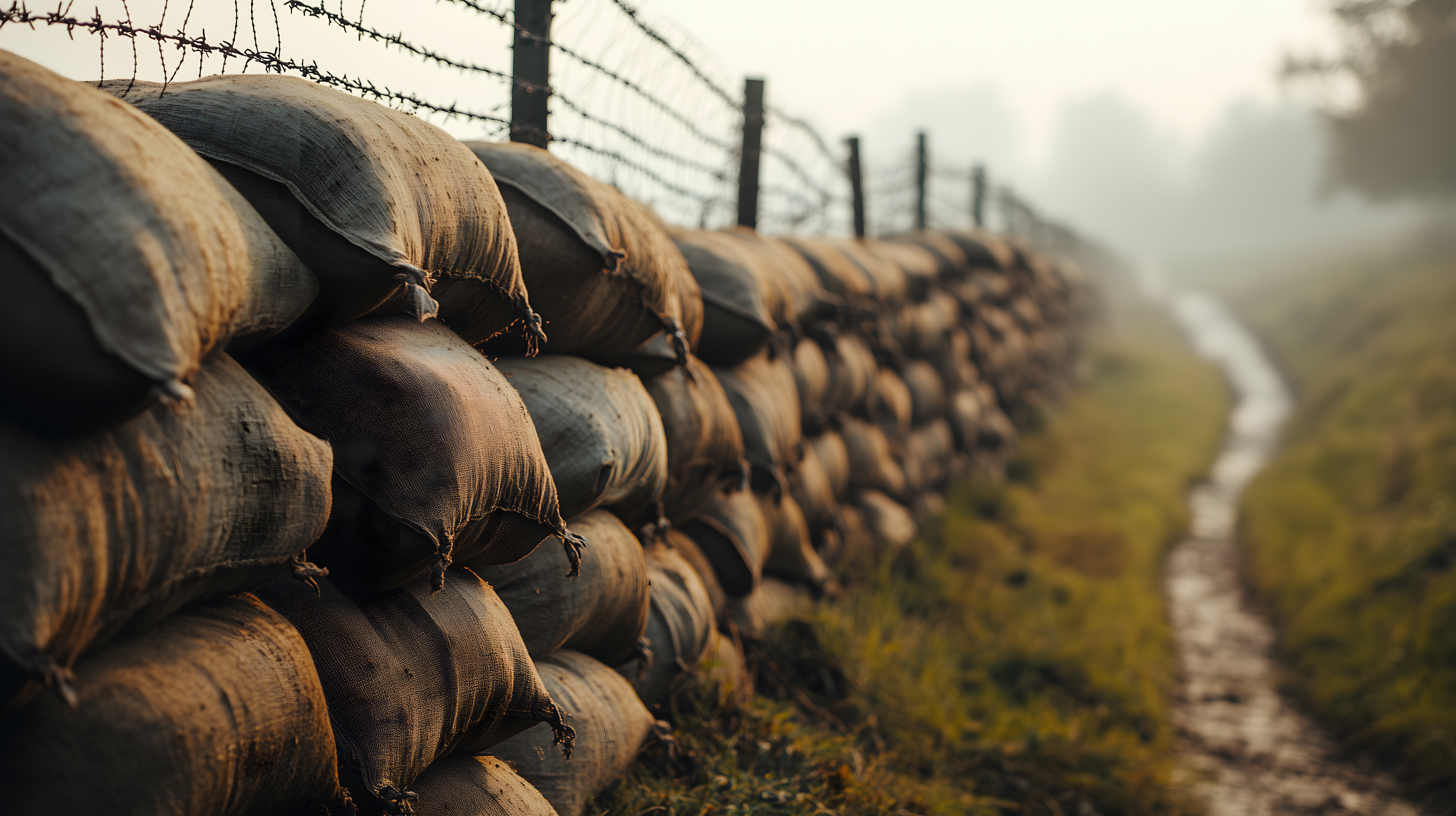 Das Bild zeigt eine alte Verteidigungsanlage, die mit Stacheldraht und Sandsäcken befestigt ist. Die Anlage befindet sich in einer ländlichen Umgebung, umgeben von Feldern und einem Nebelschleier. Der Fokus liegt auf der Textur und Struktur der Verteidigungsvorrichtungen, die in Grautönen und Brauntönen gehalten sind und einen düsteren, historischen Eindruck vermitteln. Dieses Bild eignet sich hervorragend als Hintergrund oder Gestaltungselement für Beiträge zu Themen wie Krieg, Militär, Sicherheit oder historische Ereignisse. Es ist ein kostenloses, hochauflösendes Stockfoto, das unter einer Creative-Commons-Lizenz veröffentlicht wurde.
