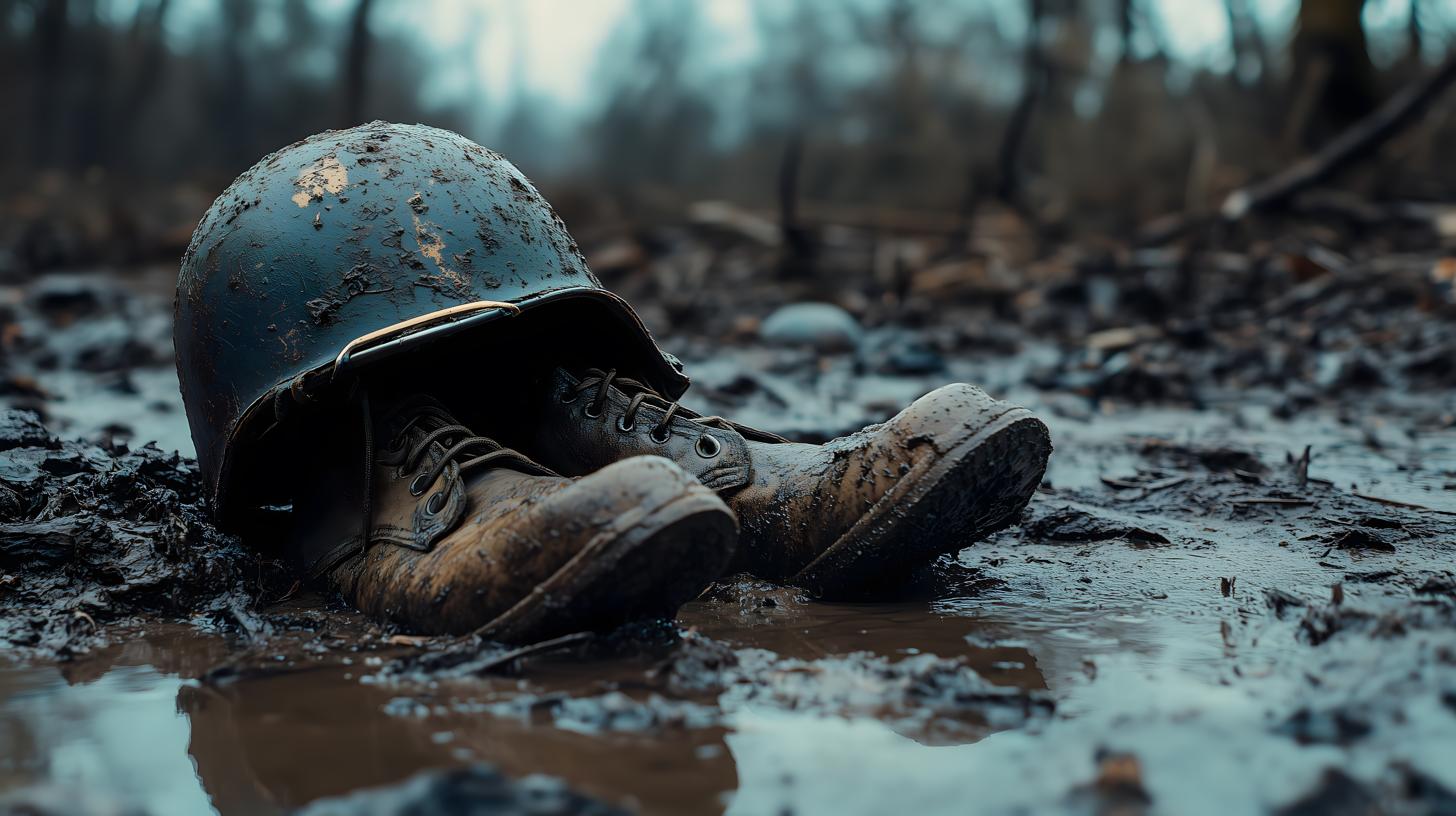 Dieses Foto zeigt die verlassene Ausrüstung eines Soldaten, die in einer zerstörten und morastigen Landschaft liegt. Der verrottete Helm und der schlammverschmierte Stiefel vermitteln ein Gefühl von Verlust, Trauer und der Brutalität des Krieges. Das Bild hat eine düstere, graue Farbpalette und eine dramatische, vintage-inspirierten Ästhetik, die perfekt für den Einsatz in Blogs, Newslettern, Social-Media-Beiträgen oder Werbematerial zu Themen wie Militärgeschichte, Konflikte oder die Auswirkungen von Kriegen geeignet ist. Dieses kostenlose Stockfoto in hoher Auflösung steht unter einer Creative-Commons-Lizenz zur Verfügung.