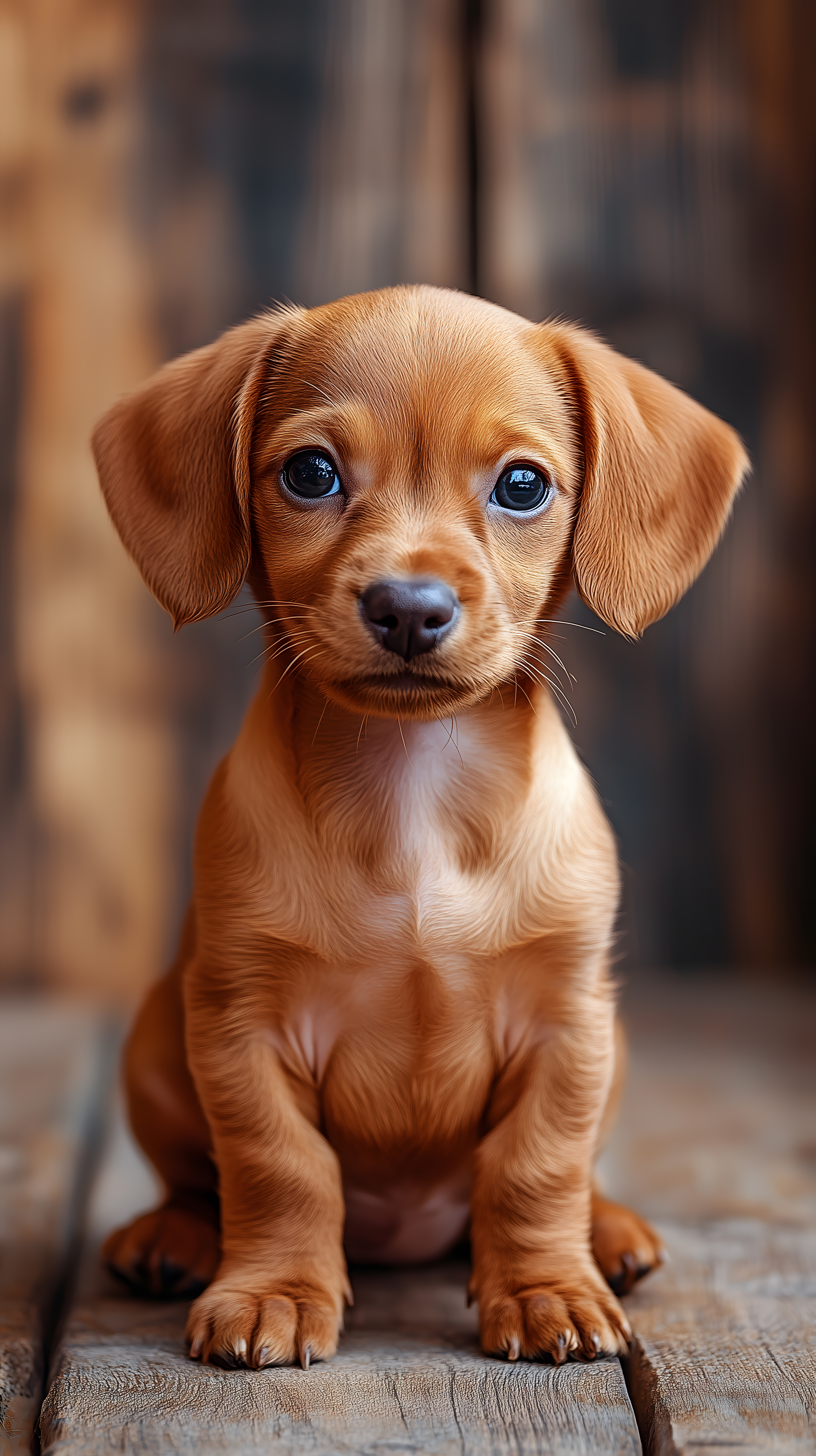 Das Bild zeigt einen kleinen, braunen Dackel-Welpen, der direkt in die Kamera schaut. Seine großen, blauen Augen und sein niedlicher, verletzlicher Ausdruck erwecken große Sympathie. Der Hintergrund besteht aus verwittertem, rustikalem Holz, was dem Bild einen natürlichen, ruhigen Rahmen verleiht. Dieses hochauflösende Foto eignet sich hervorragend für den Einsatz in Blogs, Newslettern, sozialen Medien oder Werbematerialien rund um das Thema Haustiere, Familien und Naturliebhaber. Als kostenloses Stockfoto unter Creative-Commons-Lizenz ist es frei für private und kommerzielle Zwecke nutzbar.