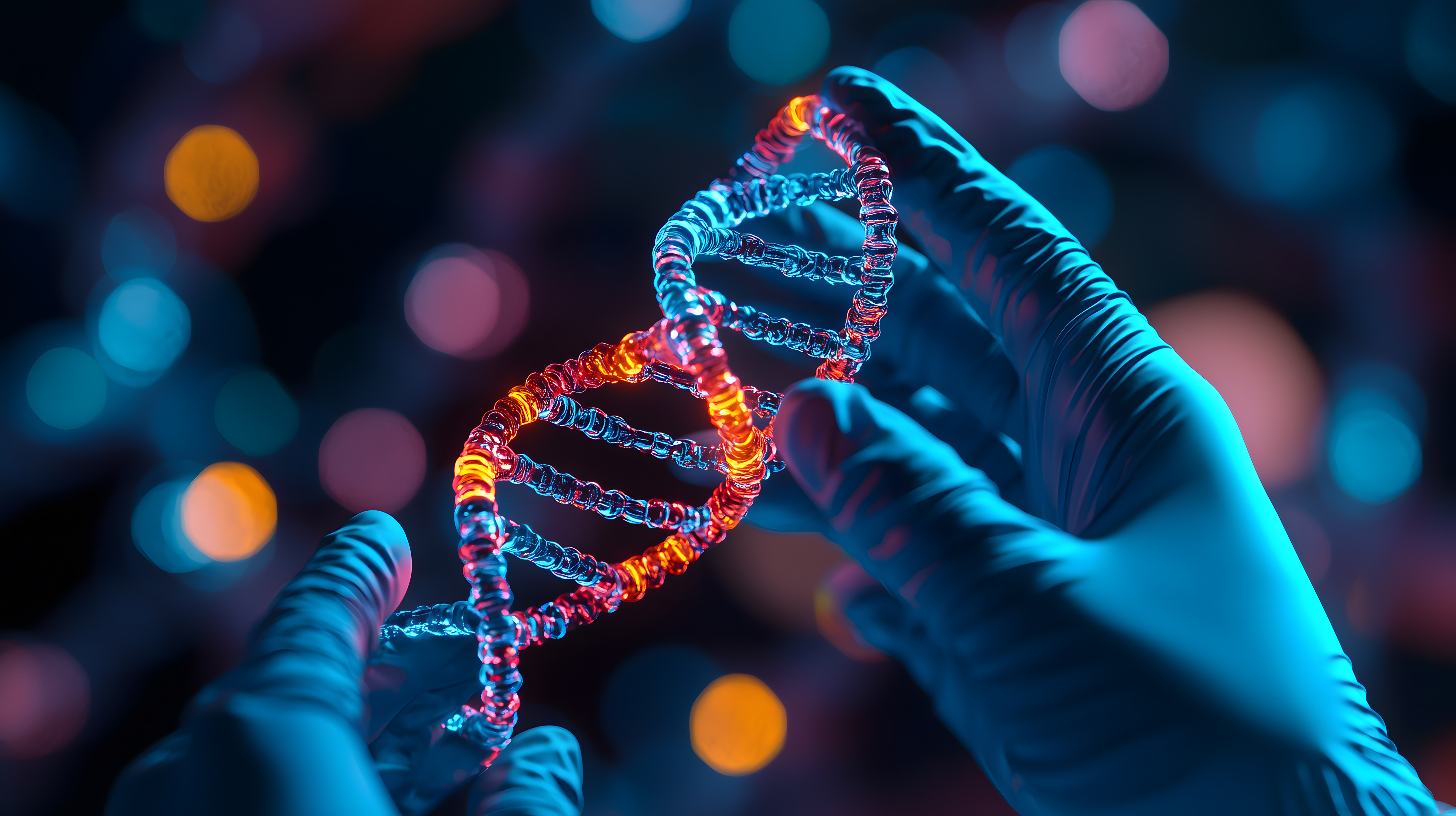 Dieses faszinierende Bild zeigt eine DNA-Struktur, die von wissenschaftlichen Händen in Gummihandschuhen gehalten wird. Die Molekülstruktur leuchtet in kräftigen Farben wie Orange und Blau vor einem unscharfen, bunten Hintergrund. Diese digitale Illustration vermittelt einen Eindruck von Forschung, Technologie und Innovation im Bereich der Molekularbiologie und Genetik. Das Foto eignet sich hervorragend als Stockfoto für Websites, Blogbeiträge oder Werbematerial im Wissenschafts- und Medizinsektor. Es ist in hoher Auflösung und unter einer Creative-Commons-Lizenz verfügbar.