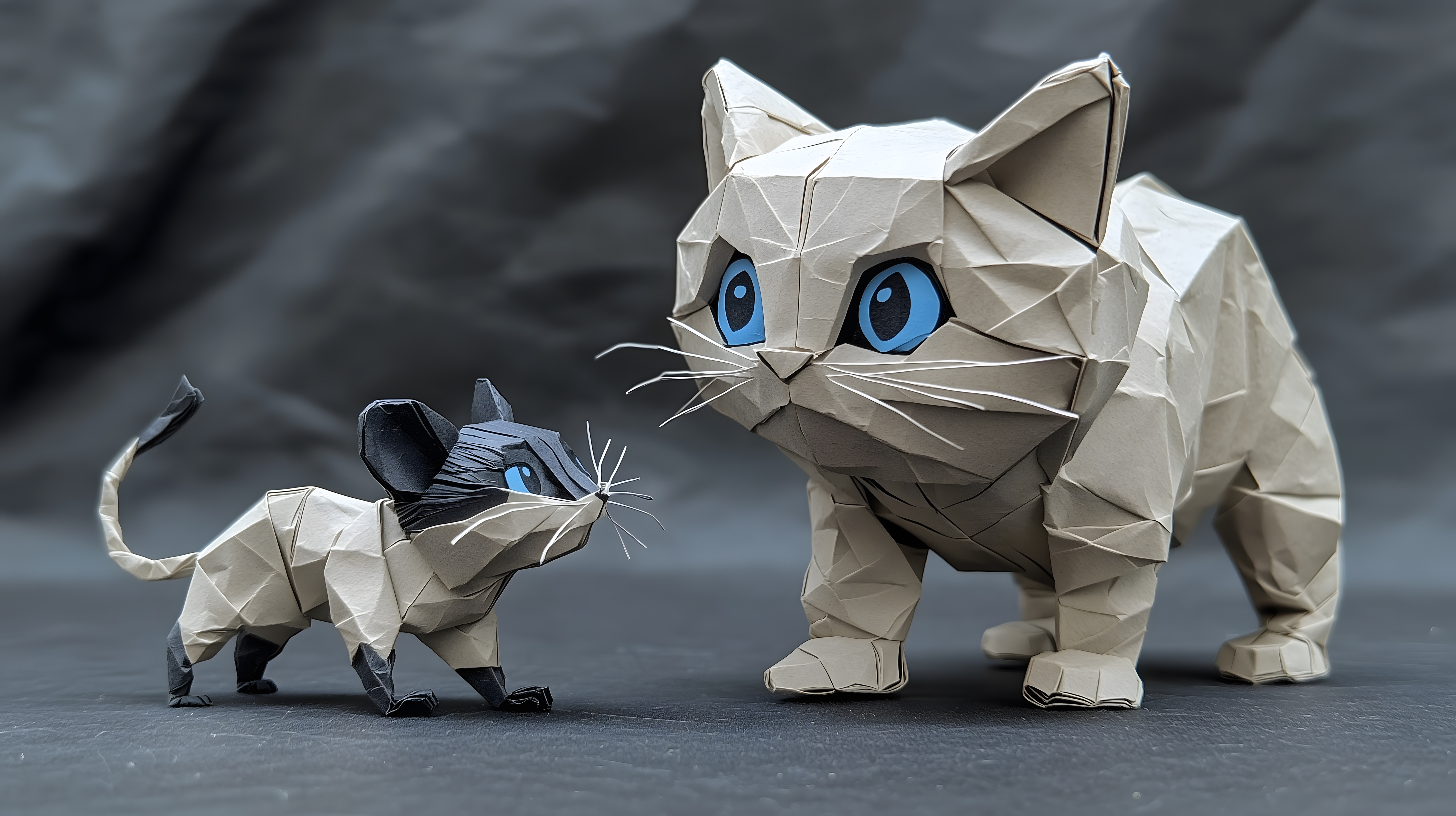 Das Bild zeigt zwei zerknitterte Origami-Figuren in Form einer Katze und einer Maus auf einem dunklen Hintergrund. Die Tiere sind detailreich mit klar erkennbaren Gesichtszügen und Gliedmaßen dargestellt. Durch die kontrastreiche Farbgebung in Grau- und Blautönen sowie die abstrakte, geometrische Formgebung entsteht ein minimalistisch-modernes Stillleben. Dieses ungewöhnliche Motiv eignet sich hervorragend als kostenloses Stockfoto für kreative Blogbeiträge, Newsletter und Social-Media-Postings in den Bereichen Grafik, Design, Kunst und Handwerk. Die hochauflösende Datei steht unter einer Creative-Commons-Lizenz zur Verfügung.