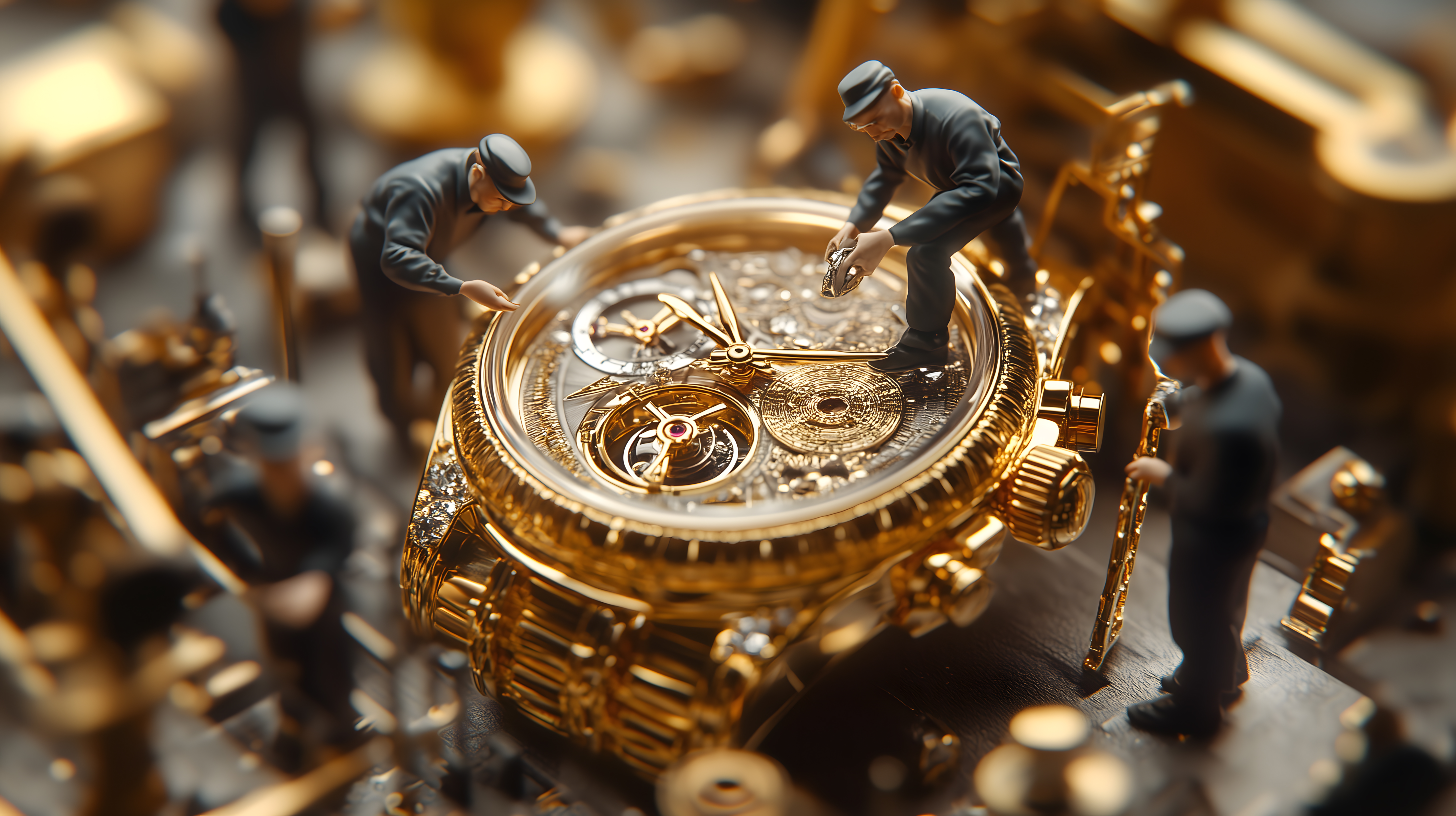 Das Foto zeigt eine präzise Detailaufnahme einer goldenen Luxus-Armbanduhr. Zu sehen sind mehrere Miniatur-Handwerker, die in akribischer Feinarbeit an den verschiedenen Mechanikteilen der Uhr arbeiten. Die Nahaufnahme lässt die filigranen Zahnräder, Schrauben und Federn der hochwertigen Uhr in all ihrer Komplexität und Perfektion erkennen. Die glänzenden Goldtöne, die sanfte Beleuchtung und der unscharfe Hintergrund verleihen dem Bild eine zeitlose, elegante Atmosphäre. Dieses Stockfoto in hoher Auflösung eignet sich hervorragend für die Verwendung in Blogs, Werbematerialien oder Social-Media-Kanälen im Bereich Luxus, Technik, Handwerkskunst und Uhrmacherei. Es steht unter einer Creative-Commons-Lizenz zur freien Nutzung zur Verfügung.