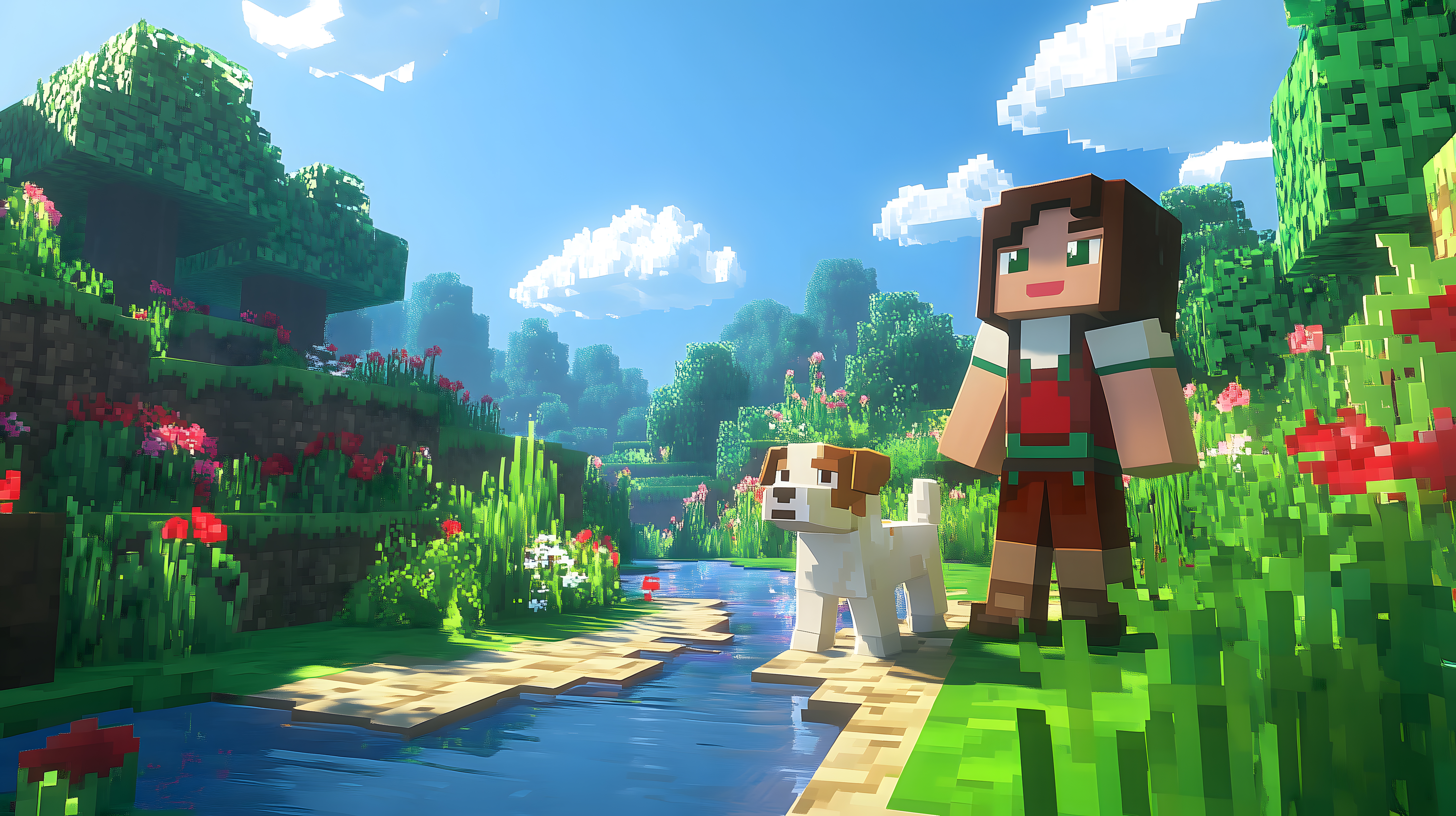 Dieses malerische Stockfoto zeigt einen Minecraft-Charakter, der mit seinem treuen Hund durch eine üppig grüne, detailreiche Landschaft am Ufer eines Flusses spaziert. Die bunte, pixelige Darstellung erzeugt eine charmante, fantasievolle Atmosphäre, die ideal für Illustrationen, Grafiken oder Hintergründe in Spielen, Blogs, Newslettern oder Social-Media-Beiträgen geeignet ist. Als kostenloses, hochauflösendes Stockfoto unter Creative-Commons-Lizenz eignet es sich perfekt für kreative Projekte jeder Art.