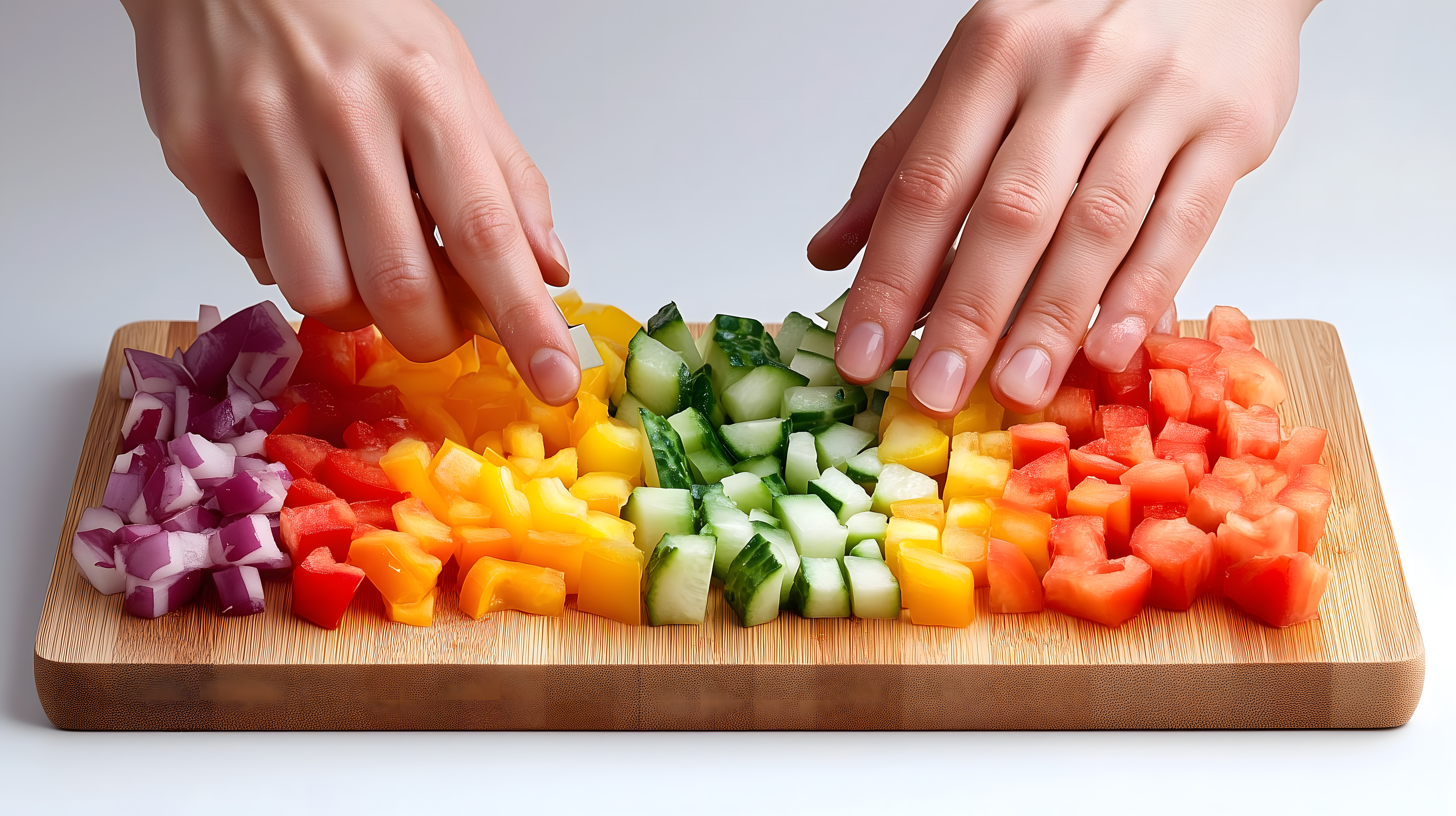 Dieses Foto zeigt eine Auswahl an frisch geschnittenem Gemüse auf einem Holzschneidebrett. Es ist in leuchtenden Farben angeordnet, darunter Paprika, Gurken, Tomaten und rote Zwiebeln. Die Hände einer Person sind zu sehen, die das Gemüse vorbereiten. Das Bild vermittelt einen gesunden und natürlichen Eindruck, ideal für Rezepte, Kochbücher, Werbung für Lebensmittel oder Social-Media-Beiträge zum Thema Ernährung. Als kostenloses Stockfoto in hoher Auflösung und unter einer Creative-Commons-Lizenz nutzbar.