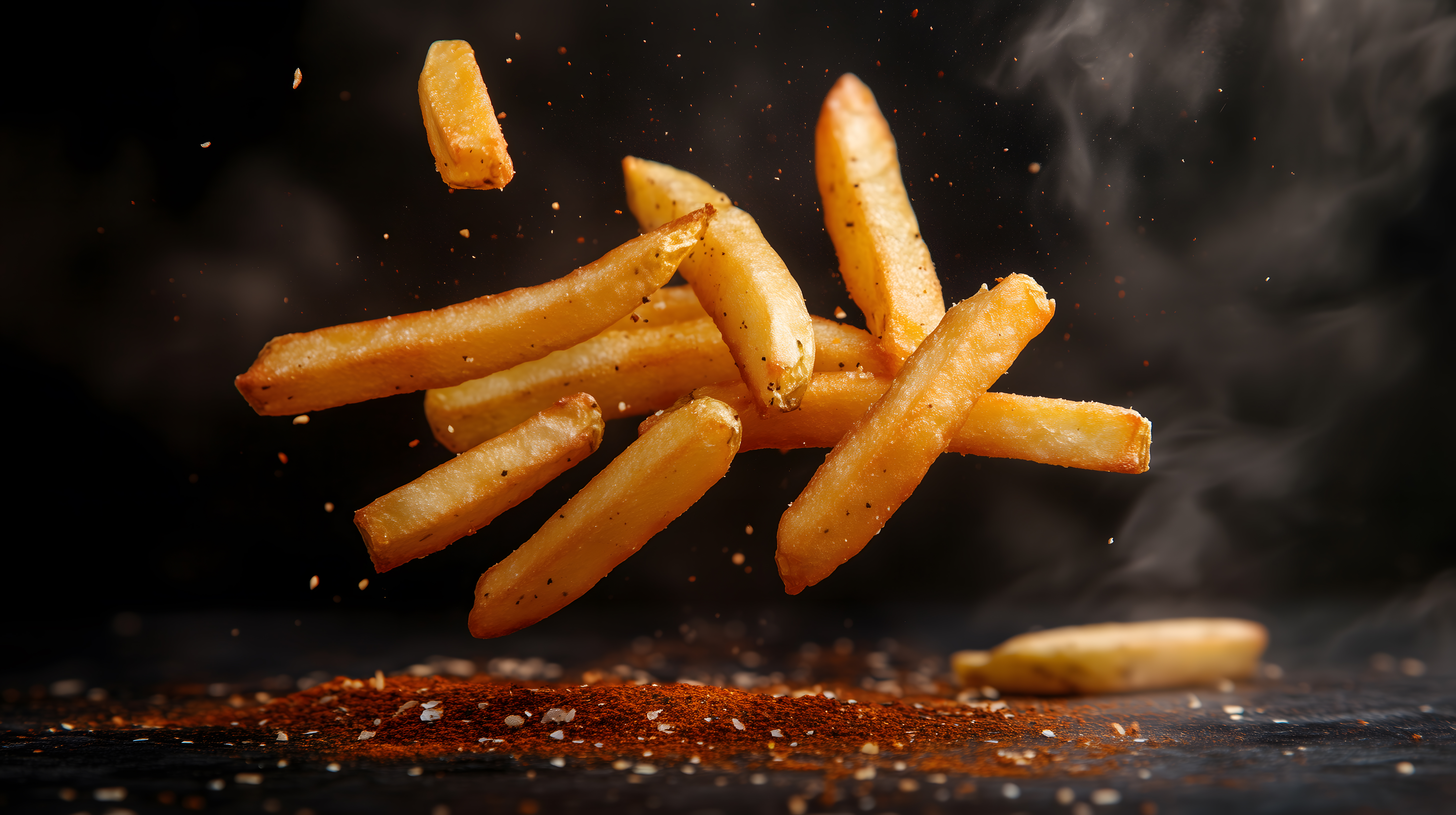 Dieses Foto zeigt eine Ansammlung knuspriger, frisch zubereiteter Pommes frites und gewürzter Kartoffelecken, die vor einem dunklen Hintergrund in der Luft schweben. Das Bild ist gekennzeichnet durch lebendige, warme Farbtöne und eine natürliche Beleuchtung, die den appetitlichen Charakter der Speise betont. Diese fotogene Komposition eignet sich hervorragend als kostenloses Stockfoto für verschiedene Einsatzzwecke, wie beispielsweise Foodblogs, Rezeptsammlungen, Social-Media-Posts oder Werbematerialien in hoher Auflösung und unter Creative-Commons-Lizenz.